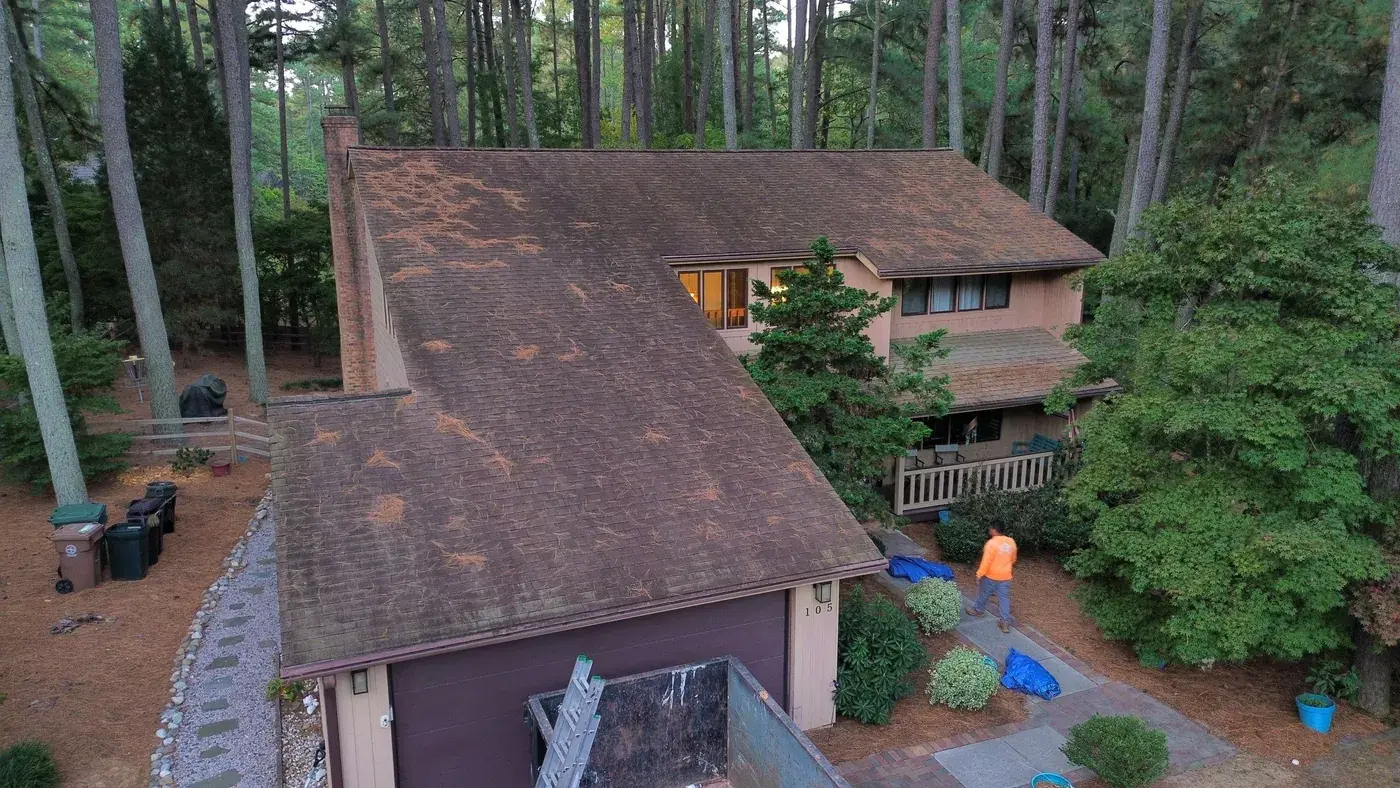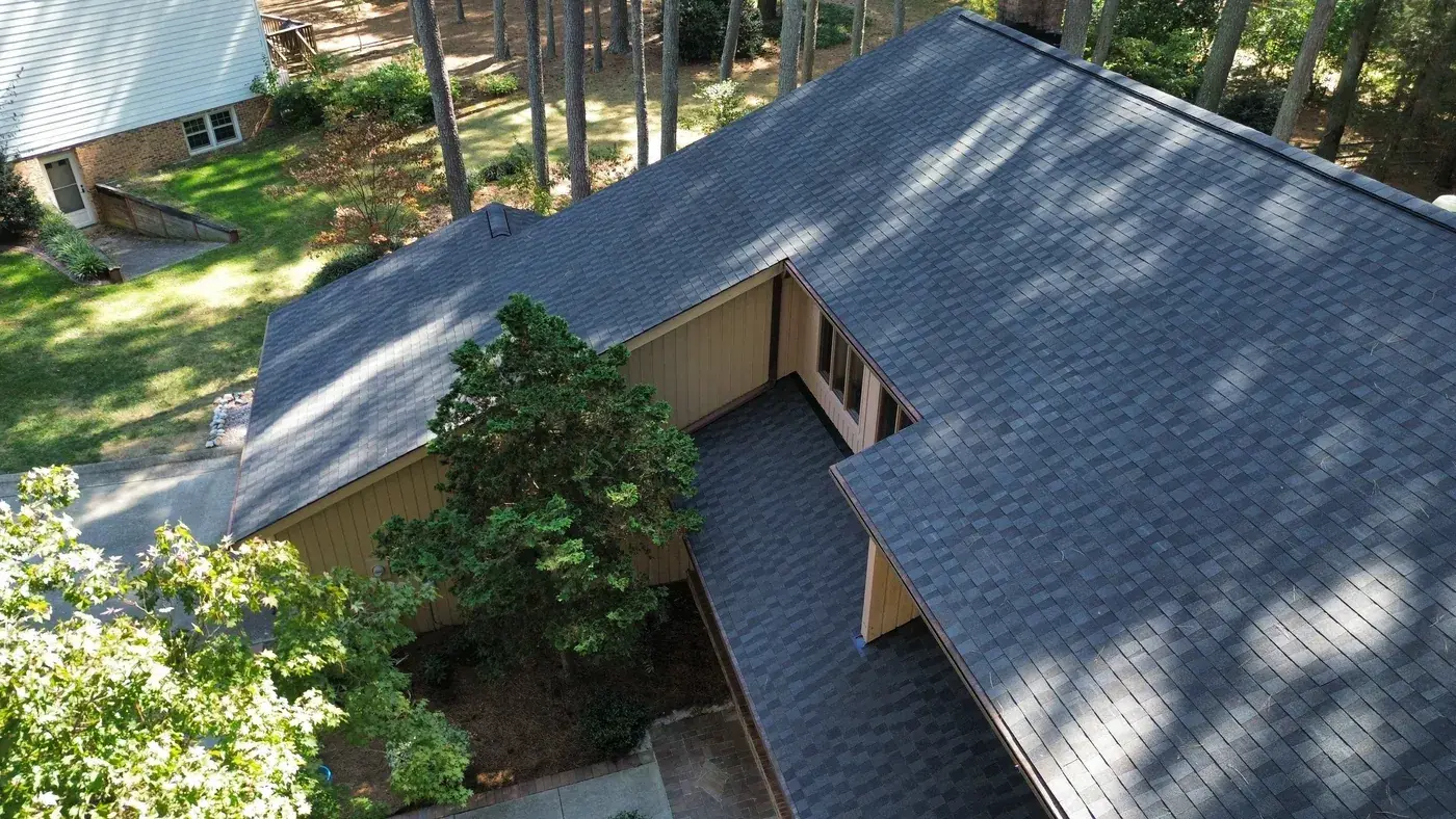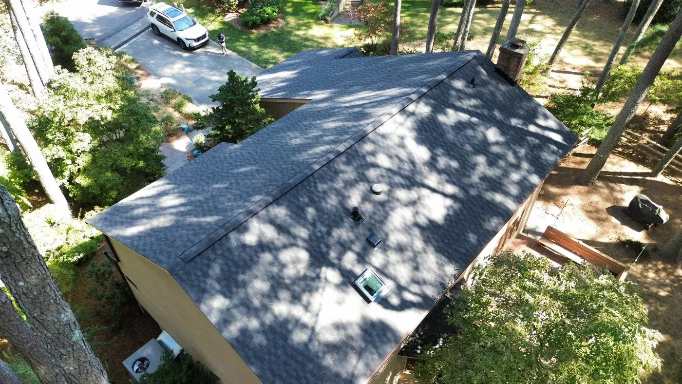 Abernathy Ct in Cary sits deep in a stand of tall pines, a chalet-style home with dark brown wood siding and an attached two-car garage anchoring the left side. With this much tree cover, drainage and ventilation matter, and we paid extra attention to both during prep. We laid down 29 squares of GAF Timberline HDZ in Appalachian Sky, which reads cool against the dark siding and the green canopy above. The new roof brings the home back to a crisp silhouette in a setting that constantly tries to soften it. Total project: $16,760, completed September 2025.