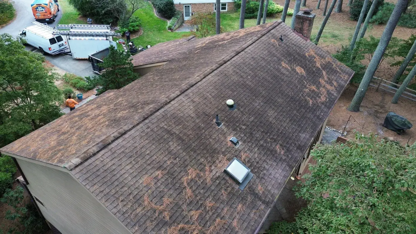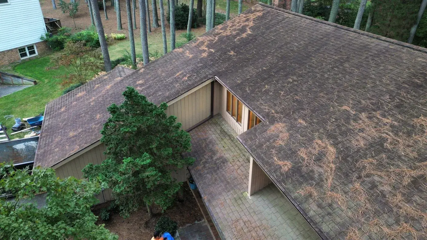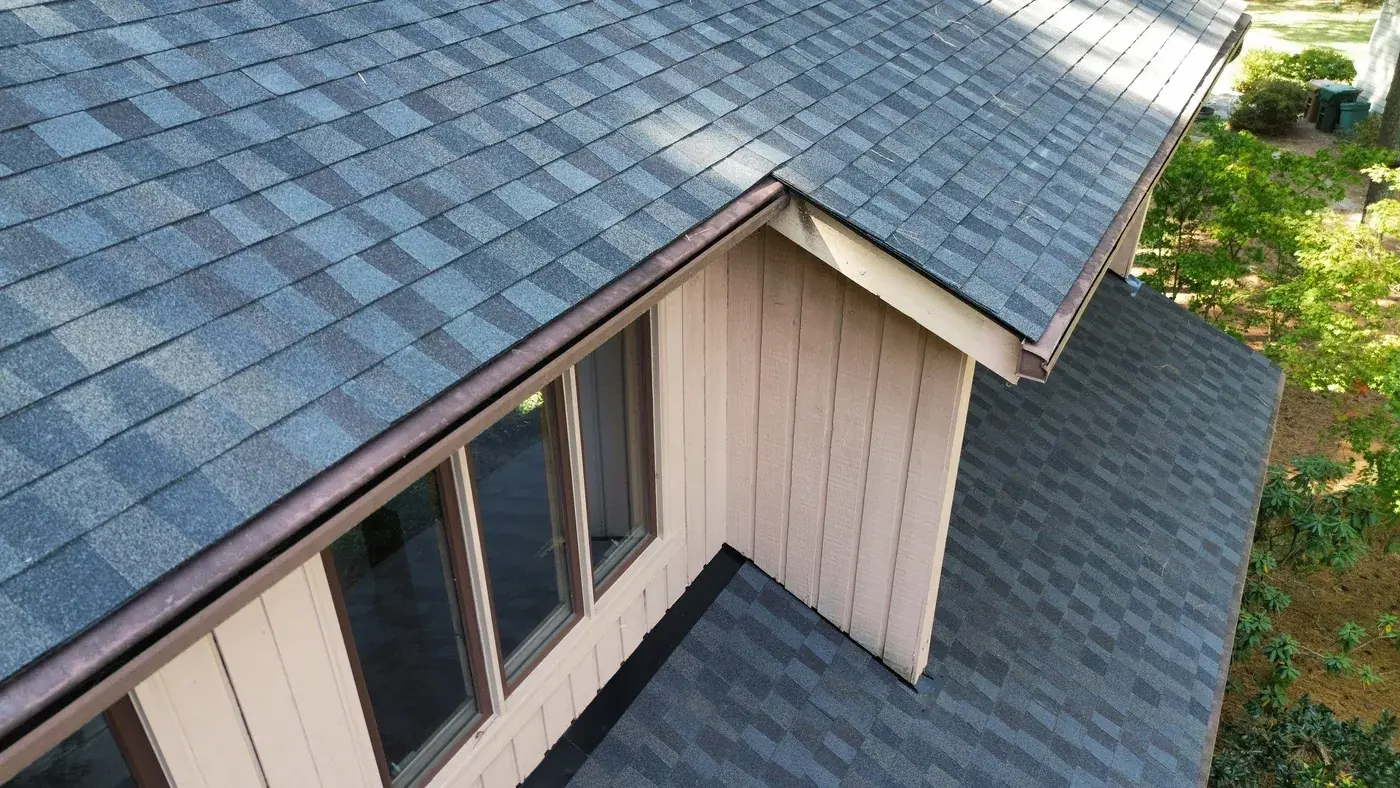 Abernathy Ct in Cary sits deep in a stand of tall pines, a chalet-style home with dark brown wood siding and an attached two-car garage anchoring the left side. With this much tree cover, drainage and ventilation matter, and we paid extra attention to both during prep. We laid down 29 squares of GAF Timberline HDZ in Appalachian Sky, which reads cool against the dark siding and the green canopy above. The new roof brings the home back to a crisp silhouette in a setting that constantly tries to soften it. Total project: $16,760, completed September 2025.