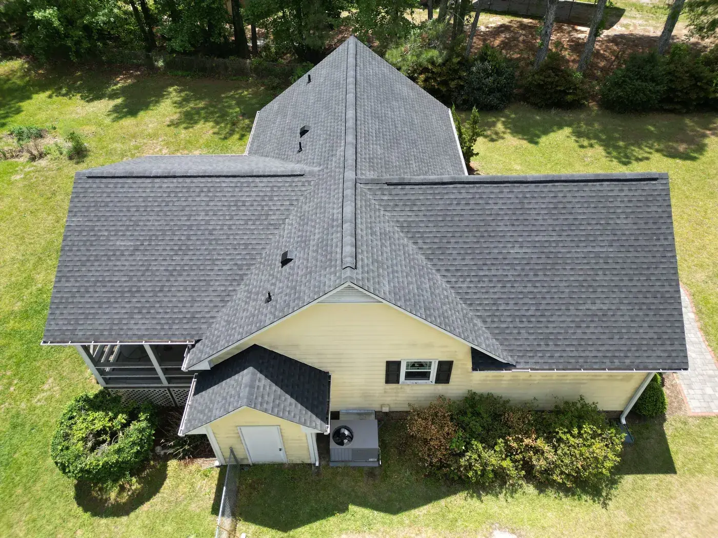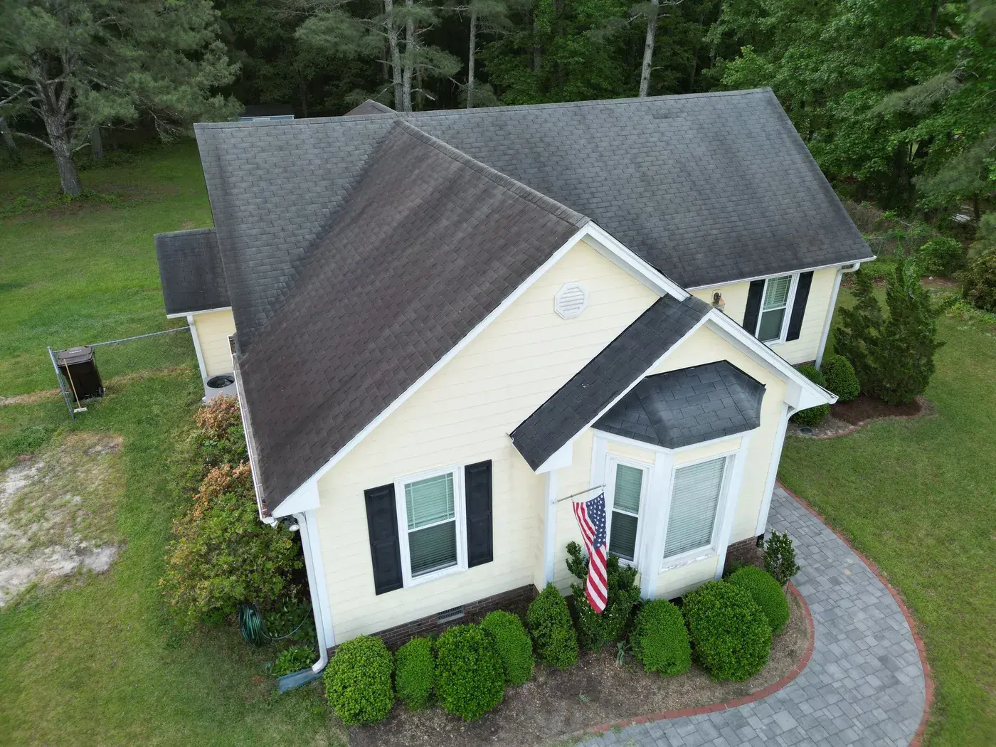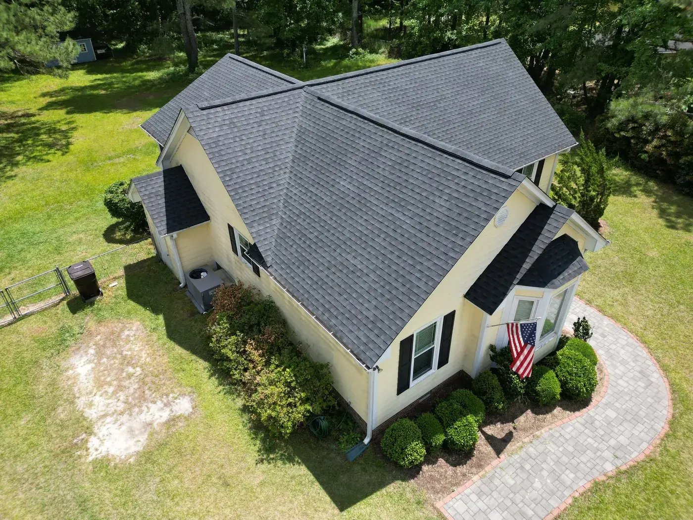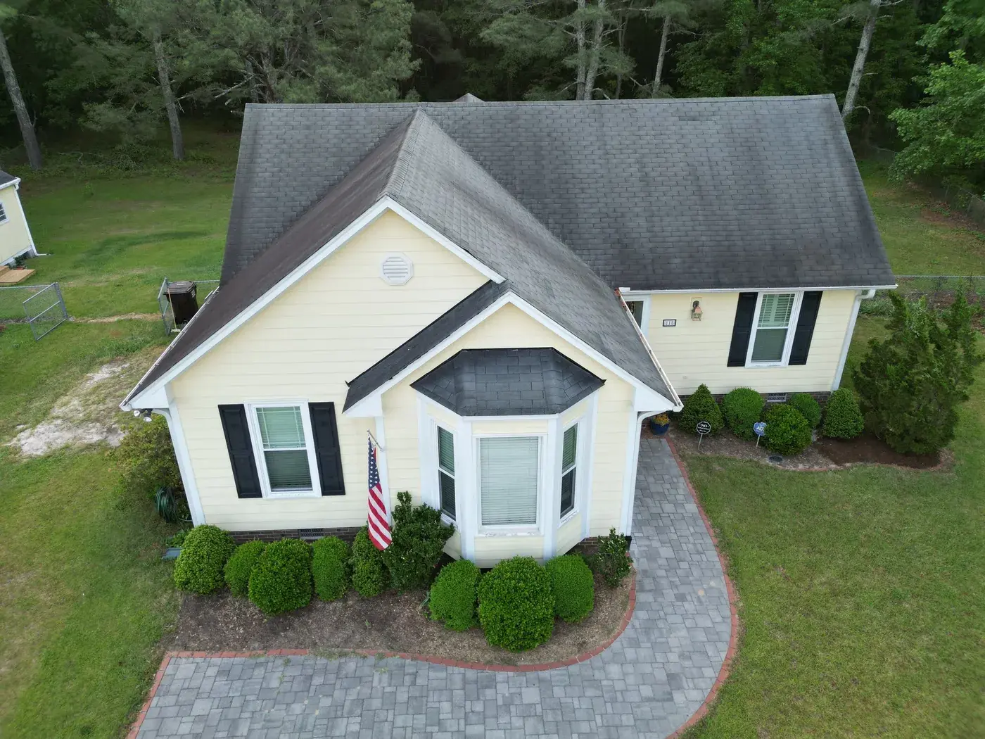 Benton Place Dr in Angier is a charming yellow home with a projecting bay window, a flag flying from the front porch, and a small front-facing gable rising over the entry. The 32 squares this took meant careful flashing where the bay window projection meets the main roof, plus around the smaller side dormer. We installed GAF Timberline HDZ in Charcoal. The dark color reads handsomely against the soft yellow siding, and the home now wears a fresh, sharp roof matching the care the homeowners clearly put into the rest of the property. Total project: $12,000, completed May 2025.