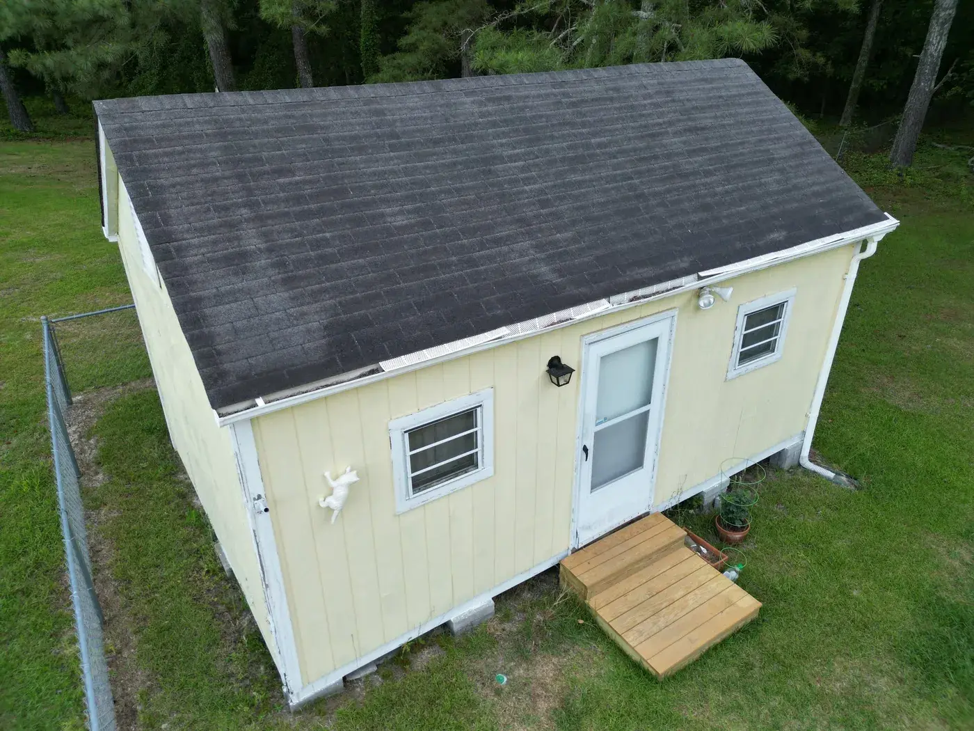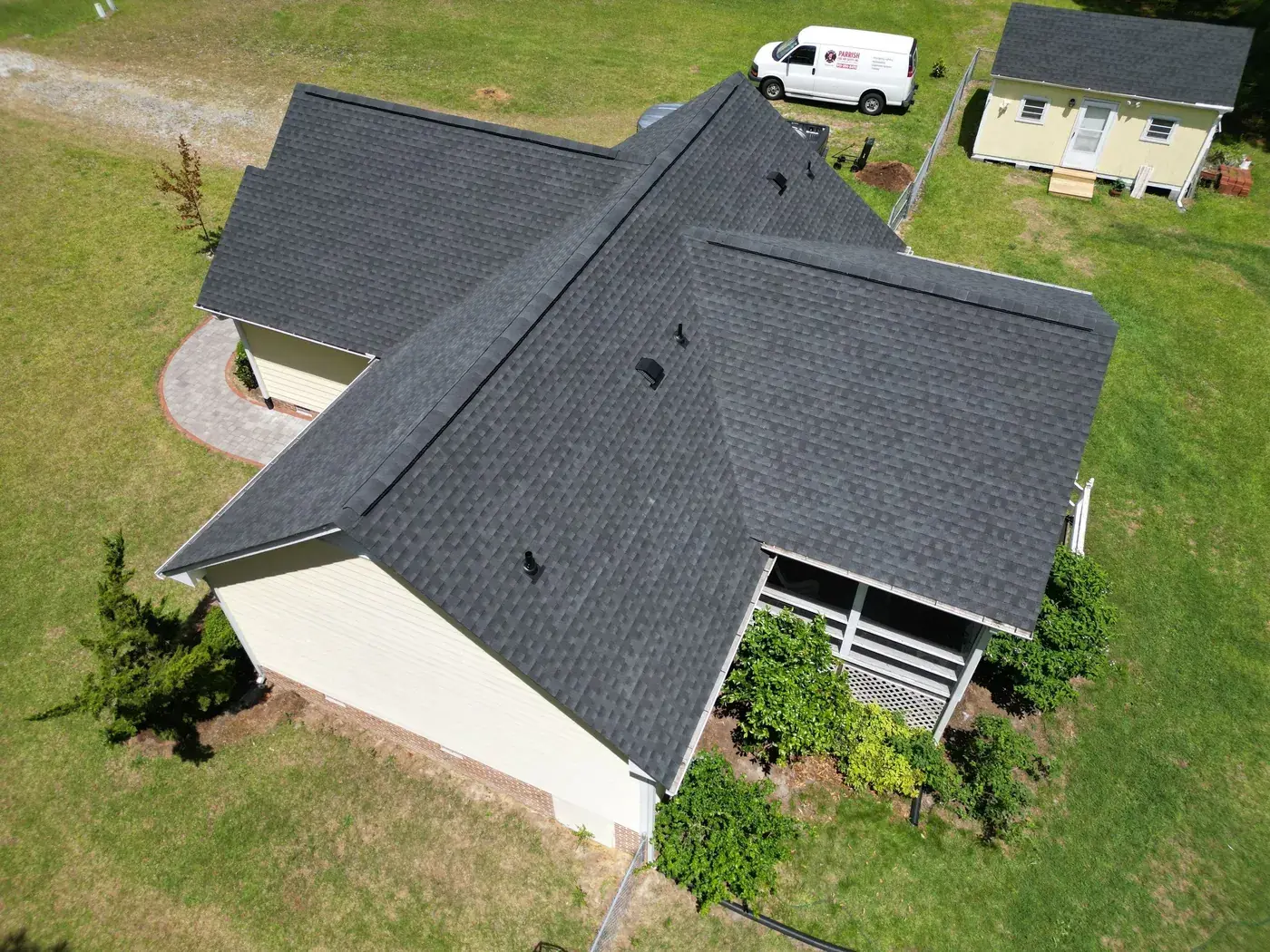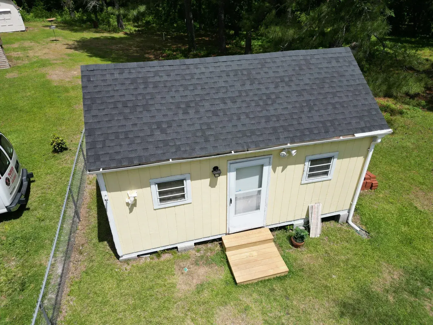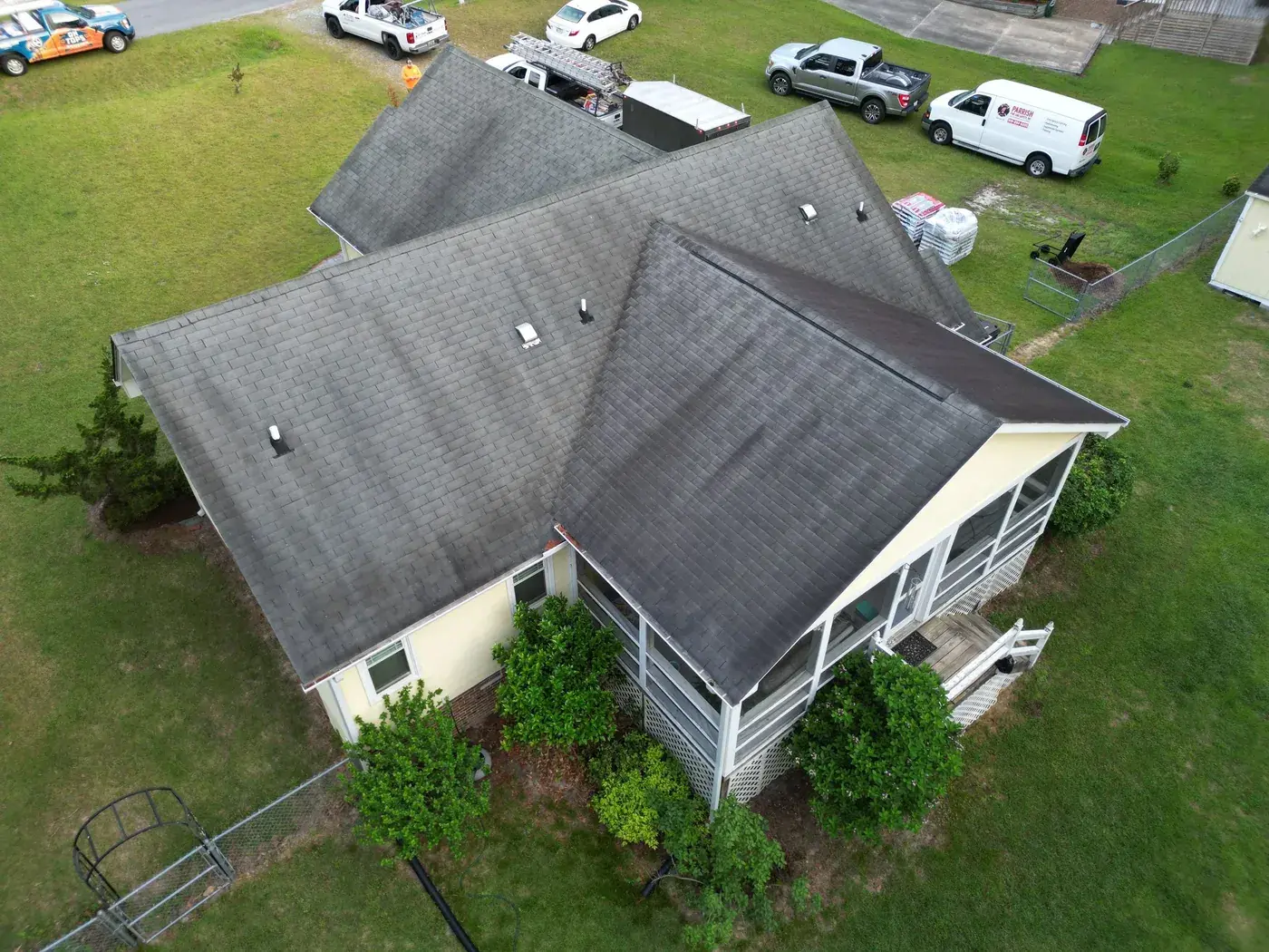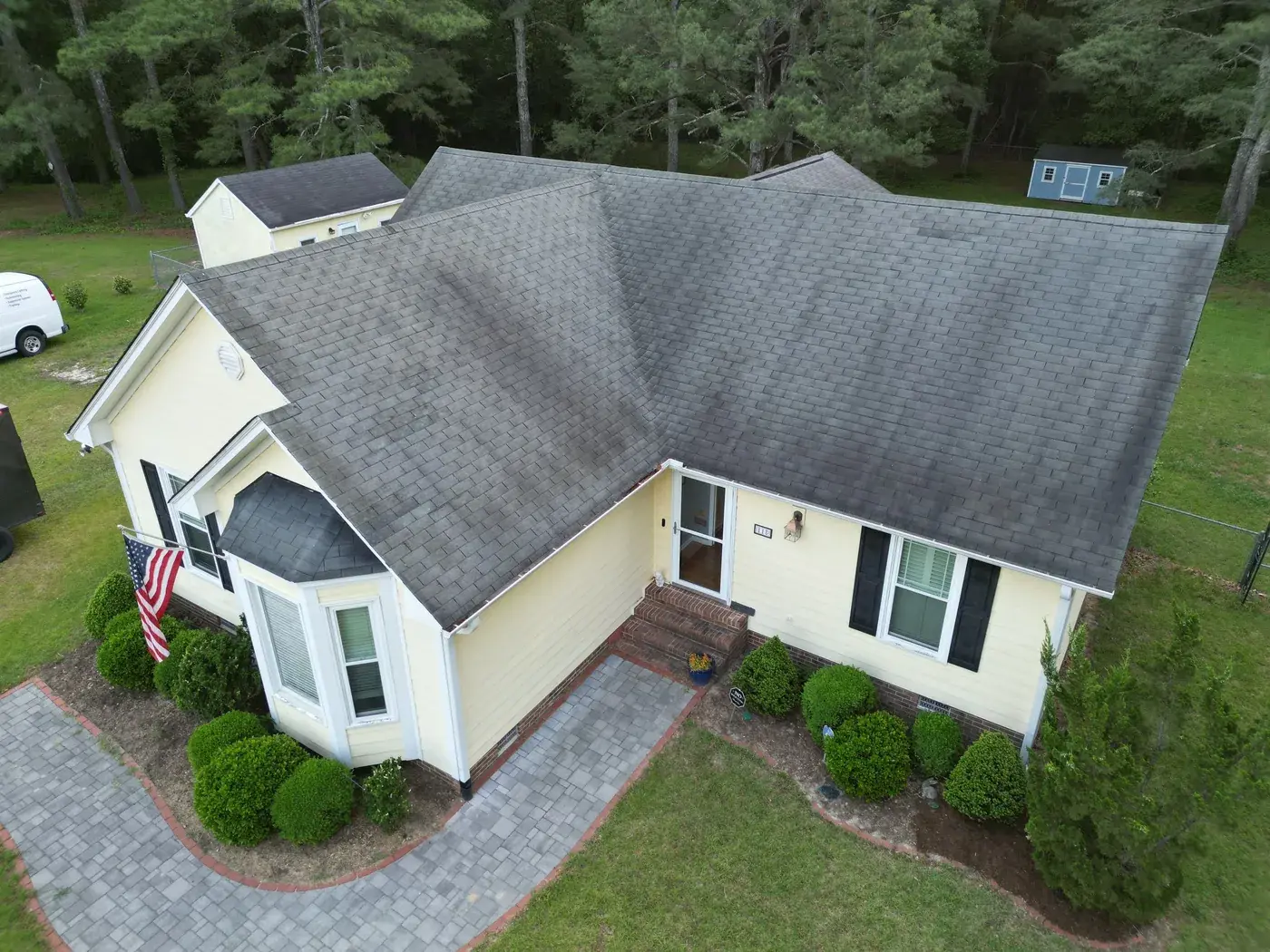 Benton Place Dr in Angier is a charming yellow home with a projecting bay window, a flag flying from the front porch, and a small front-facing gable rising over the entry. The 32 squares this took meant careful flashing where the bay window projection meets the main roof, plus around the smaller side dormer. We installed GAF Timberline HDZ in Charcoal. The dark color reads handsomely against the soft yellow siding, and the home now wears a fresh, sharp roof matching the care the homeowners clearly put into the rest of the property. Total project: $12,000, completed May 2025.