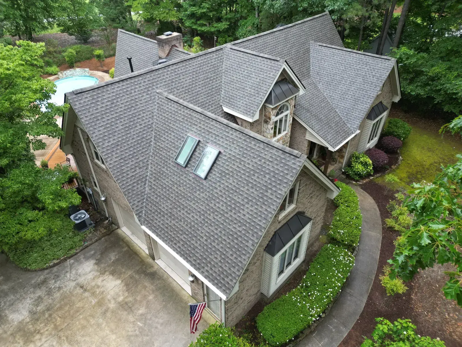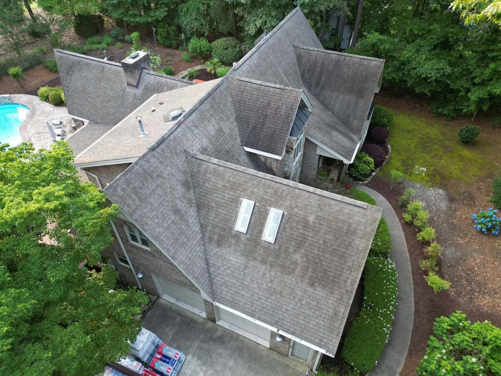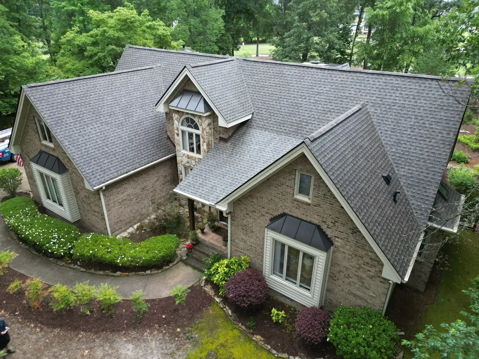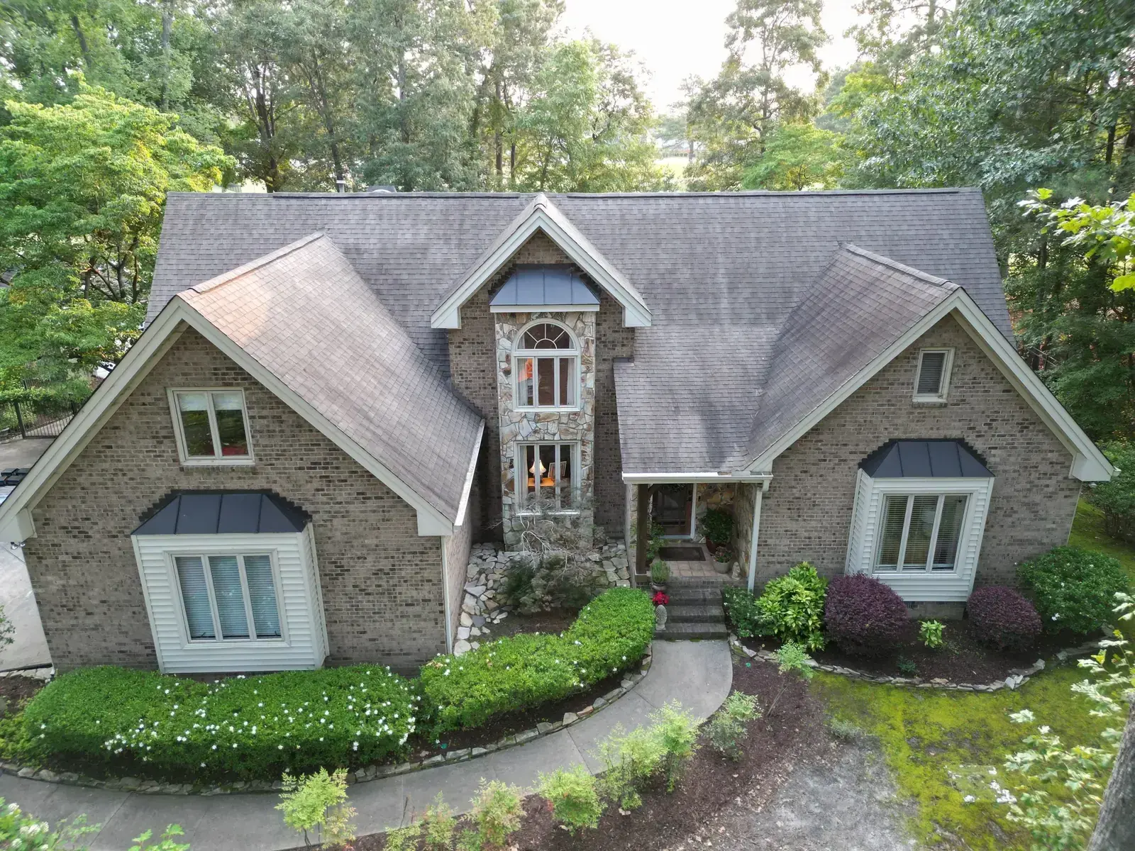 Birkdale Ct in Fuquay-Varina brought us a beautiful stone-and-stucco home with a European cottage feel, a small turret feature framing an arched window over the entry, and a bay window finished off with a bronze metal accent roof. The 66 squares this called for had to flash cleanly into the metal bay roof and around the turret. We installed GAF Timberline HDZ in Weathered Wood. The warm tones blend with the stone and stucco palette and give this carefully detailed home the kind of roof its architecture clearly invited. Total project: $32,580, completed June 2025.