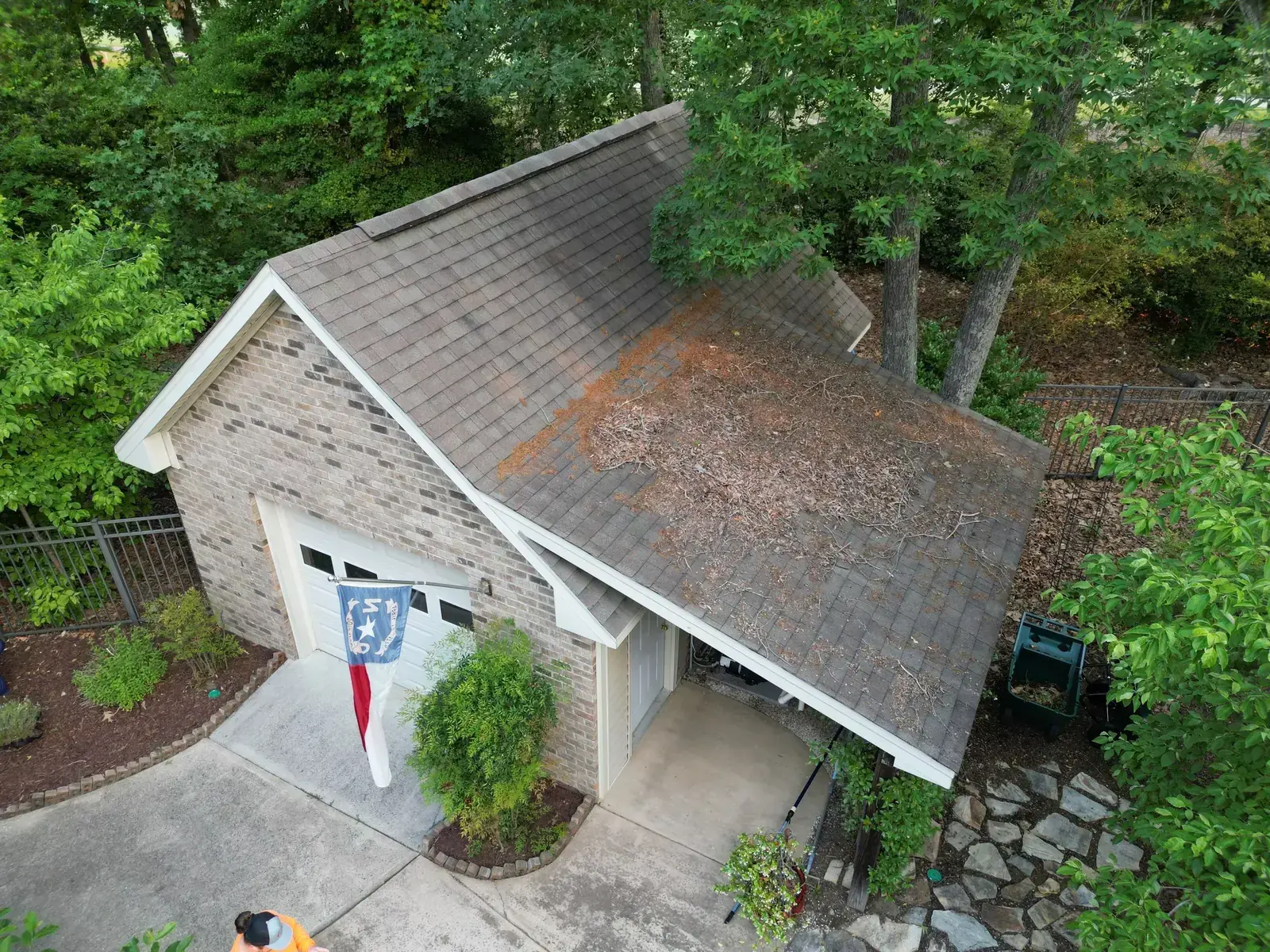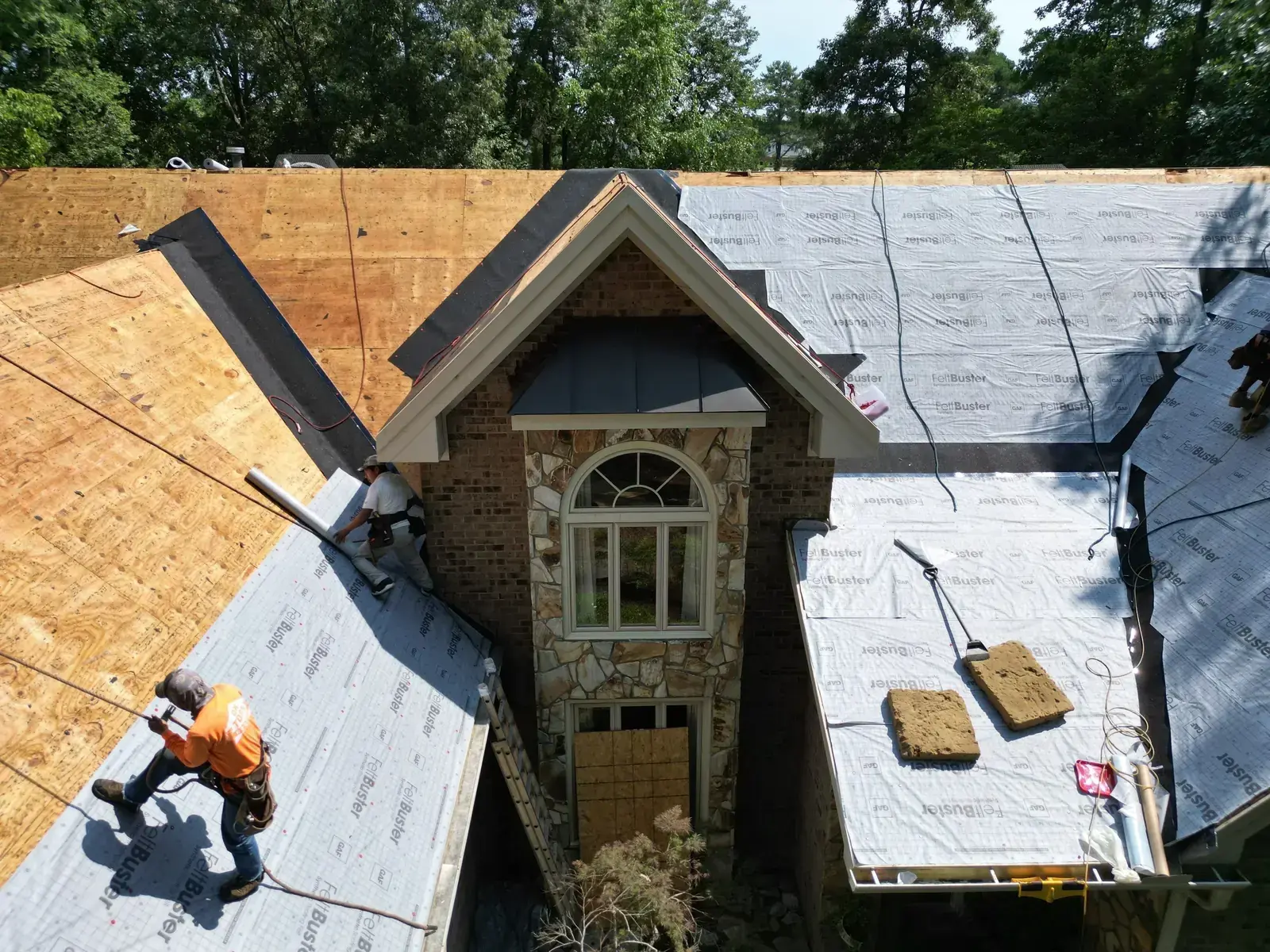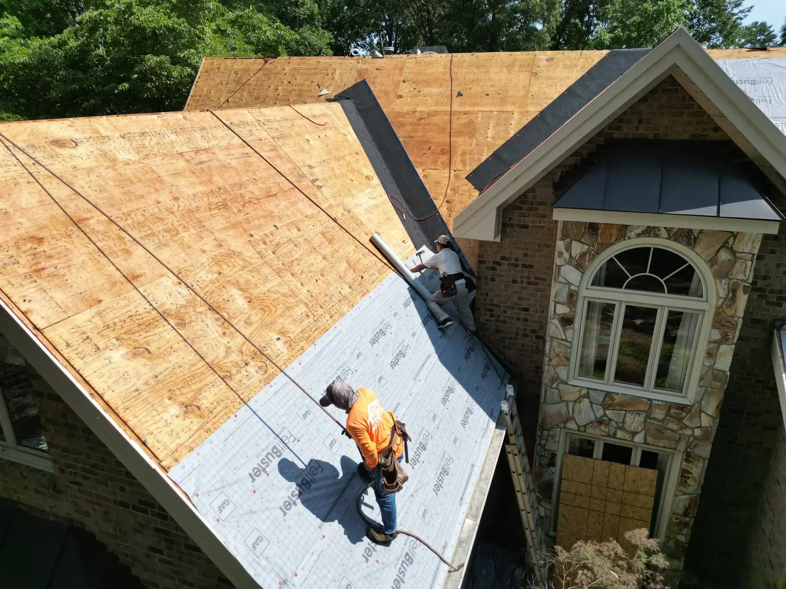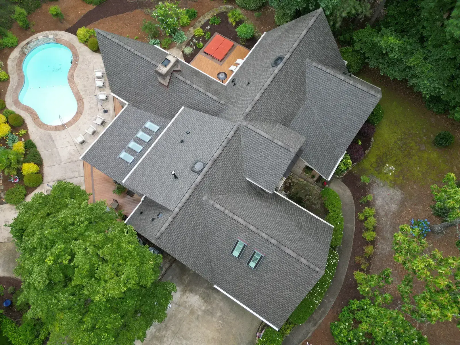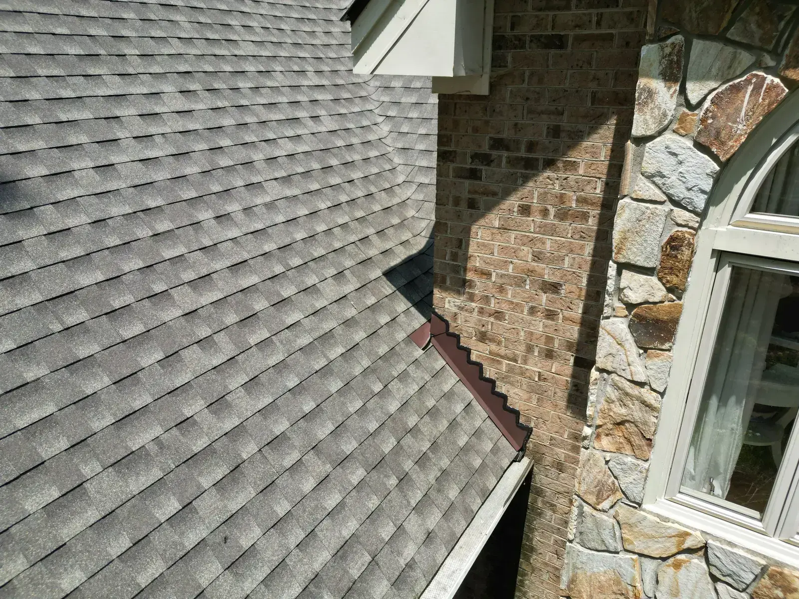 Birkdale Ct in Fuquay-Varina brought us a beautiful stone-and-stucco home with a European cottage feel, a small turret feature framing an arched window over the entry, and a bay window finished off with a bronze metal accent roof. The 66 squares this called for had to flash cleanly into the metal bay roof and around the turret. We installed GAF Timberline HDZ in Weathered Wood. The warm tones blend with the stone and stucco palette and give this carefully detailed home the kind of roof its architecture clearly invited. Total project: $32,580, completed June 2025.
