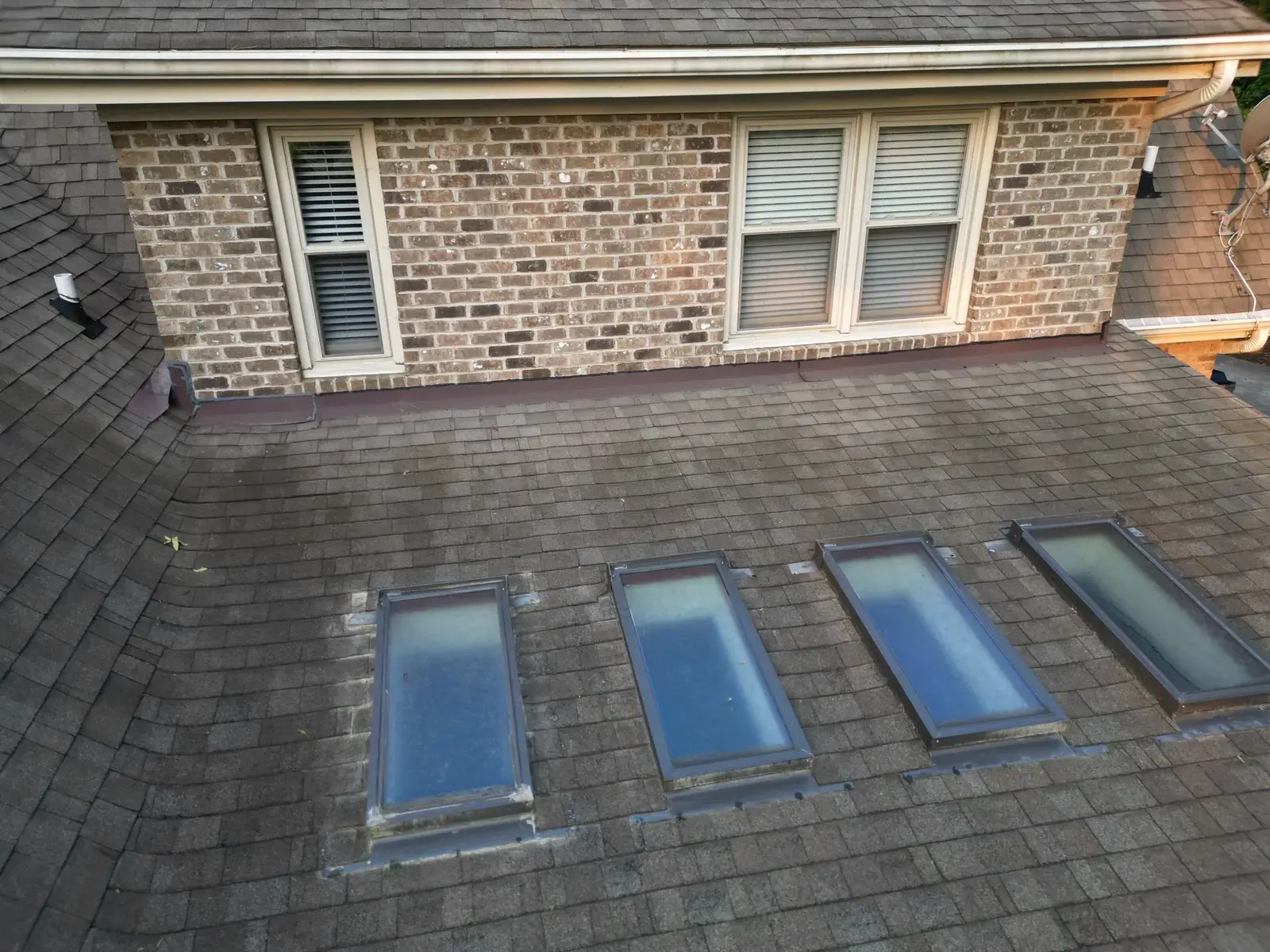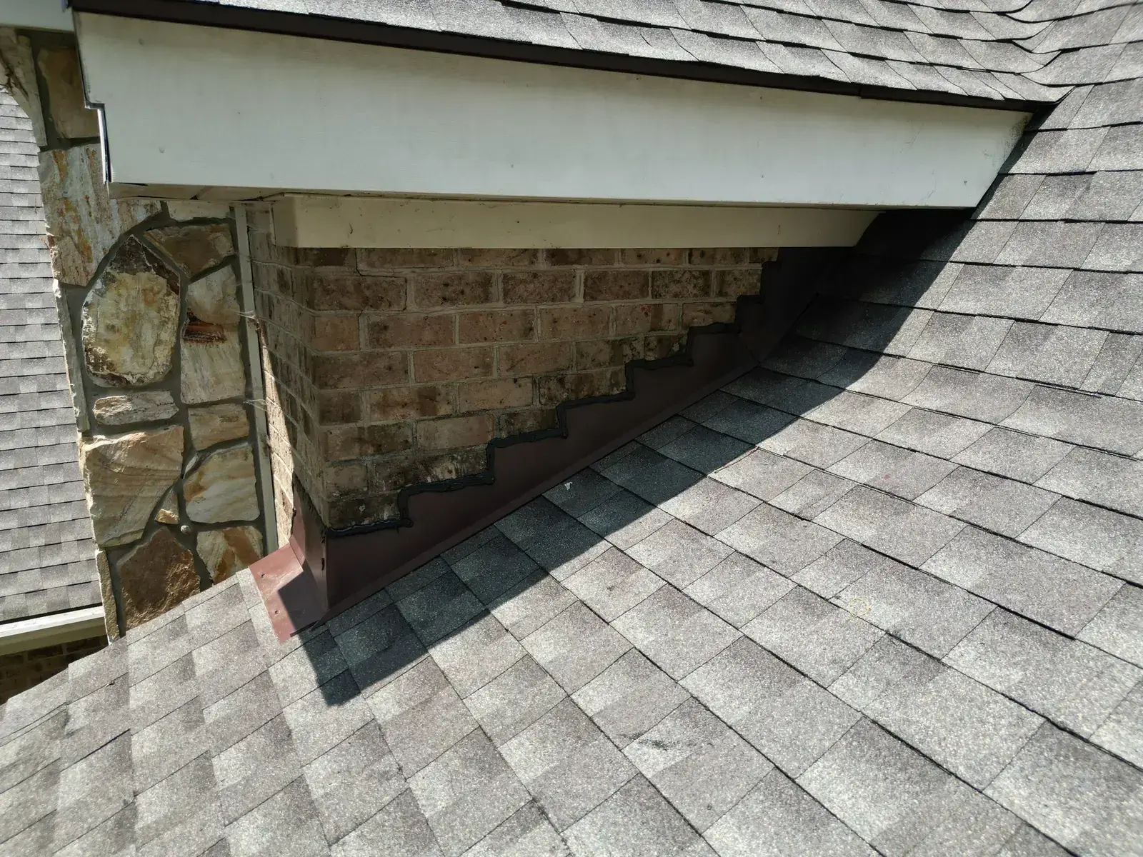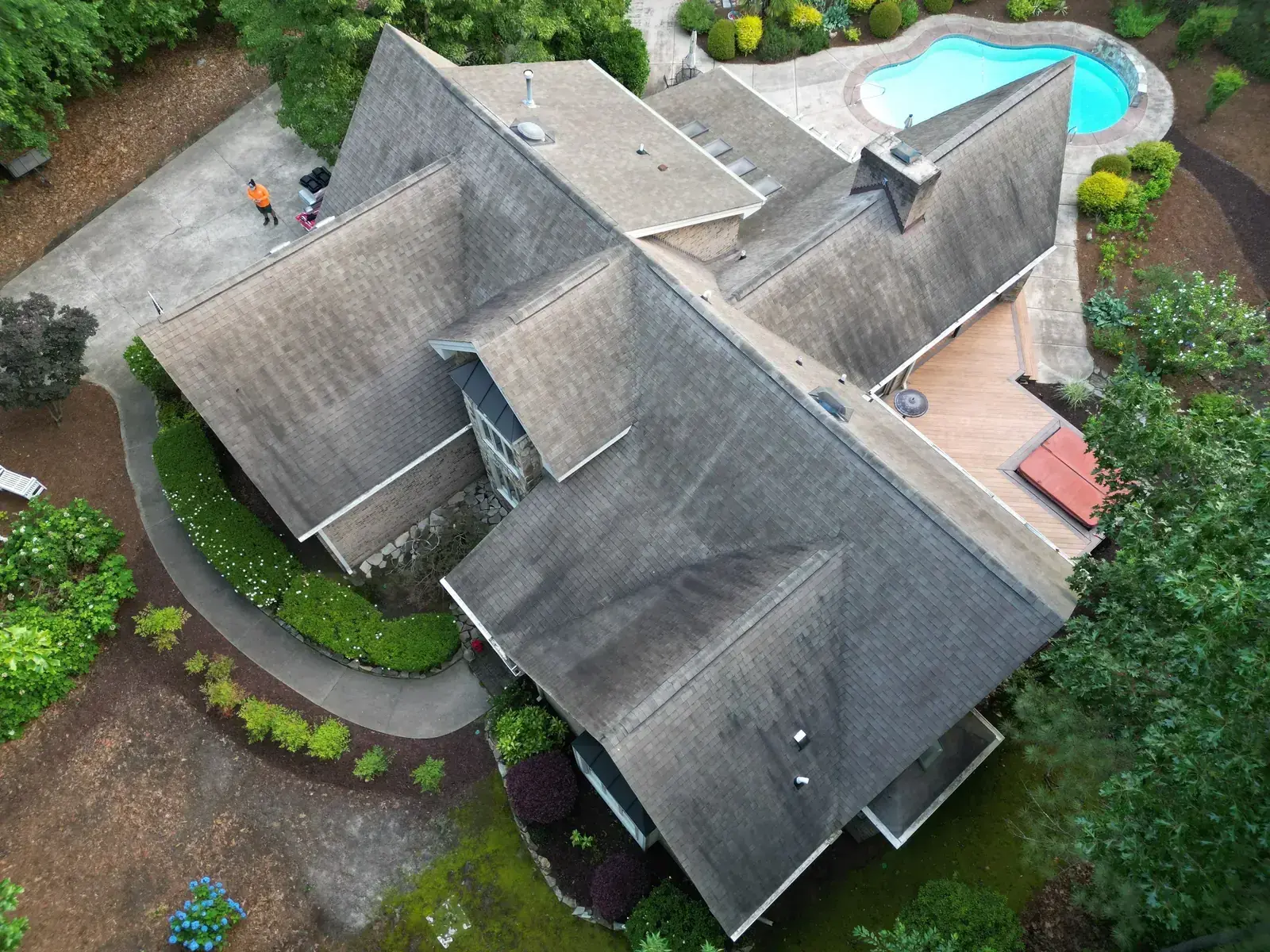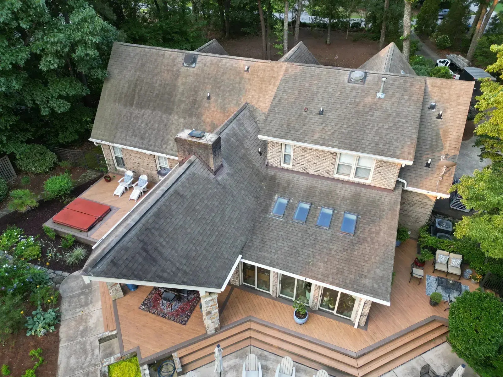 Birkdale Ct in Fuquay-Varina brought us a beautiful stone-and-stucco home with a European cottage feel, a small turret feature framing an arched window over the entry, and a bay window finished off with a bronze metal accent roof. The 66 squares this called for had to flash cleanly into the metal bay roof and around the turret. We installed GAF Timberline HDZ in Weathered Wood. The warm tones blend with the stone and stucco palette and give this carefully detailed home the kind of roof its architecture clearly invited. Total project: $32,580, completed June 2025.