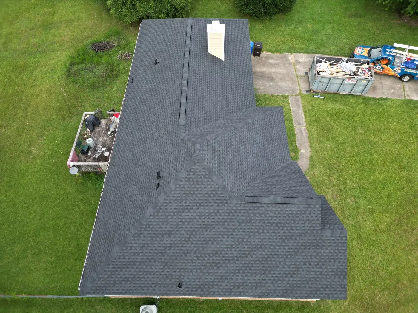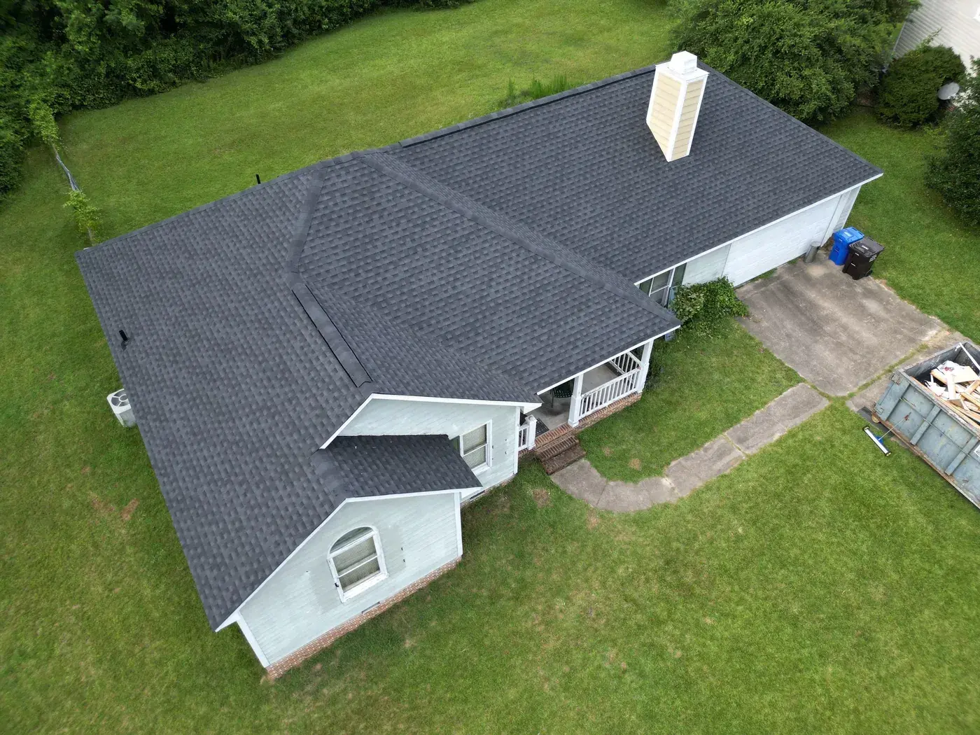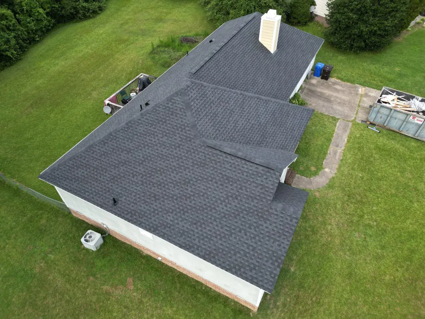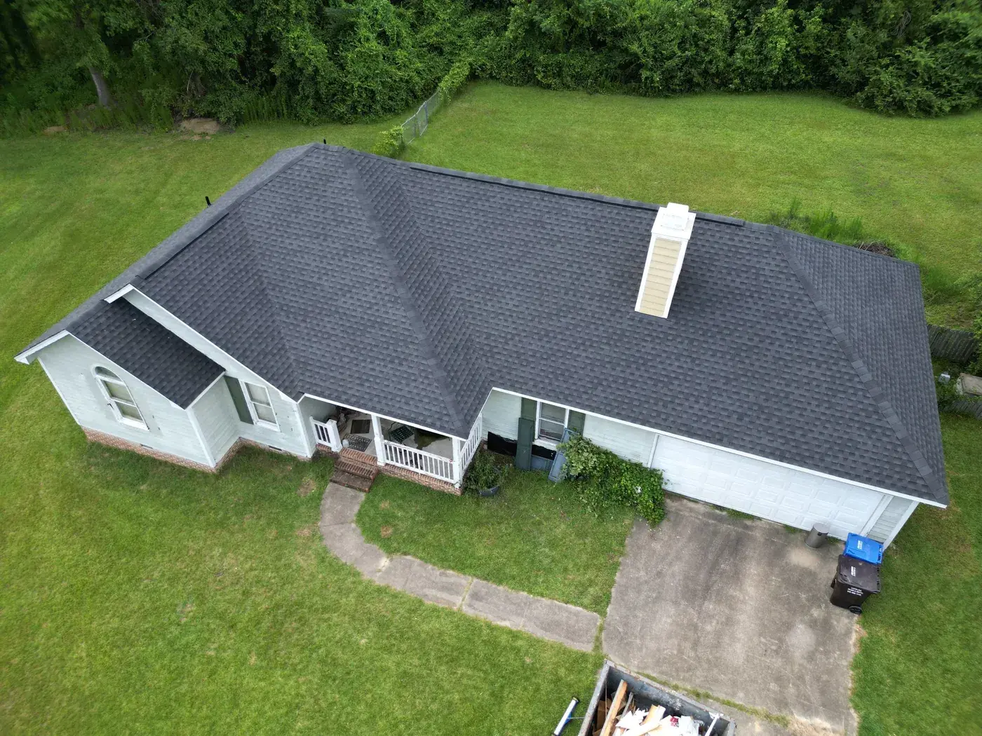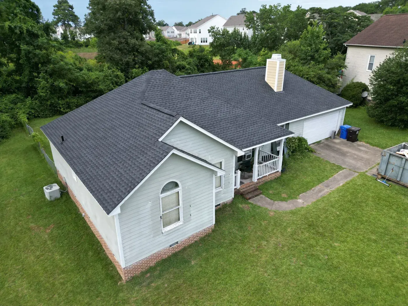 Brookneal Cir in Angier is a single-story home in light gray siding with an arched window in the small front gable and a long side wing reaching to the attached garage. With three roof planes converging at the front and a side chimney to flash, the prep had us focused on every transition. We installed 35 squares of GAF Timberline HDZ in Charcoal. The dark color reads sharp against the gray body and gives the home a deliberate, balanced roofline from any angle. Total project: $14,250, completed July 2025.