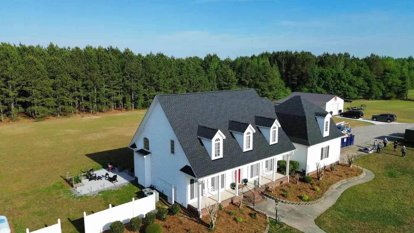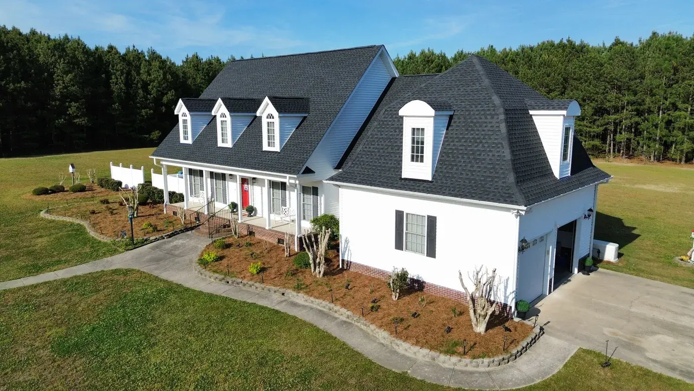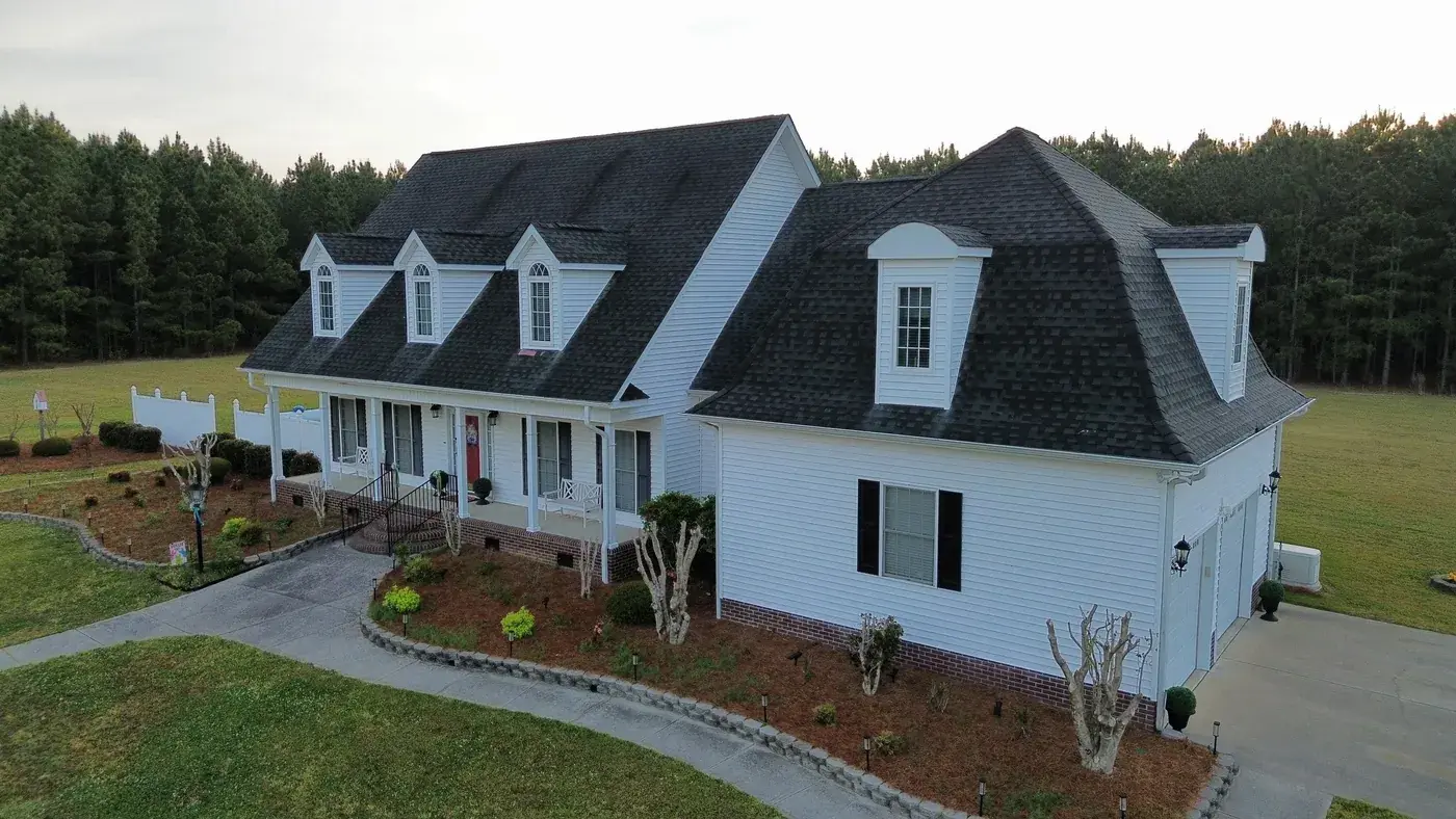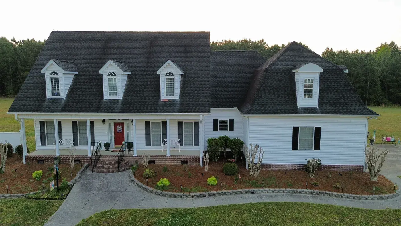C P Stewart Rd in Lillington is a beautiful classic American home with three front-facing dormers, a deep covered front porch, and multiple wings stretching to the right side. With three dormer faces, several intersecting gable transitions, and a porch tie-in to handle, the 66 squares this took meant deliberate, patient prep work throughout. We installed GAF Timberline HDZ in Charcoal. The dark color reads sharp against the crisp white siding and gives this stately home a roof that holds every detail of its careful architecture. Total project: $27,500, completed April 2026.