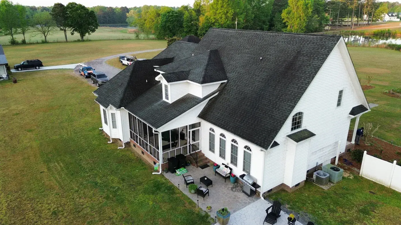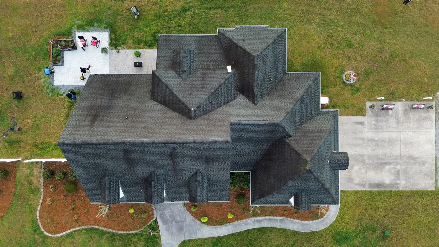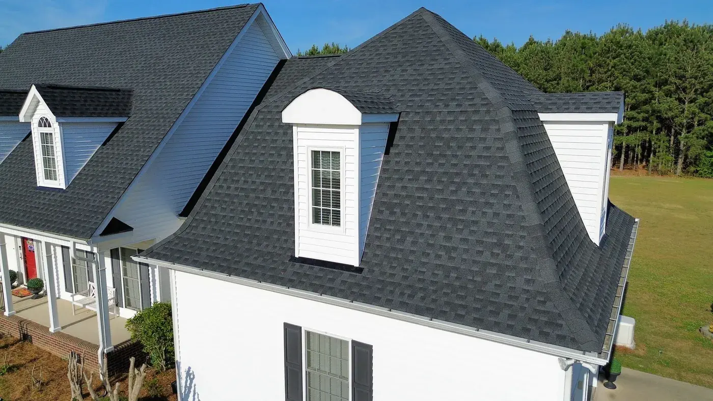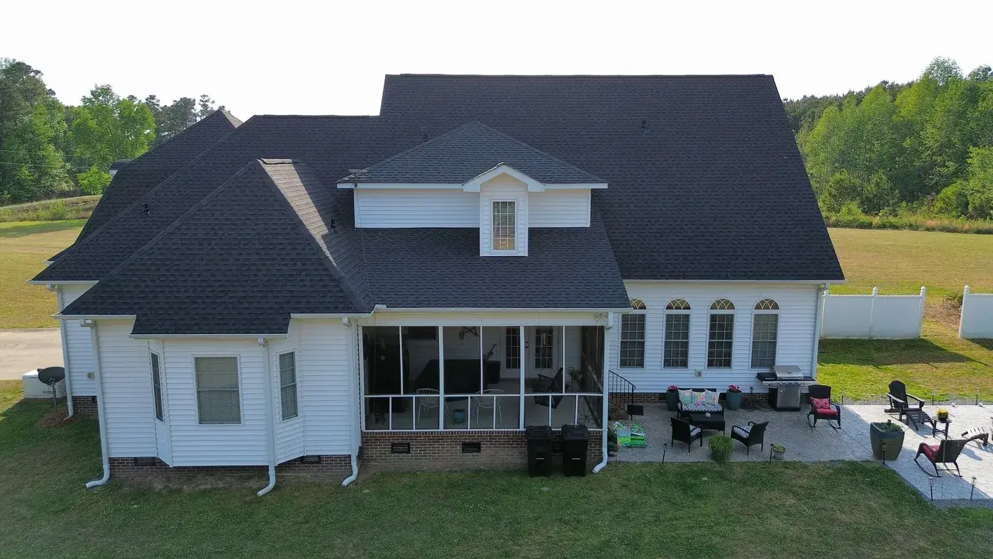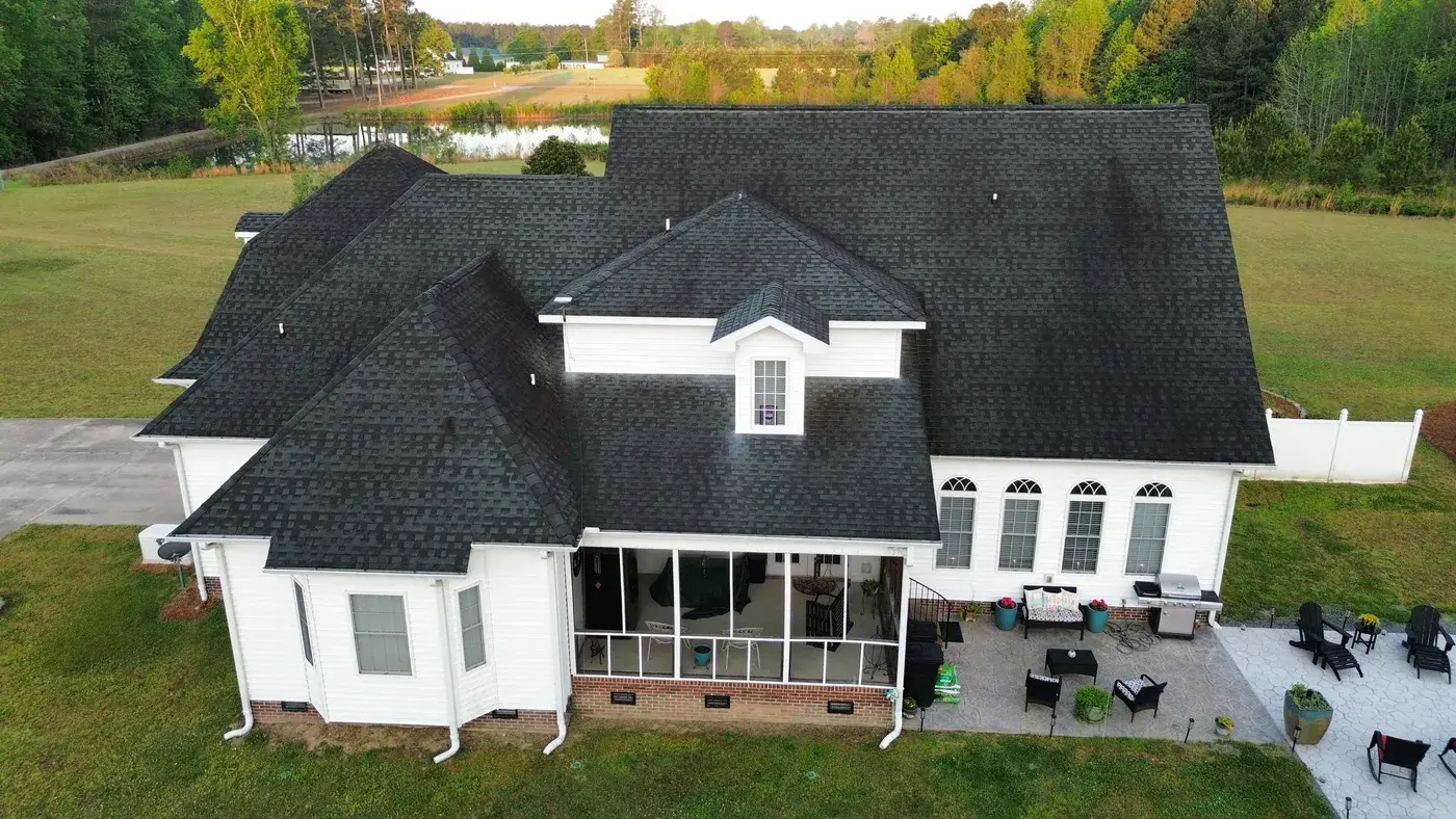 C P Stewart Rd in Lillington is a beautiful classic American home with three front-facing dormers, a deep covered front porch, and multiple wings stretching to the right side. With three dormer faces, several intersecting gable transitions, and a porch tie-in to handle, the 66 squares this took meant deliberate, patient prep work throughout. We installed GAF Timberline HDZ in Charcoal. The dark color reads sharp against the crisp white siding and gives this stately home a roof that holds every detail of its careful architecture. Total project: $27,500, completed April 2026.