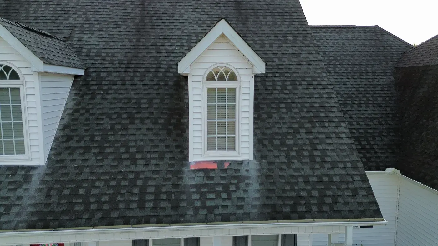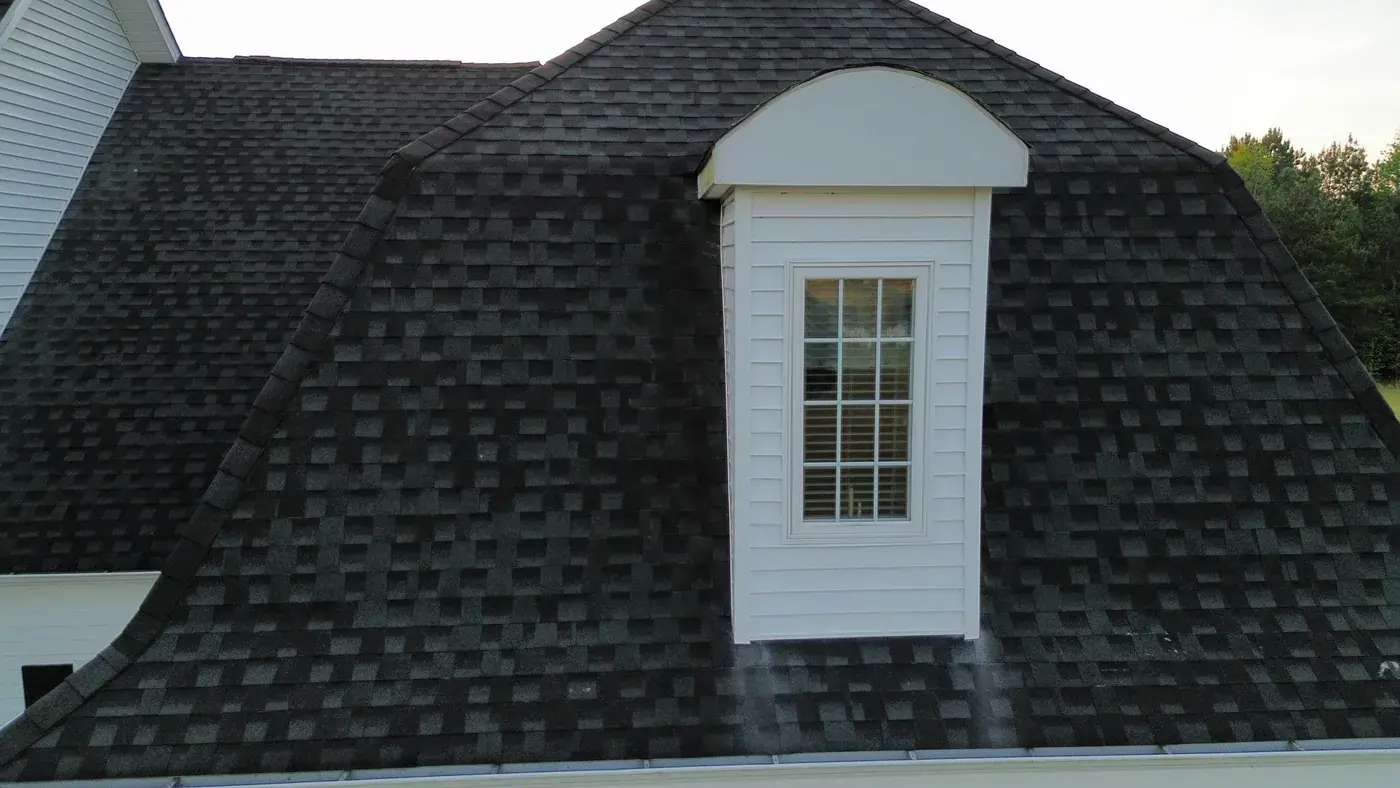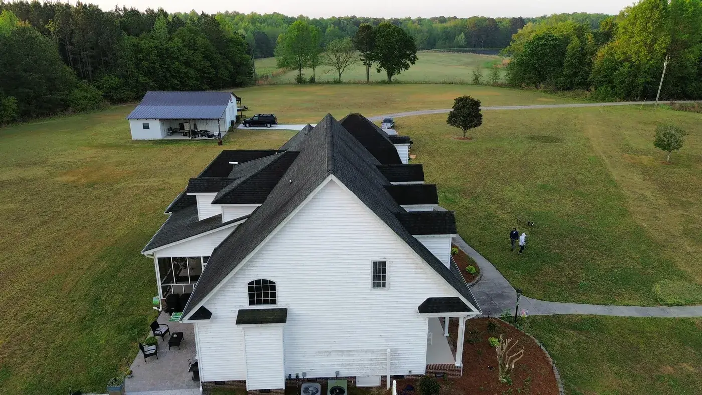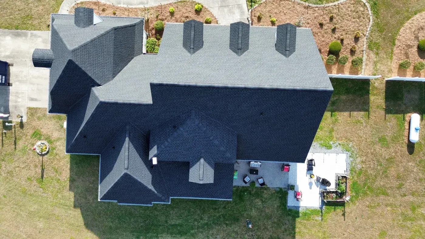 C P Stewart Rd in Lillington is a beautiful classic American home with three front-facing dormers, a deep covered front porch, and multiple wings stretching to the right side. With three dormer faces, several intersecting gable transitions, and a porch tie-in to handle, the 66 squares this took meant deliberate, patient prep work throughout. We installed GAF Timberline HDZ in Charcoal. The dark color reads sharp against the crisp white siding and gives this stately home a roof that holds every detail of its careful architecture. Total project: $27,500, completed April 2026.