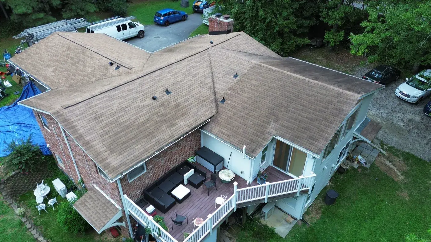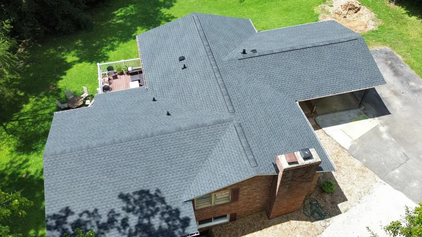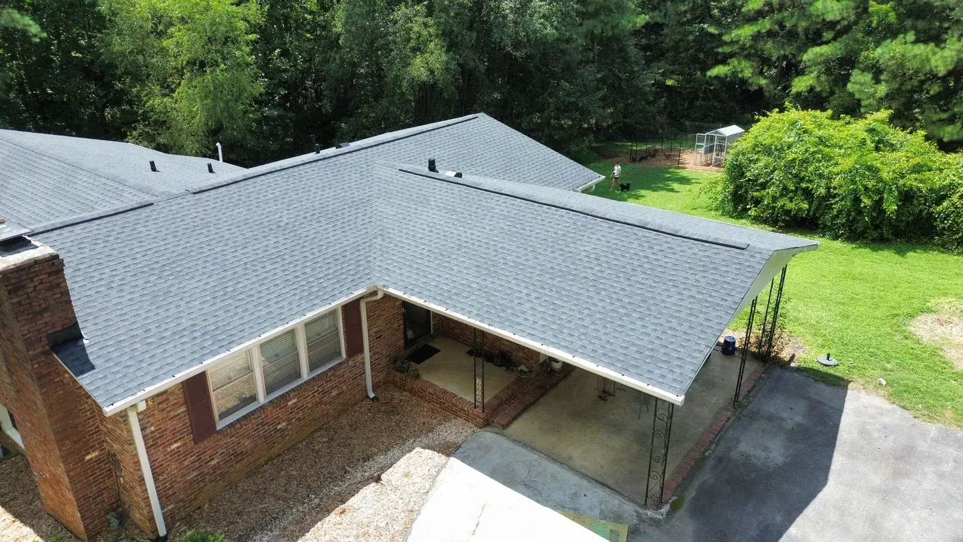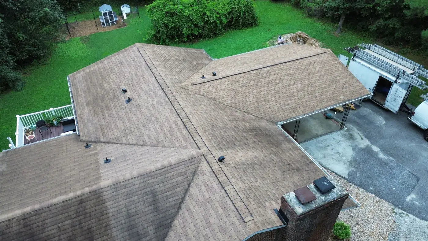 Campbell Rd in Raleigh is a brick ranch with cedar-shake accents, set on a wooded lot with a generous rear deck for the homeowners to use. With a hipped main and a feature gable on the front, the prep had us focused on the ridge caps and the gable transitions. We installed 34 squares of GAF Timberline HDZ in Charcoal. The deep tone reads strong against the warm brick and shake, and from above the roofline looks clean enough to match the time clearly spent on the rest of the property. Total project: $15,840, completed August 2025.