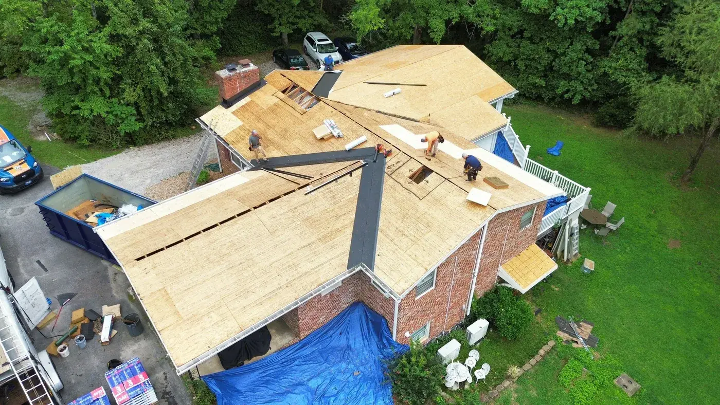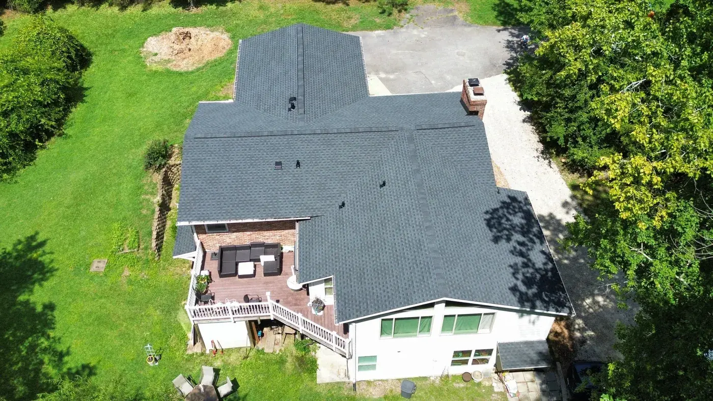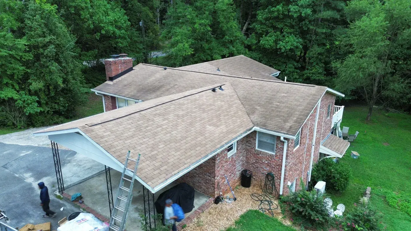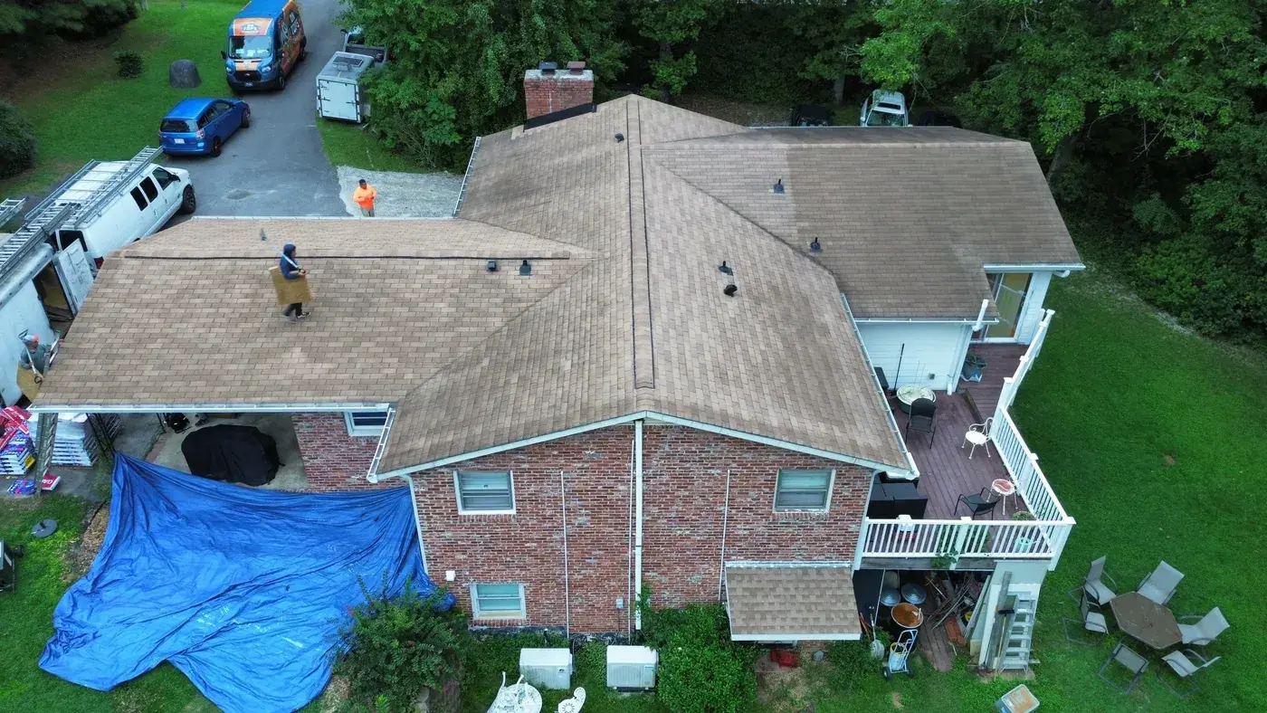 Campbell Rd in Raleigh is a brick ranch with cedar-shake accents, set on a wooded lot with a generous rear deck for the homeowners to use. With a hipped main and a feature gable on the front, the prep had us focused on the ridge caps and the gable transitions. We installed 34 squares of GAF Timberline HDZ in Charcoal. The deep tone reads strong against the warm brick and shake, and from above the roofline looks clean enough to match the time clearly spent on the rest of the property. Total project: $15,840, completed August 2025.