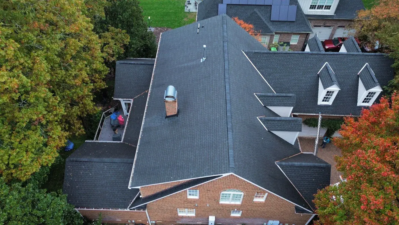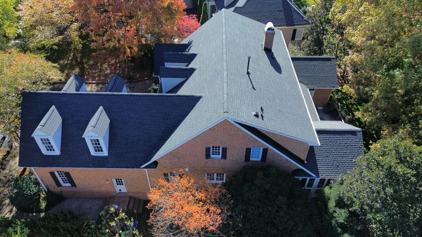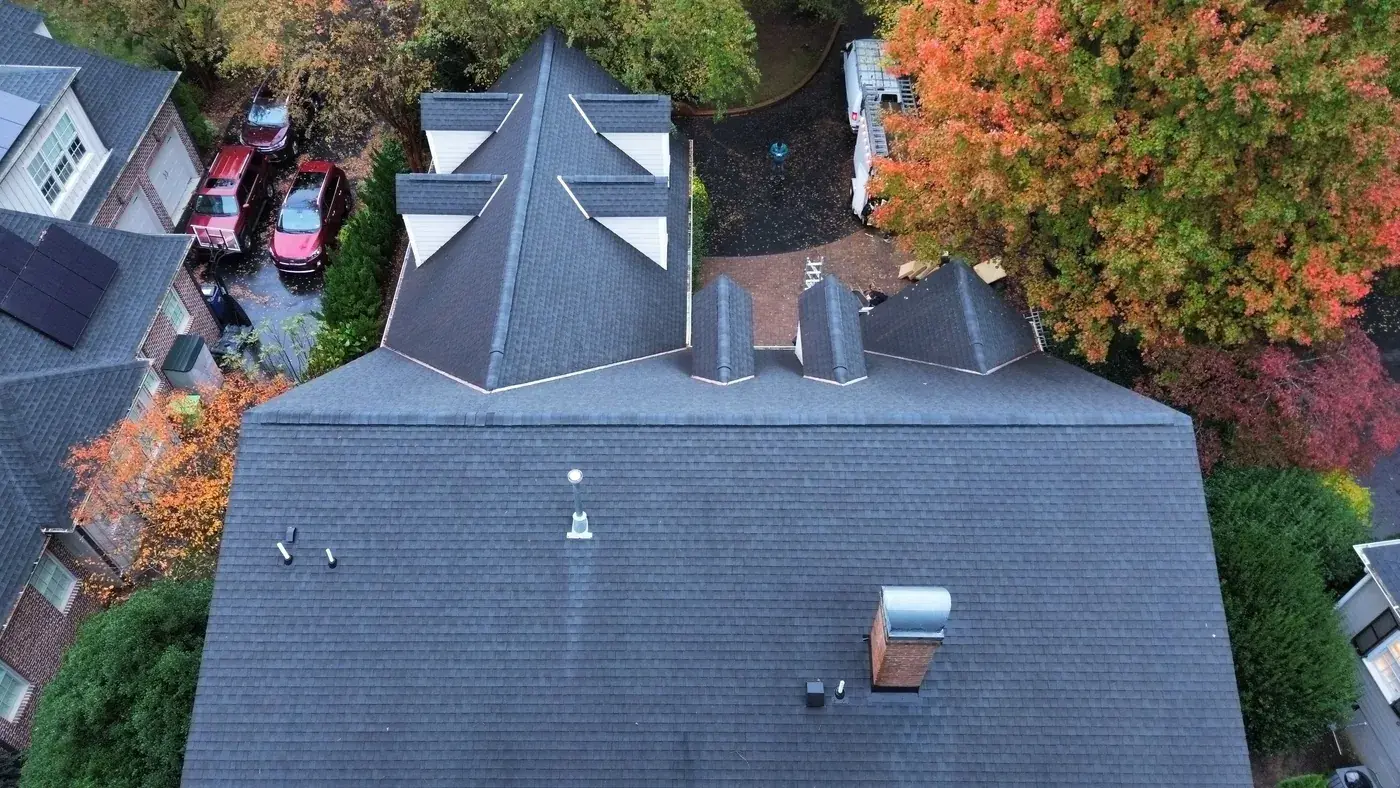 Carlton Square Pl in Raleigh is a substantial home with two prominent front-facing dormers, three brick chimneys rising from the main plane, and a covered front entry tucked beneath the dormer line. With chimney flashing on three separate stacks plus two full dormer faces, this 64-square job took its time on the prep. We installed GAF Timberline HDZ in Charcoal, a tone that frames the brick chimneys cleanly and reads sharp against the autumn color in the surrounding trees. Total project: $29,600, completed December 2025.