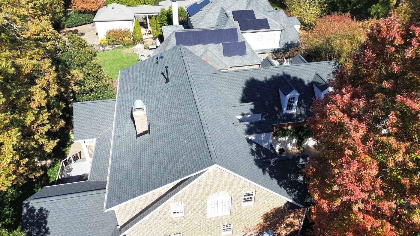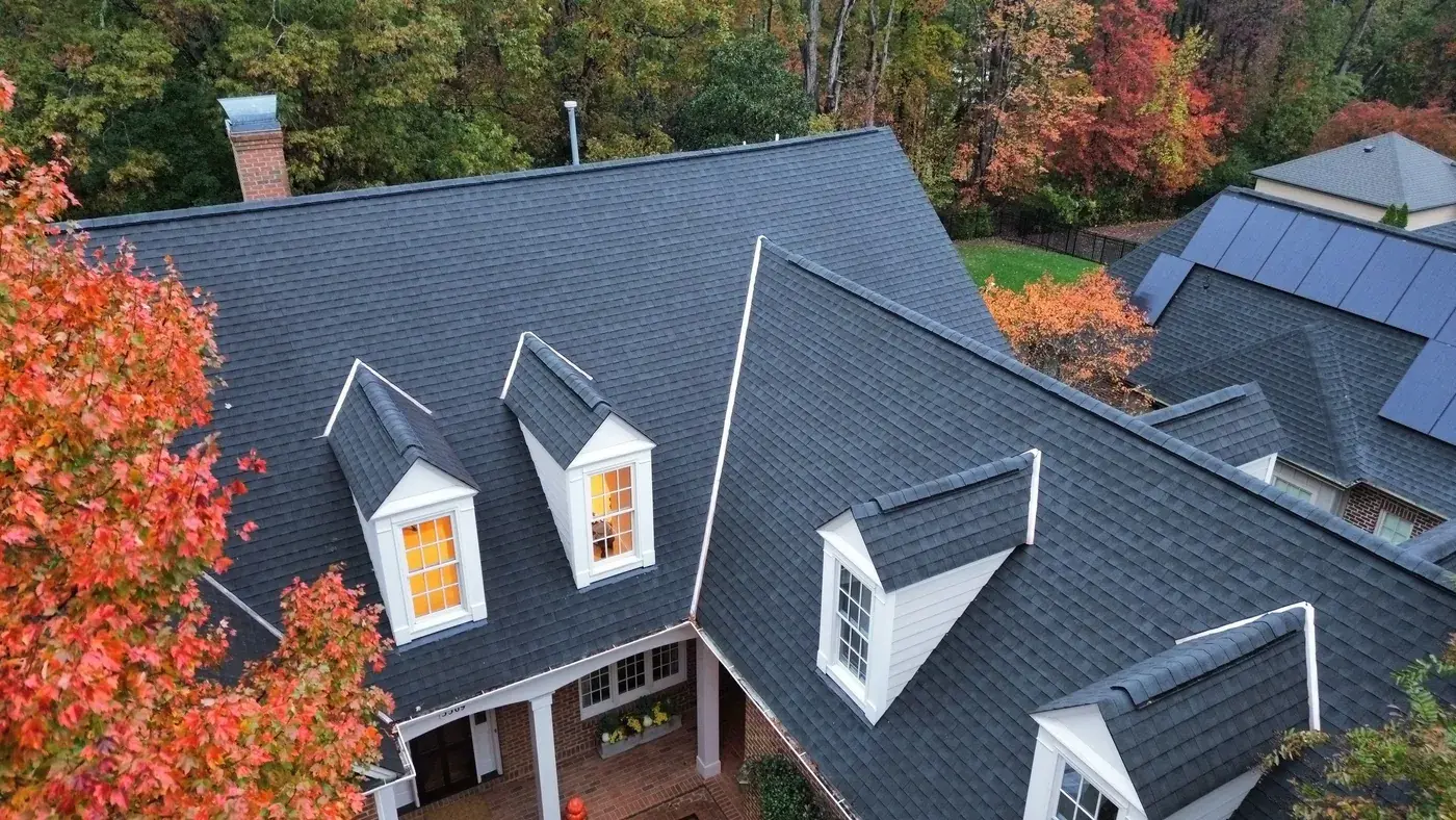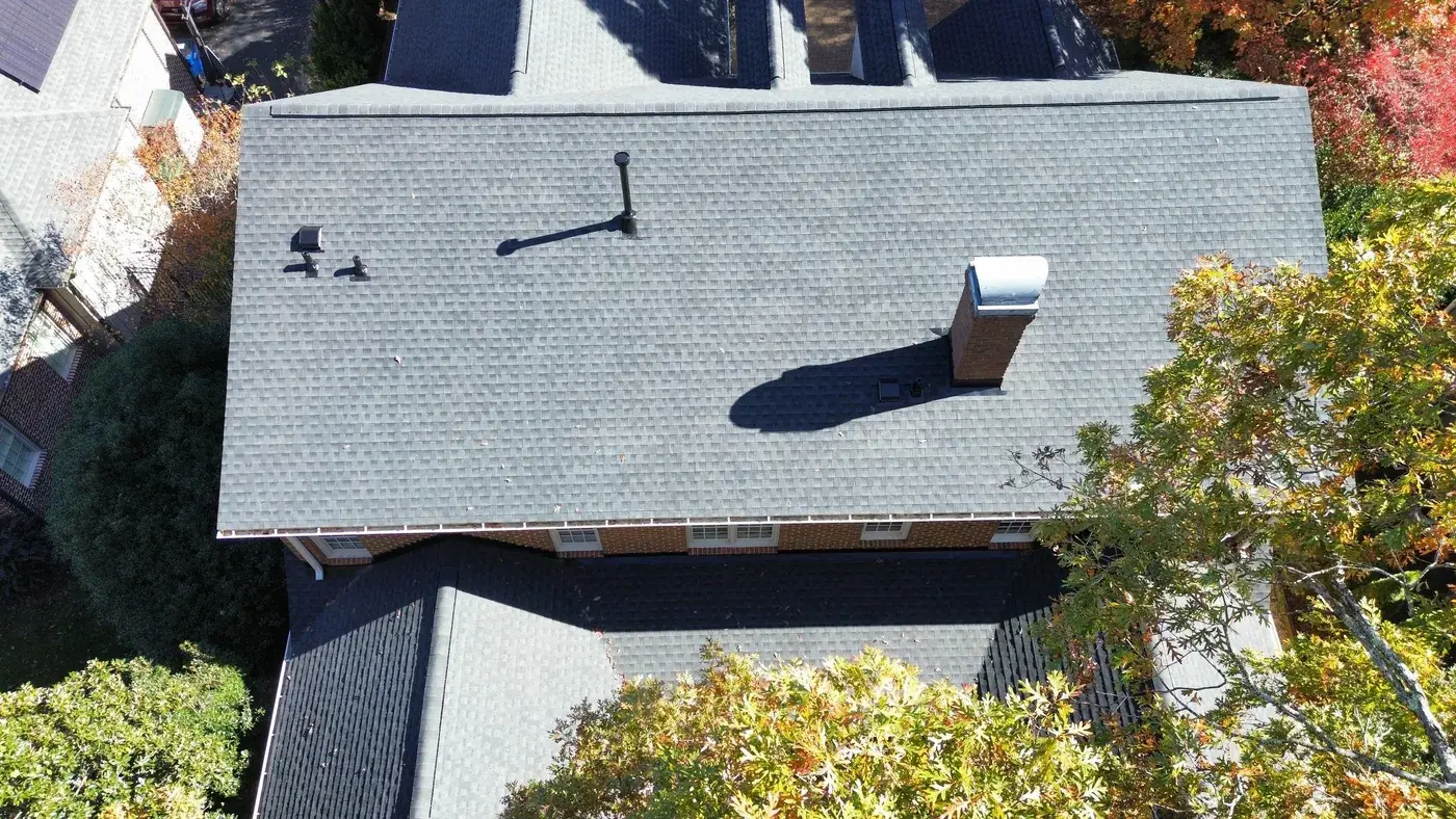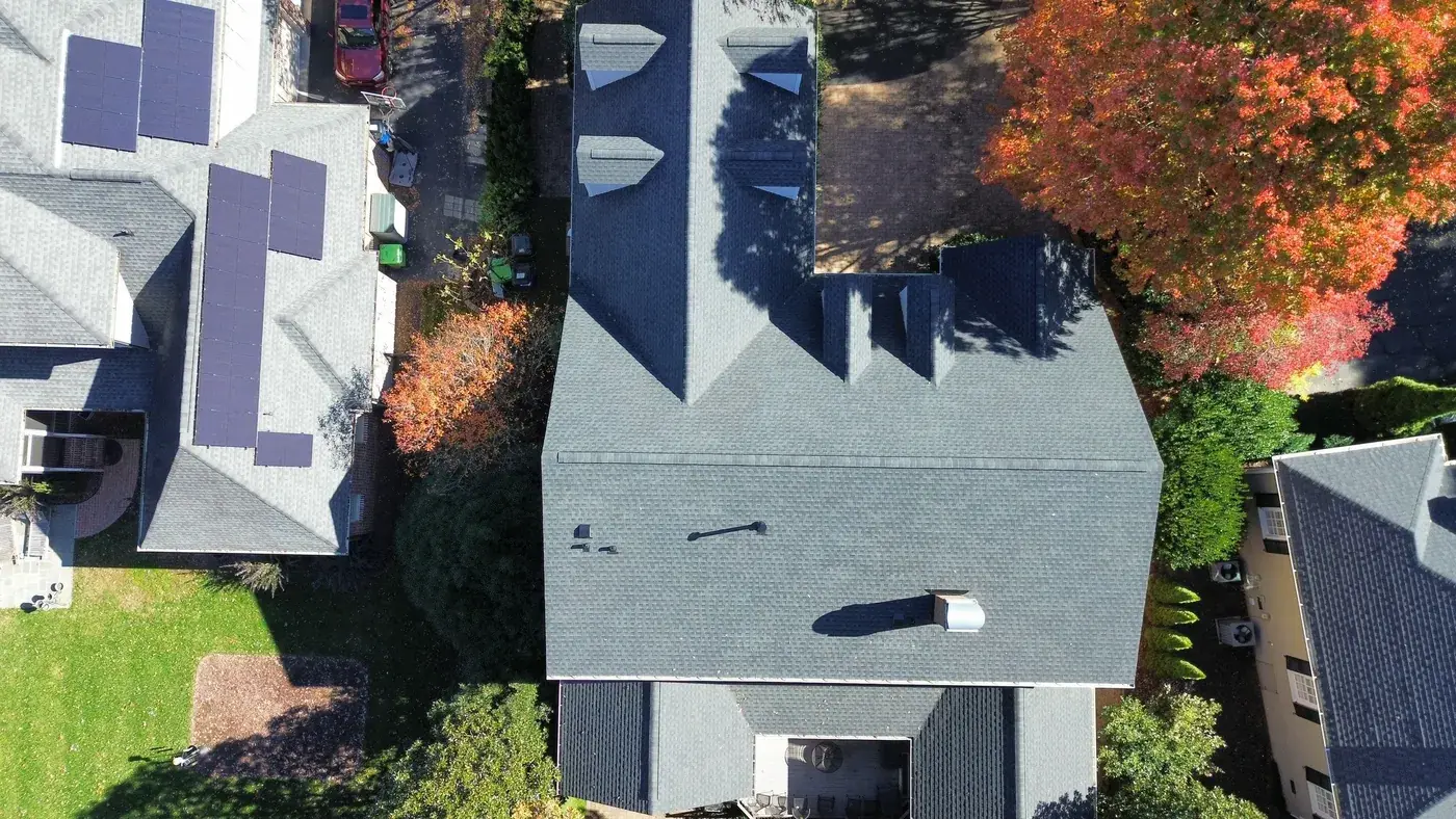 Carlton Square Pl in Raleigh is a substantial home with two prominent front-facing dormers, three brick chimneys rising from the main plane, and a covered front entry tucked beneath the dormer line. With chimney flashing on three separate stacks plus two full dormer faces, this 64-square job took its time on the prep. We installed GAF Timberline HDZ in Charcoal, a tone that frames the brick chimneys cleanly and reads sharp against the autumn color in the surrounding trees. Total project: $29,600, completed December 2025.
