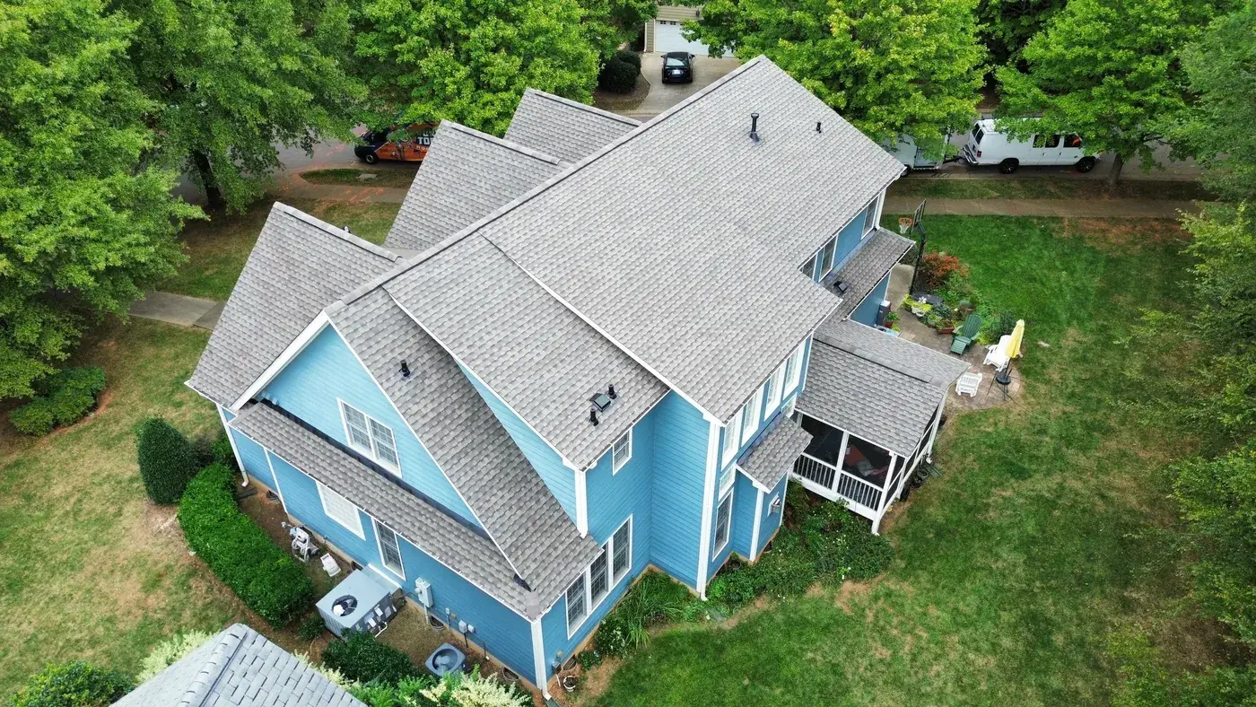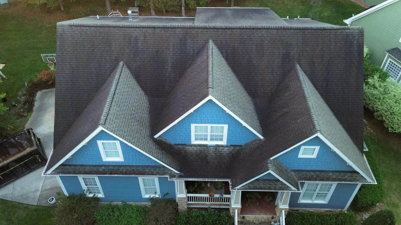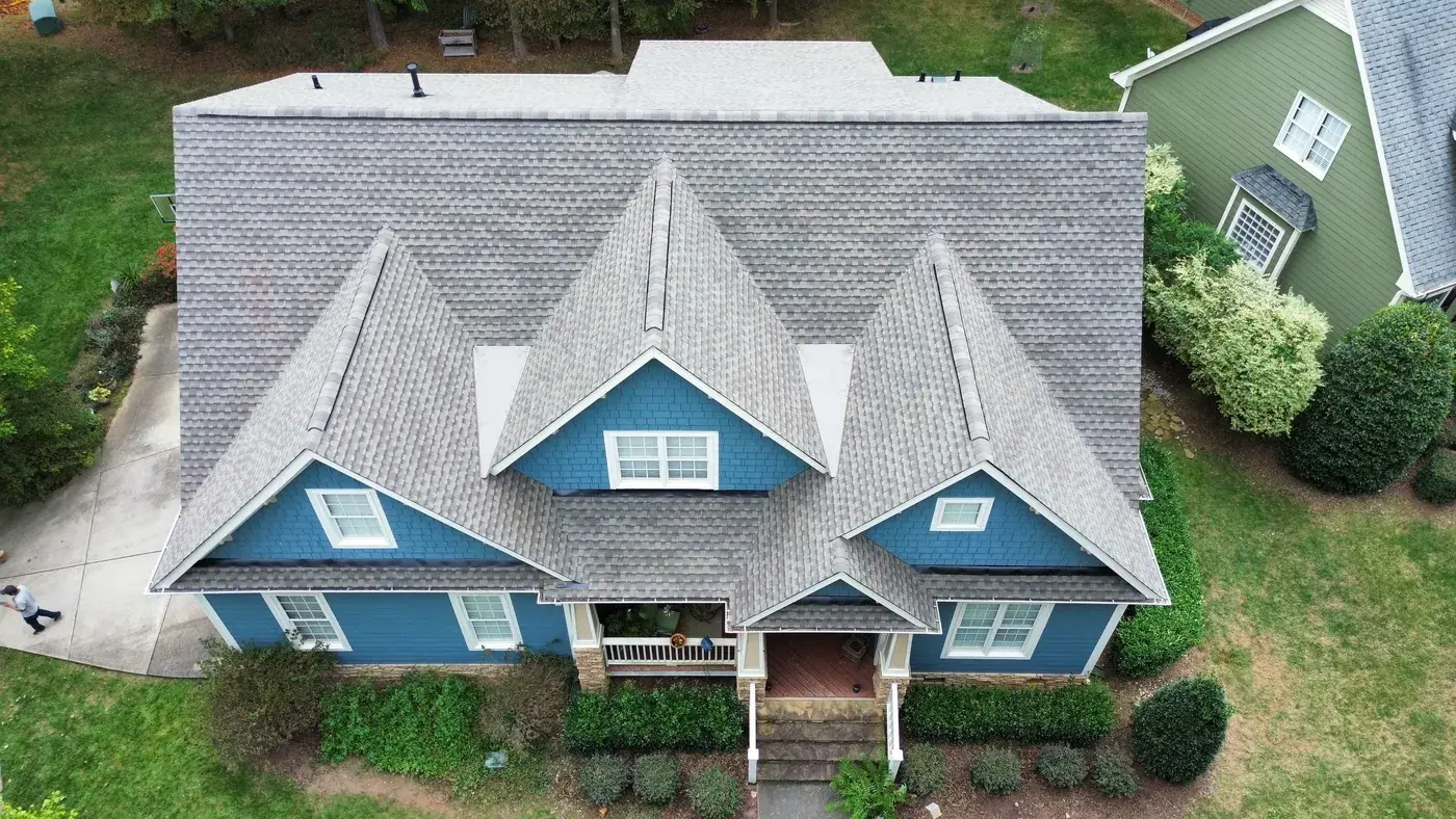 Chrismill Ln in Holly Springs is a striking two-story home in deep navy siding with crisp white trim, a covered front porch, and multiple front-facing gables stepping across the elevation. The 48 squares this took meant the team worked through several gable peaks and a porch tie-in with the kind of patience layered architecture deserves. We installed GAF Timberline Ultra HDZ in Weathered Wood. The warm tone reads beautifully against the dark navy walls and white trim, giving this confident home a roof that holds its ambition. Total project: $23,625, completed October 2025.