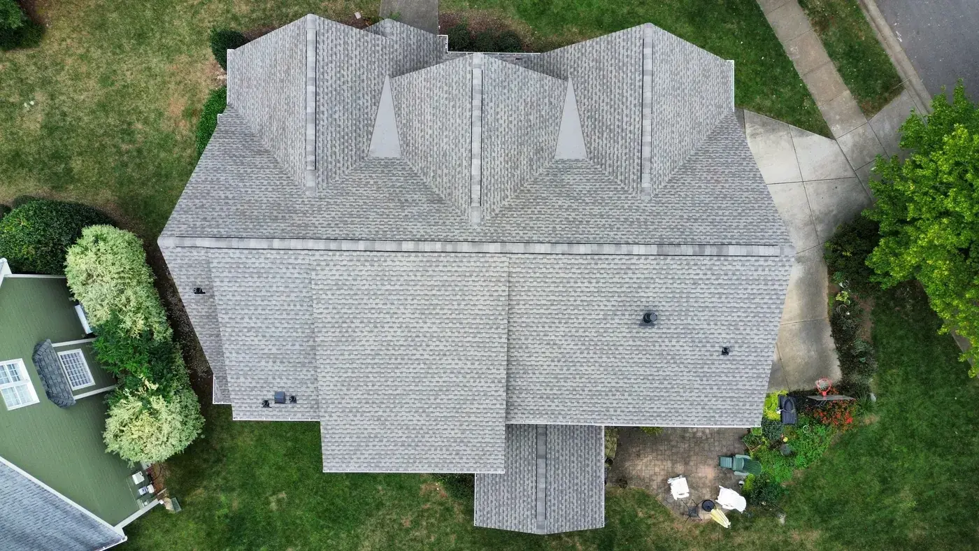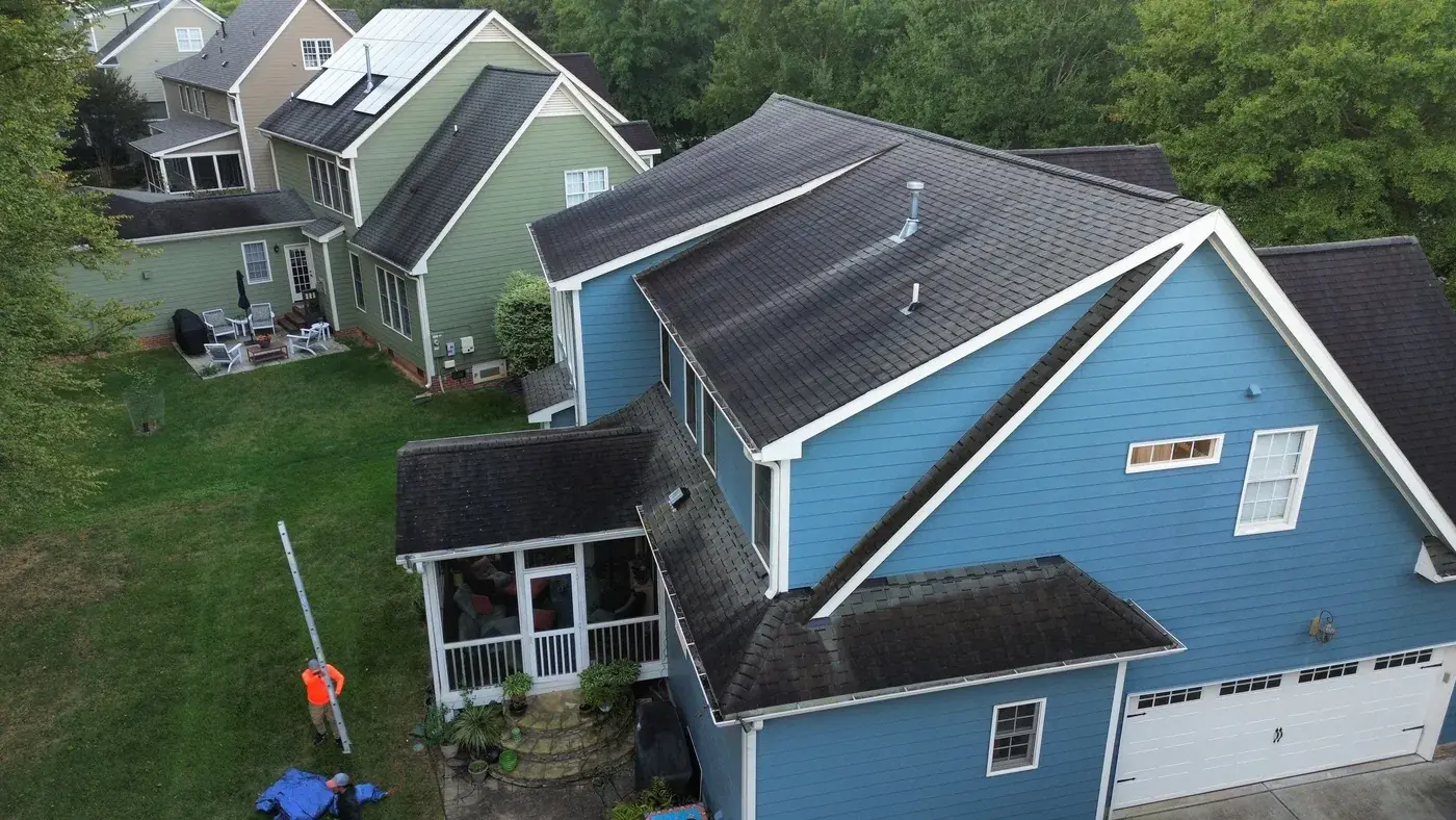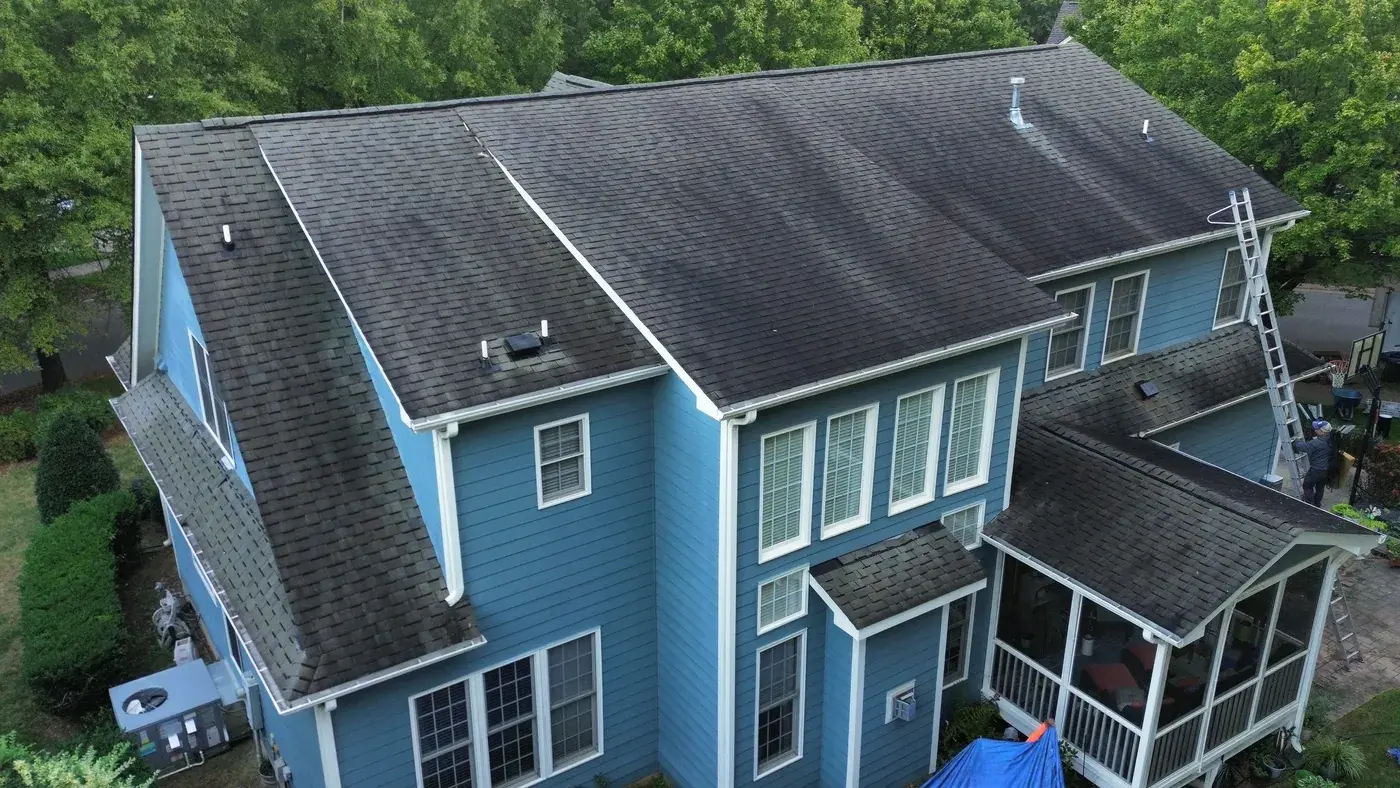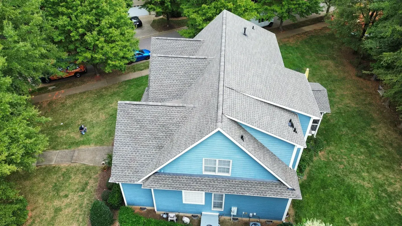 Chrismill Ln in Holly Springs is a striking two-story home in deep navy siding with crisp white trim, a covered front porch, and multiple front-facing gables stepping across the elevation. The 48 squares this took meant the team worked through several gable peaks and a porch tie-in with the kind of patience layered architecture deserves. We installed GAF Timberline Ultra HDZ in Weathered Wood. The warm tone reads beautifully against the dark navy walls and white trim, giving this confident home a roof that holds its ambition. Total project: $23,625, completed October 2025.
