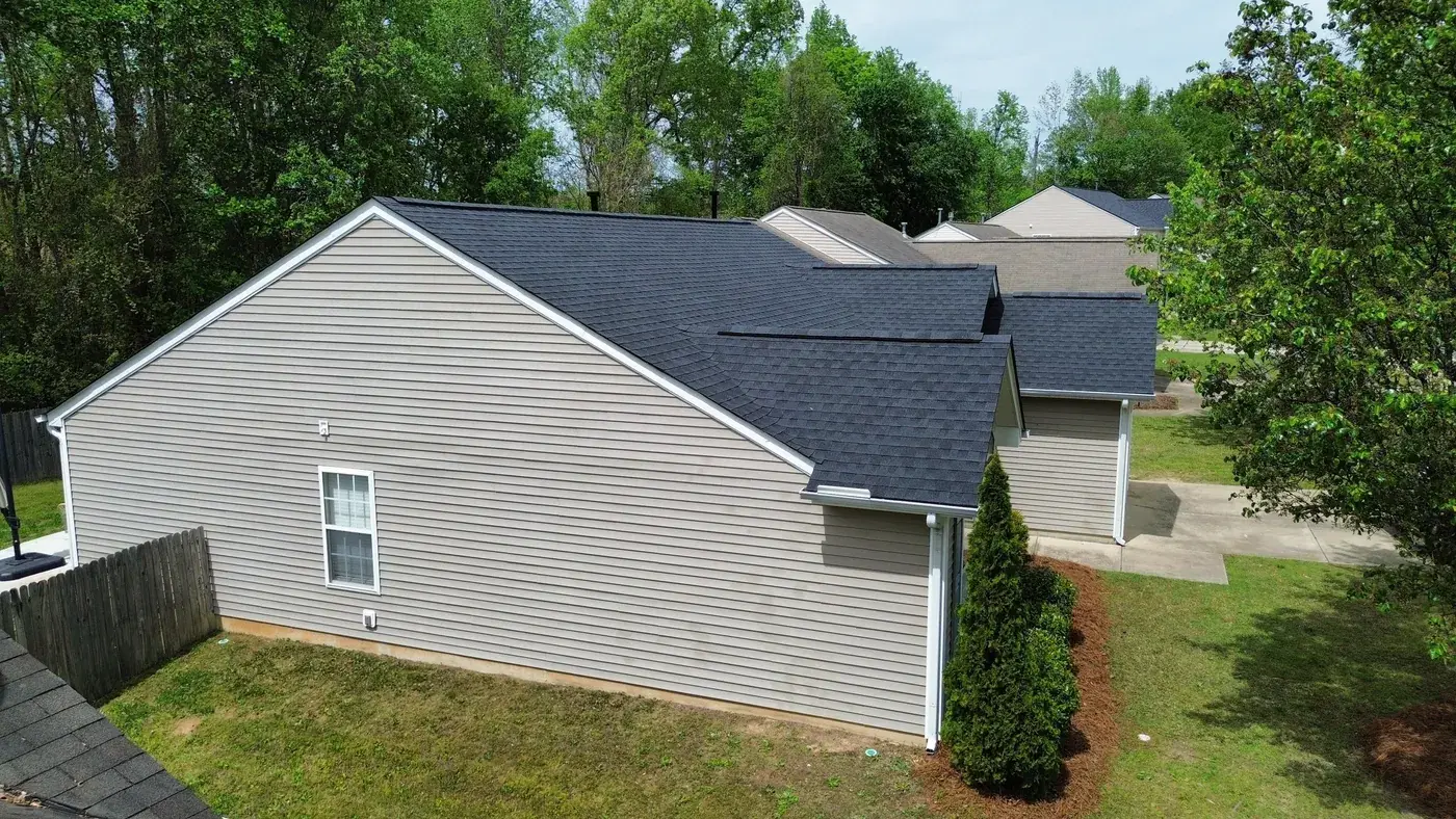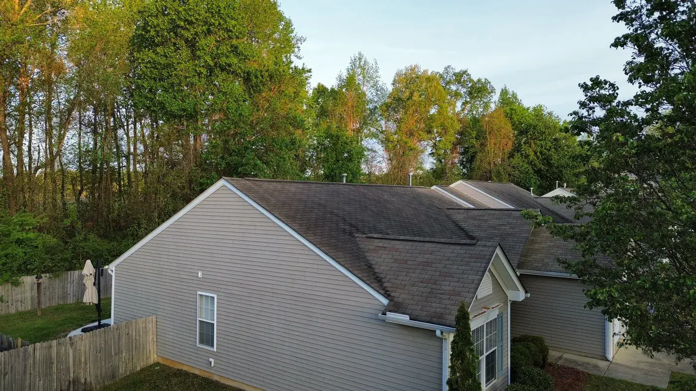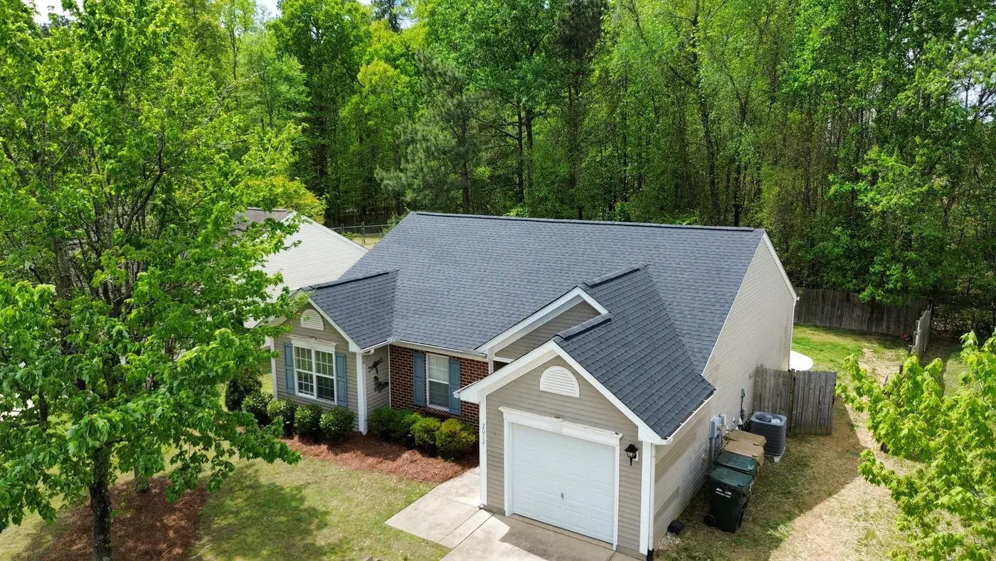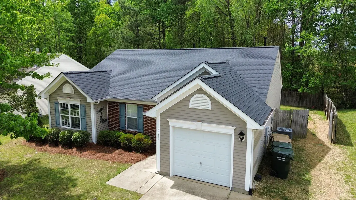 Day Flower Dr in Clayton is a tidy single-story ranch in white siding over partial brick, with an attached single-bay garage on the right and a simple gable roof spanning the home. The 23 squares this took came together quickly across one main plane and the garage tie-in. We installed GAF Timberline Natural Shadow in Charcoal. The dark color reads sharp against the white siding and warm brick band, and the simple roofline now wears a clean, well-finished crown. Total project: $8,470, completed April 2026.