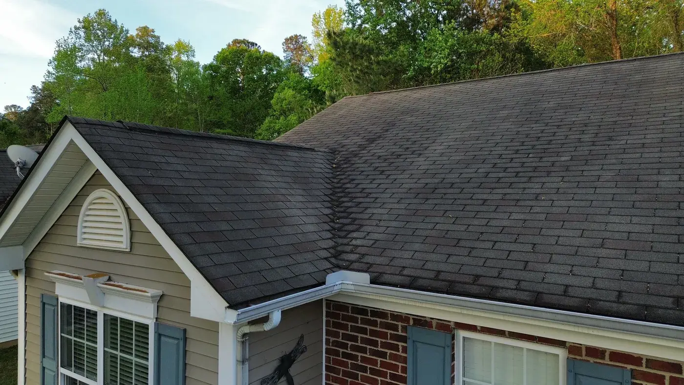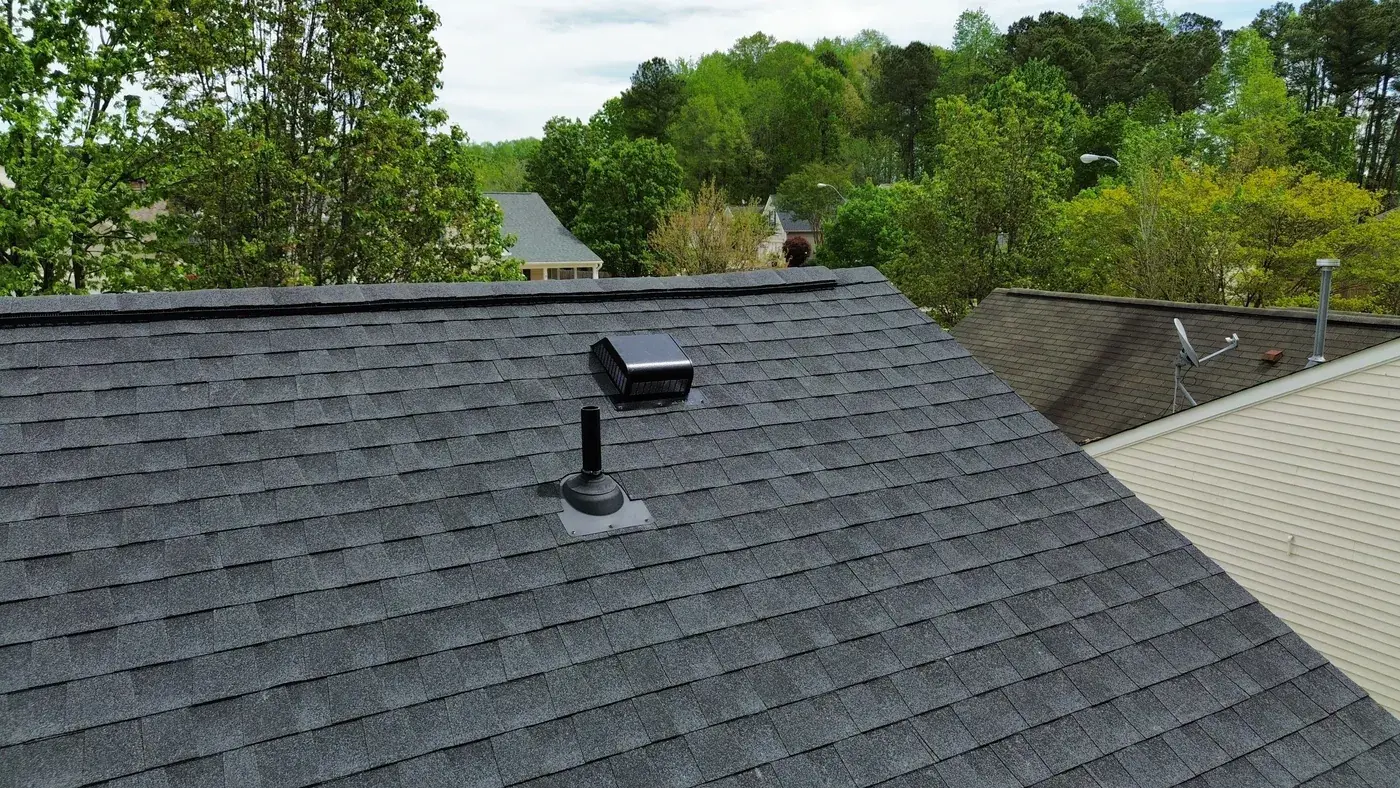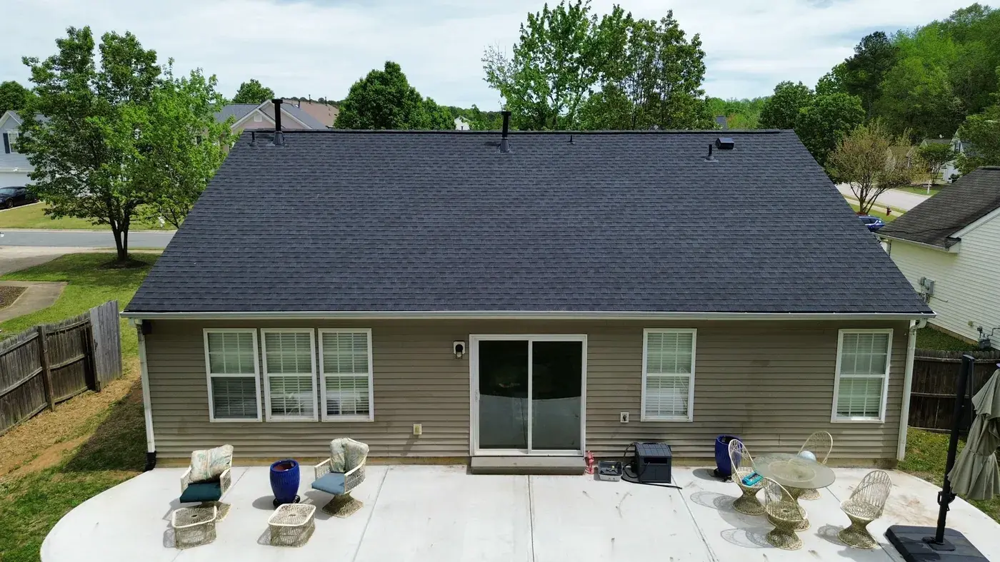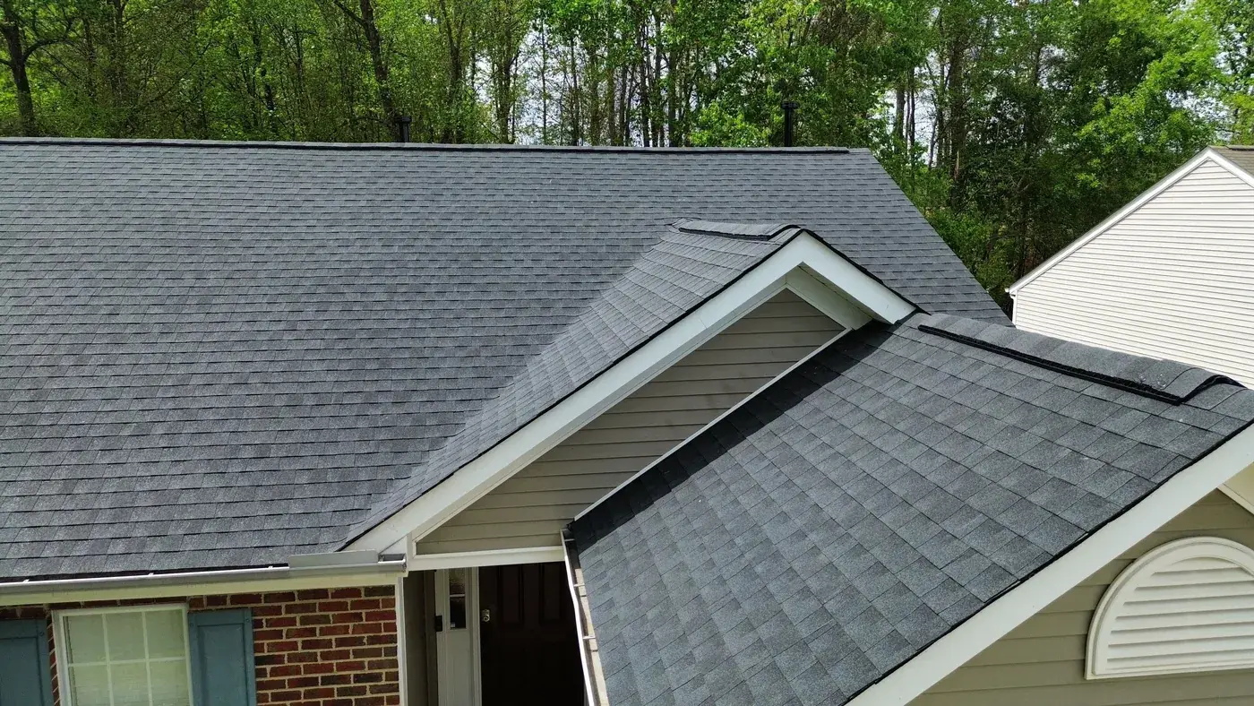 Day Flower Dr in Clayton is a tidy single-story ranch in white siding over partial brick, with an attached single-bay garage on the right and a simple gable roof spanning the home. The 23 squares this took came together quickly across one main plane and the garage tie-in. We installed GAF Timberline Natural Shadow in Charcoal. The dark color reads sharp against the white siding and warm brick band, and the simple roofline now wears a clean, well-finished crown. Total project: $8,470, completed April 2026.