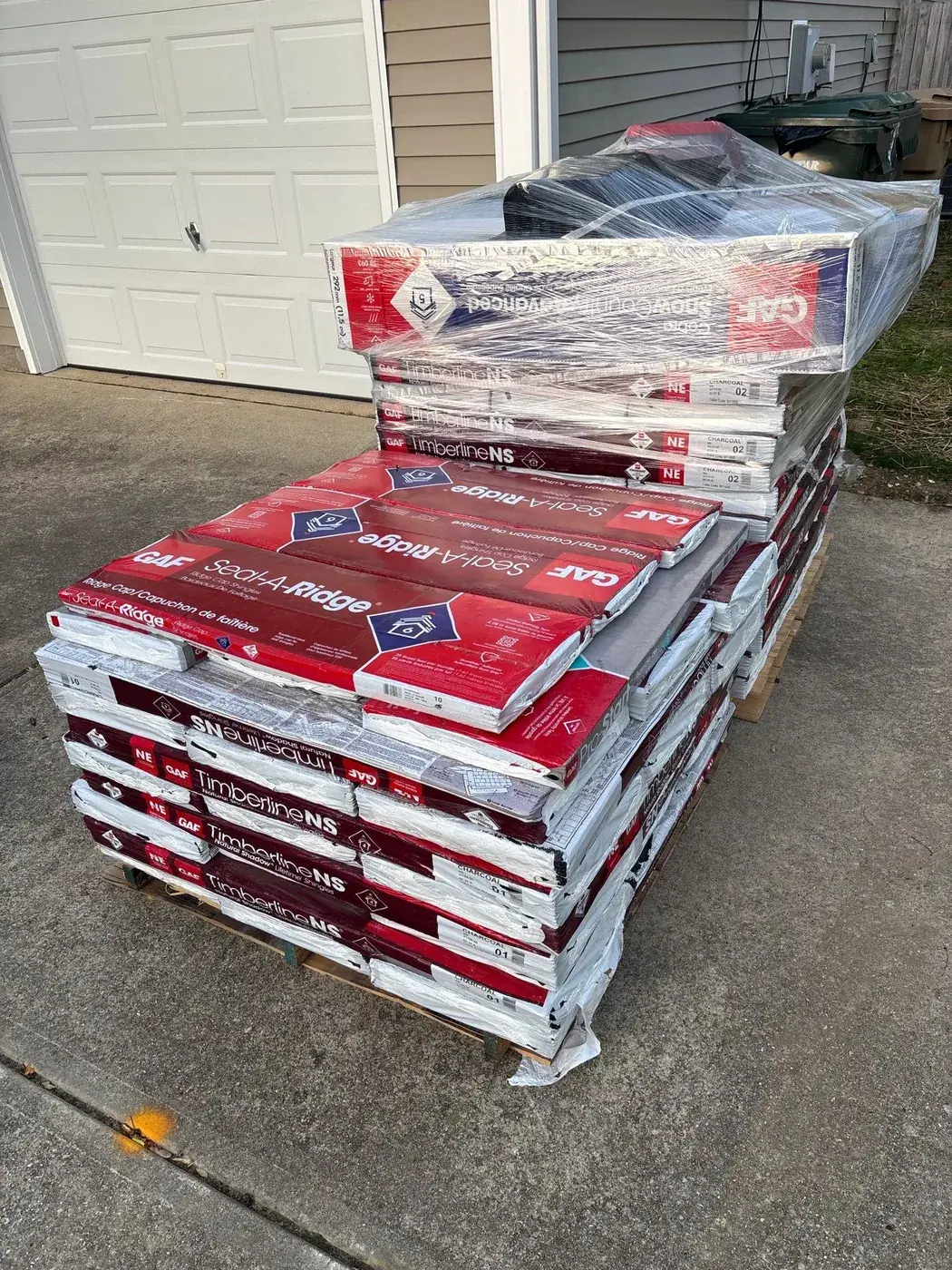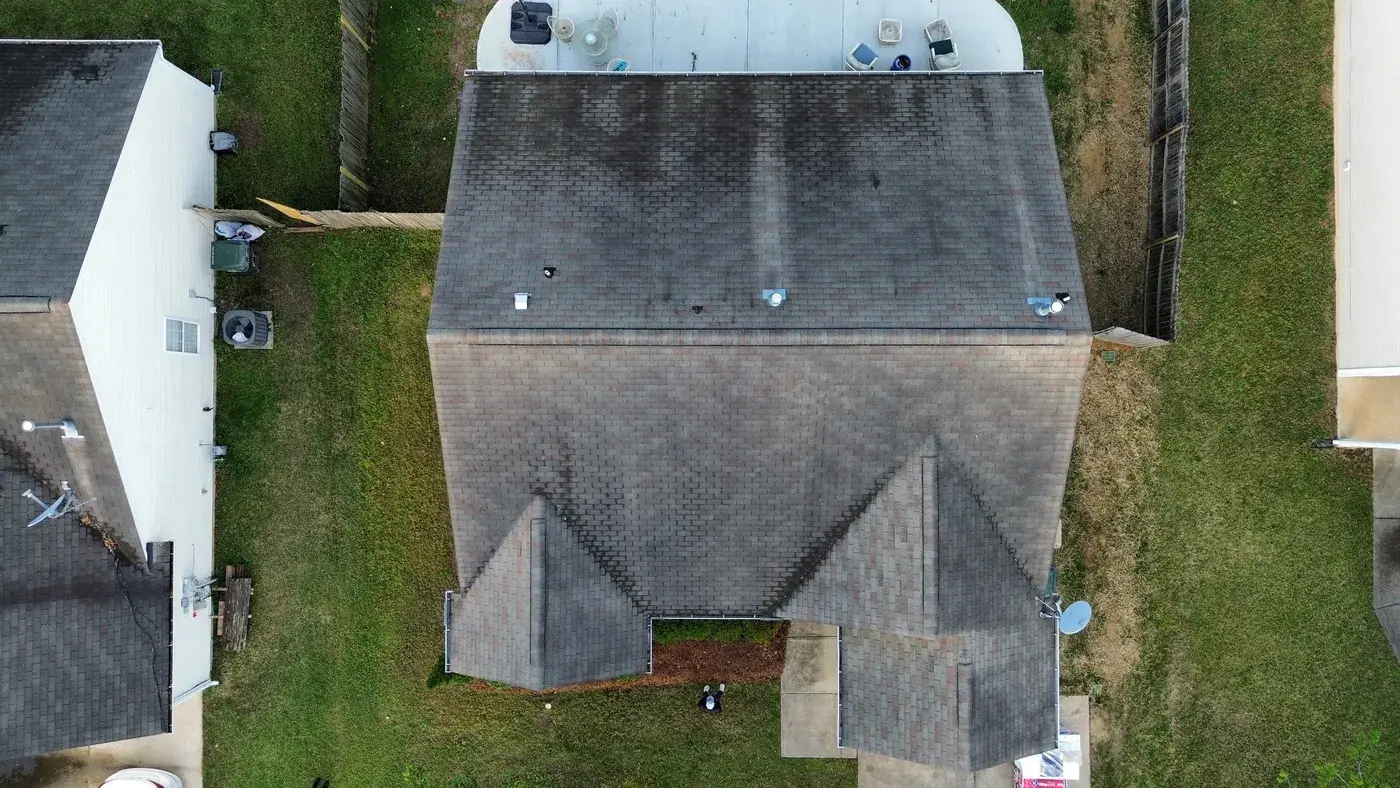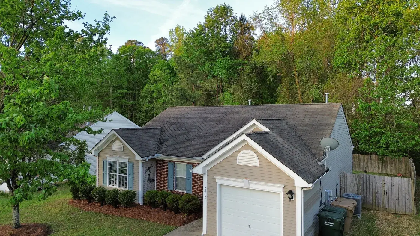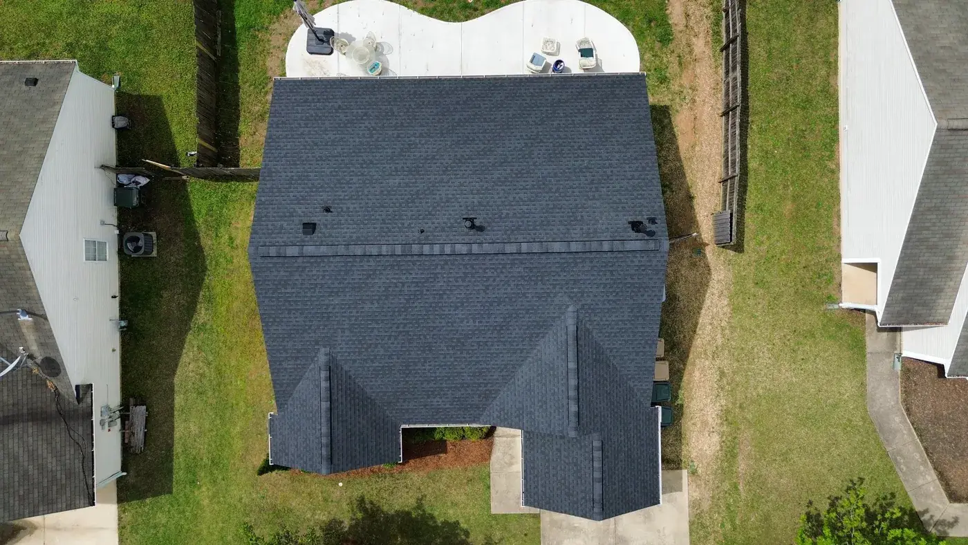 Day Flower Dr in Clayton is a tidy single-story ranch in white siding over partial brick, with an attached single-bay garage on the right and a simple gable roof spanning the home. The 23 squares this took came together quickly across one main plane and the garage tie-in. We installed GAF Timberline Natural Shadow in Charcoal. The dark color reads sharp against the white siding and warm brick band, and the simple roofline now wears a clean, well-finished crown. Total project: $8,470, completed April 2026.