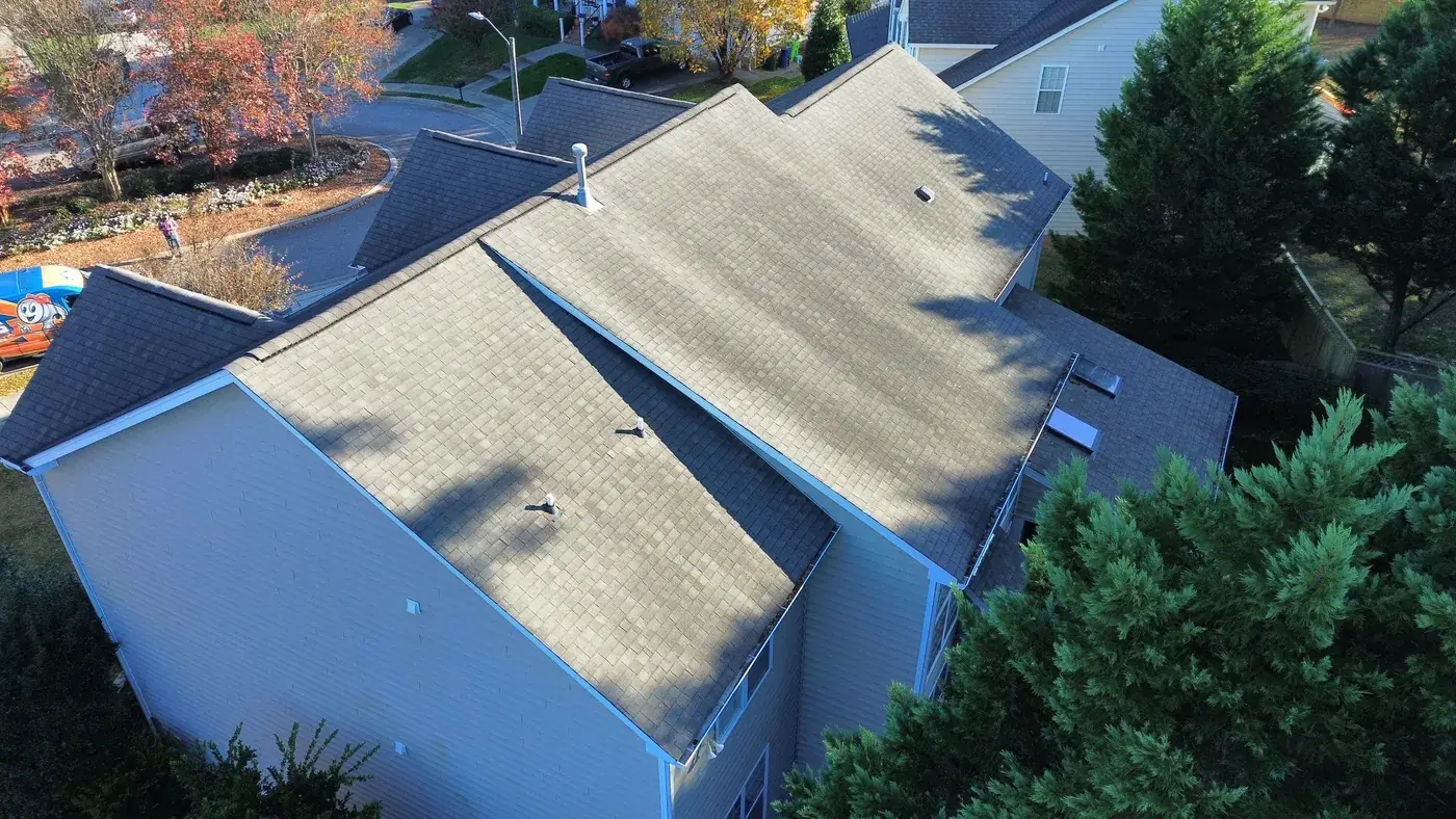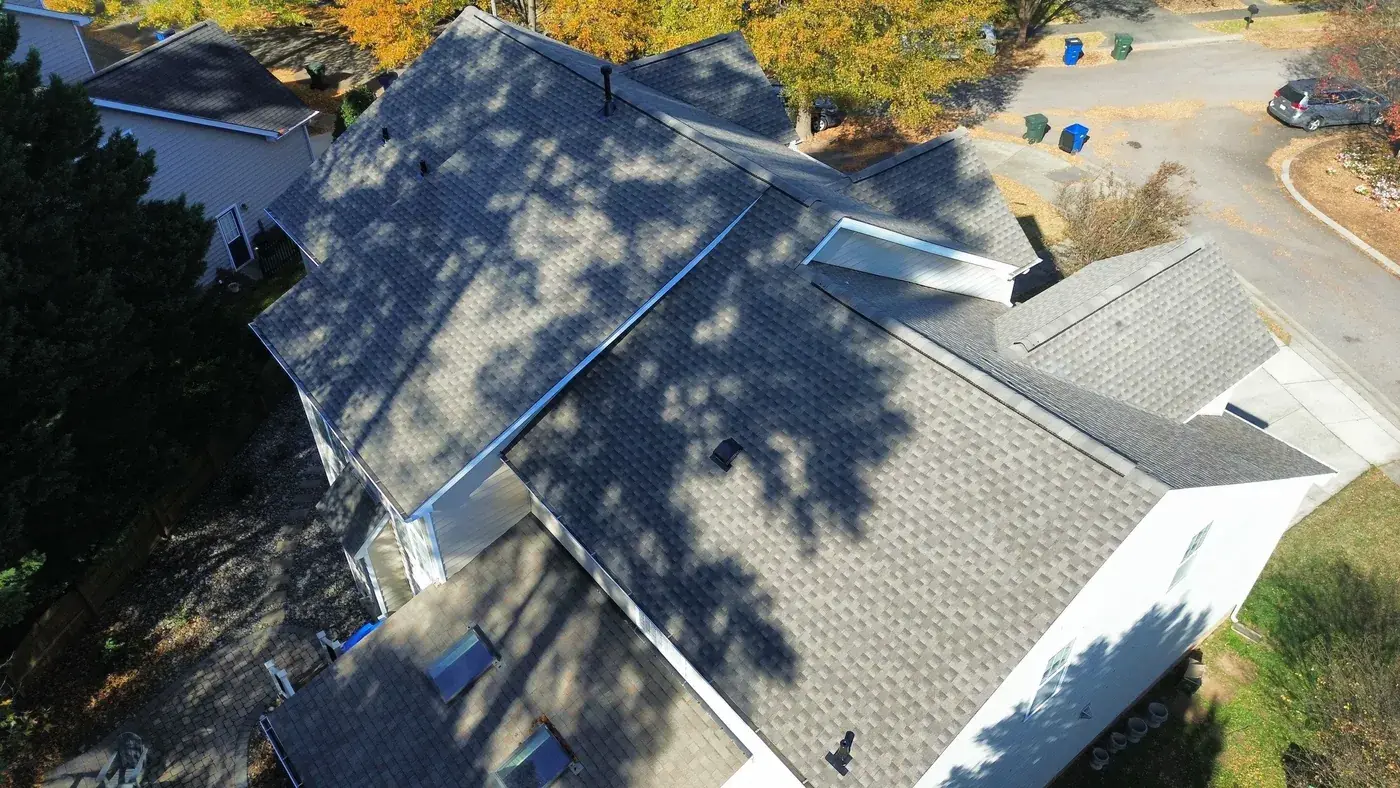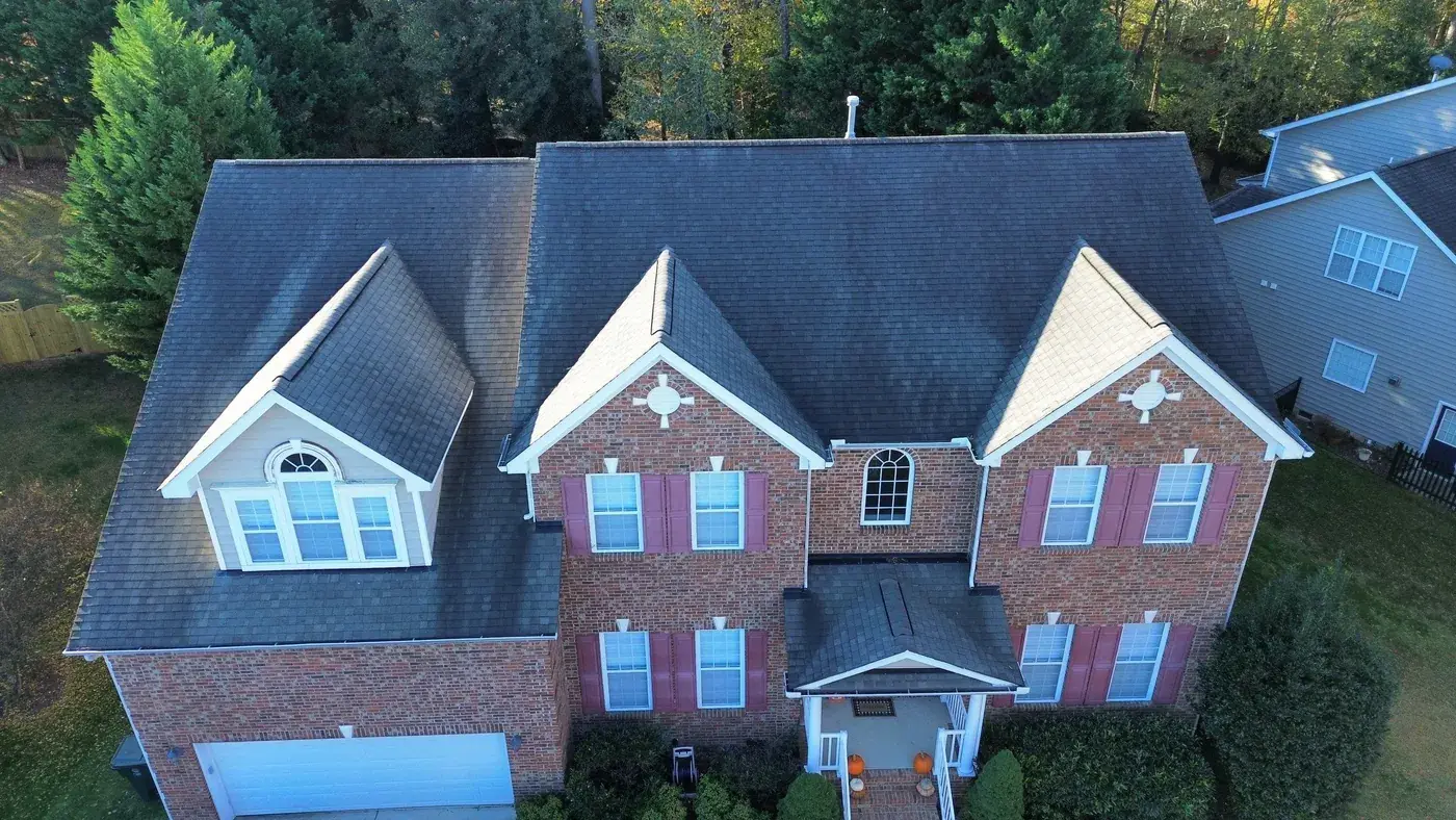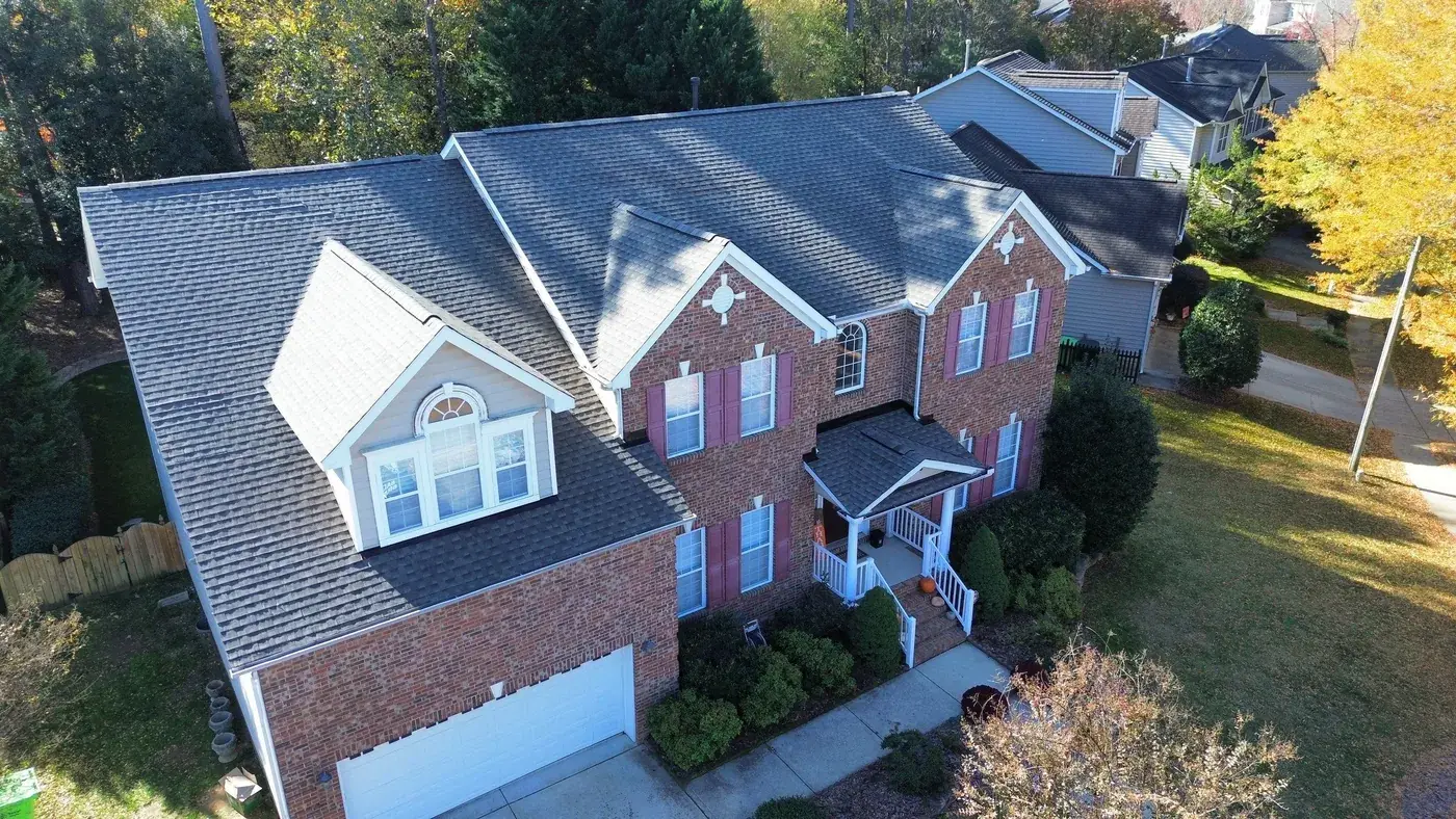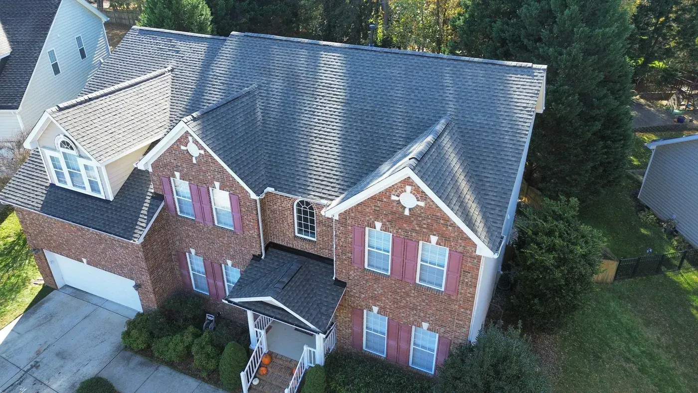 Debmoor Pl in Raleigh is a strong two-story brick home in classic red brick, finished with black shutters and a center front gable rising over the entry. With the garage gable on the left, the entry gable in the center, and the secondary gables flanking, this home has rhythm to its roof and we wanted the new shingle to honor that. We installed 39 squares of GAF Timberline HDZ in Weathered Wood. The warm gray-brown reads beautifully against the brick and gives the home a slightly softer top than the original. Total project: $17,760, completed November 2025.