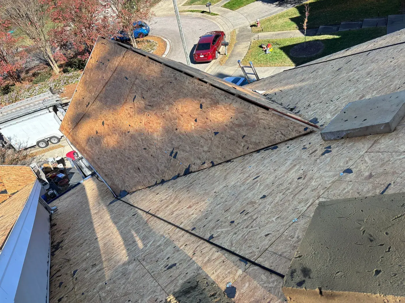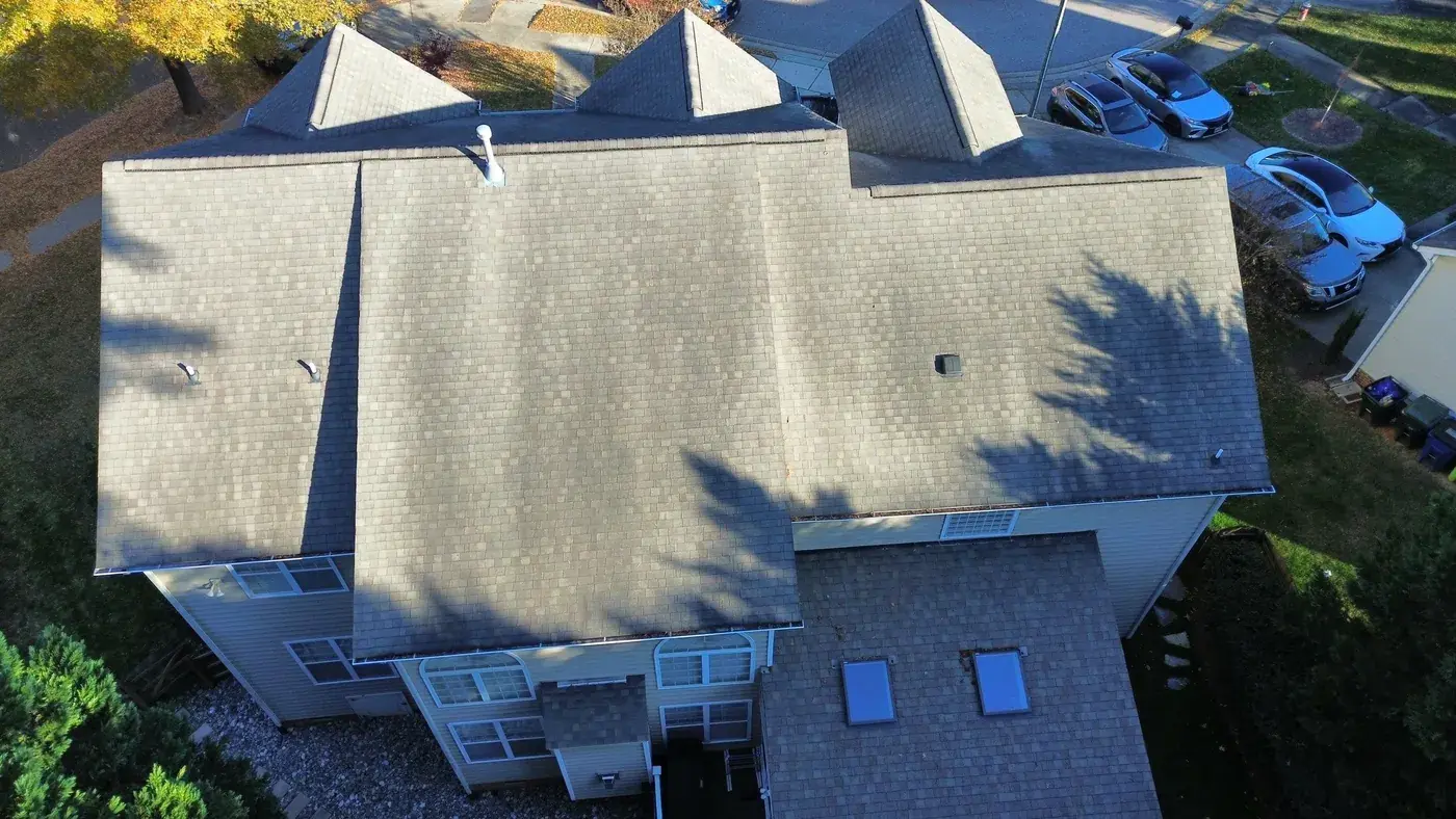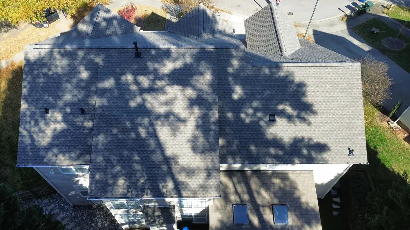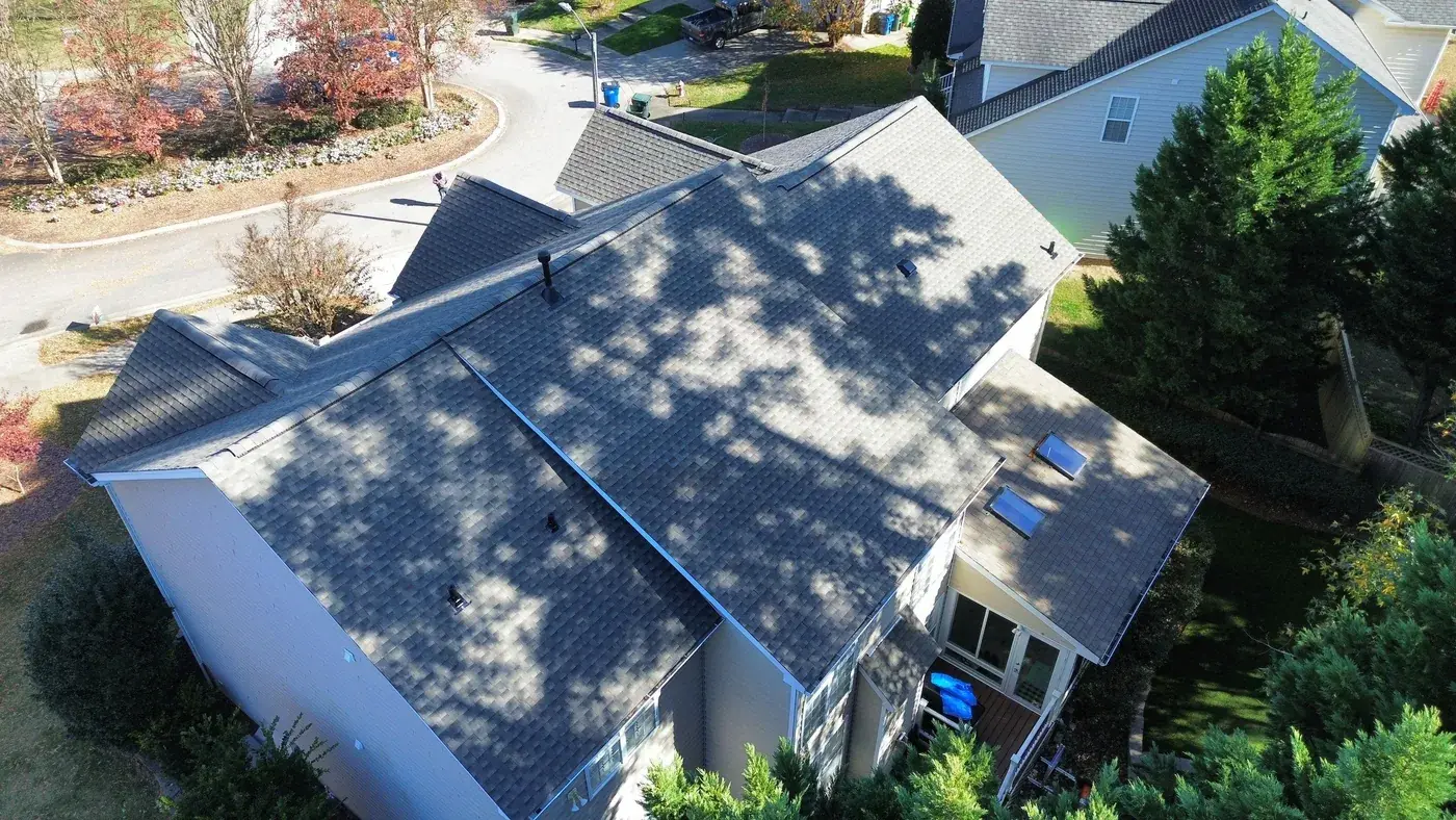 Debmoor Pl in Raleigh is a strong two-story brick home in classic red brick, finished with black shutters and a center front gable rising over the entry. With the garage gable on the left, the entry gable in the center, and the secondary gables flanking, this home has rhythm to its roof and we wanted the new shingle to honor that. We installed 39 squares of GAF Timberline HDZ in Weathered Wood. The warm gray-brown reads beautifully against the brick and gives the home a slightly softer top than the original. Total project: $17,760, completed November 2025.