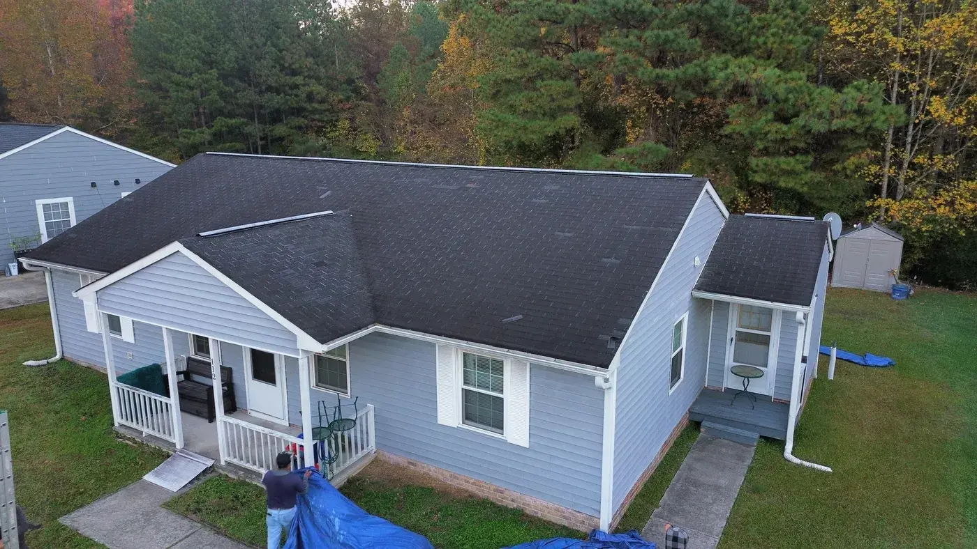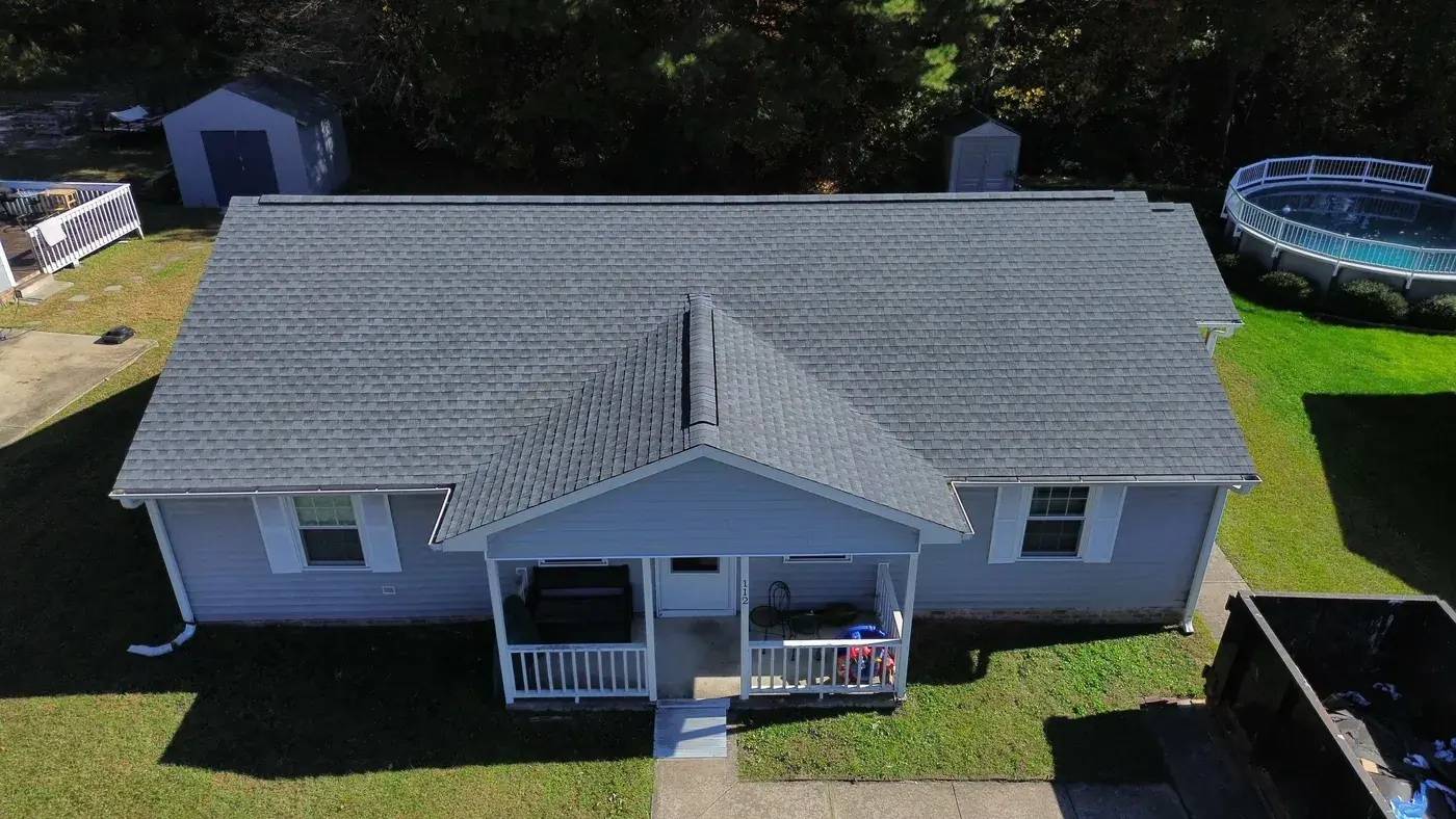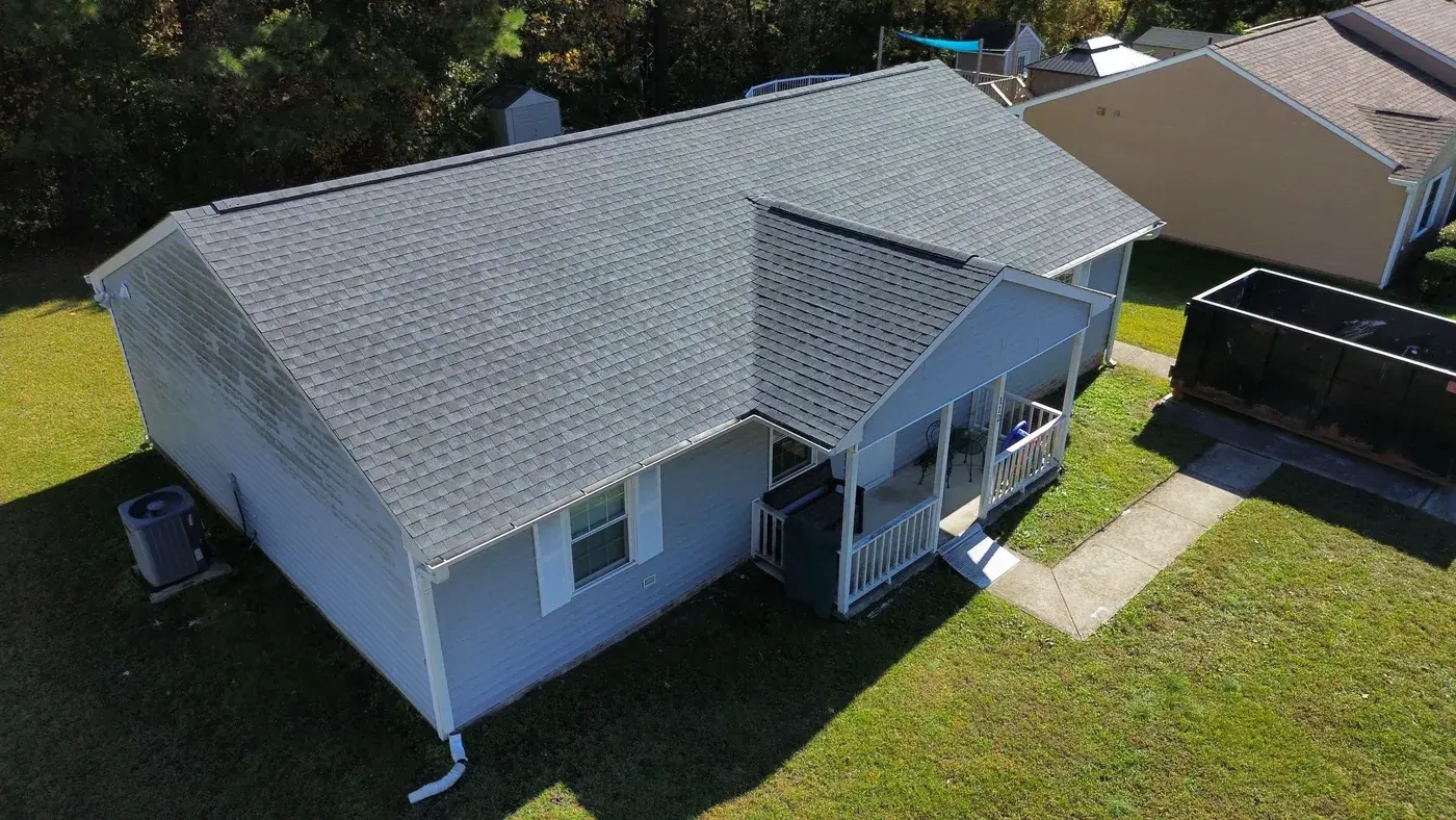 Deep Forest Dr in Durham is a clean single-story ranch in white siding with a covered porch tucked under a small front gable and a long side wing extending the home. With 21 squares to install, the project came together quickly while still calling for careful flashing where the porch gable meets the main roof. We installed GAF Timberline HDZ in Pewter Gray. The cool tone reads softly against the white siding and gives the home a fresh, modern top without changing its character. Total project: $9,680, completed November 2025.