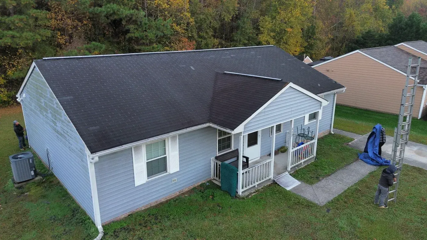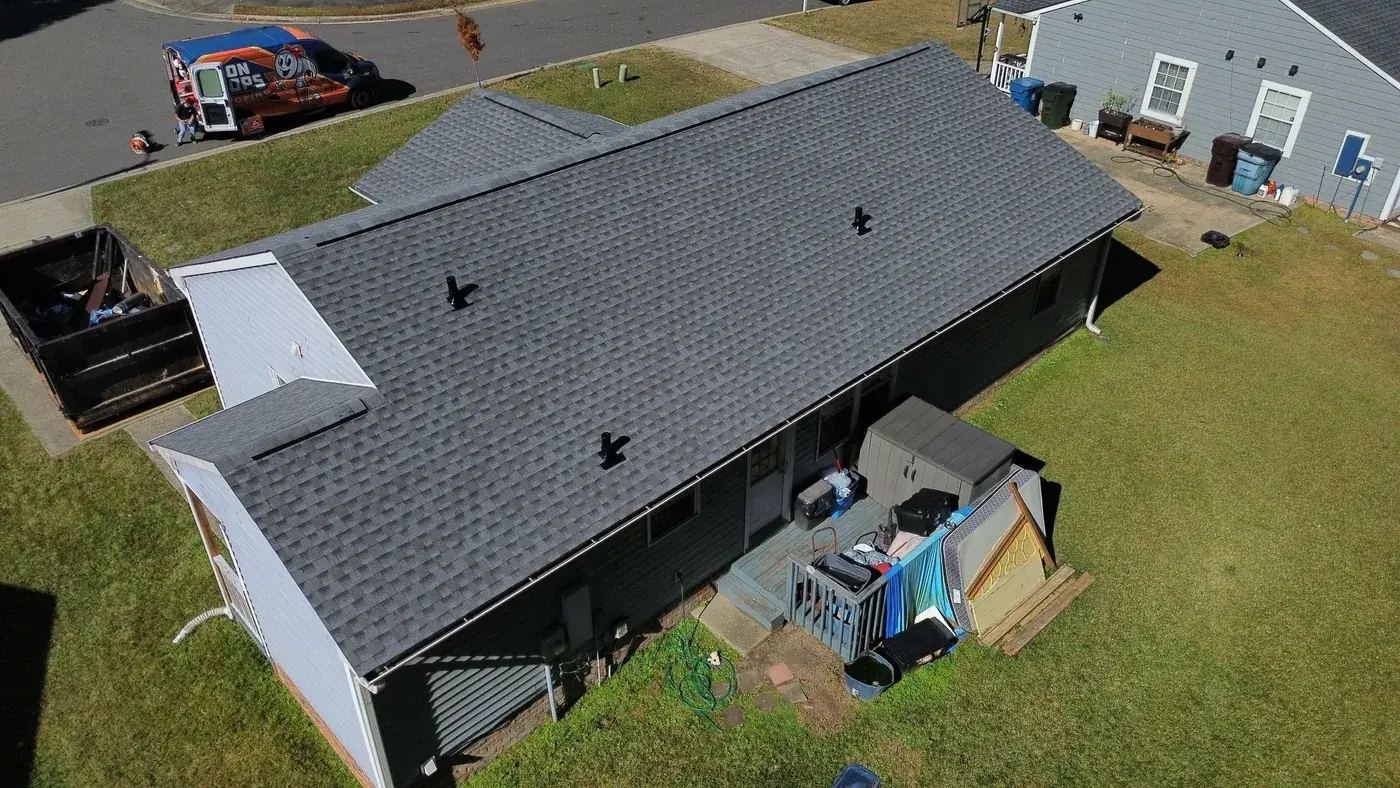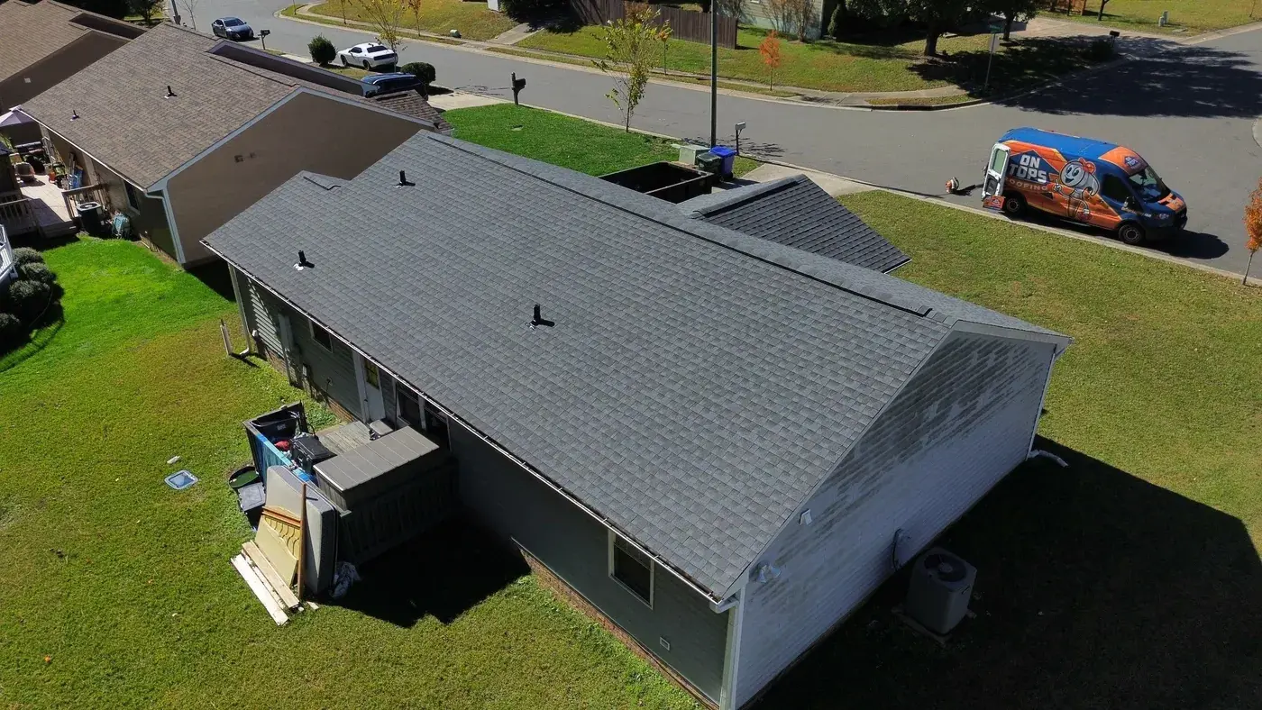Deep Forest Dr in Durham is a clean single-story ranch in white siding with a covered porch tucked under a small front gable and a long side wing extending the home. With 21 squares to install, the project came together quickly while still calling for careful flashing where the porch gable meets the main roof. We installed GAF Timberline HDZ in Pewter Gray. The cool tone reads softly against the white siding and gives the home a fresh, modern top without changing its character. Total project: $9,680, completed November 2025.