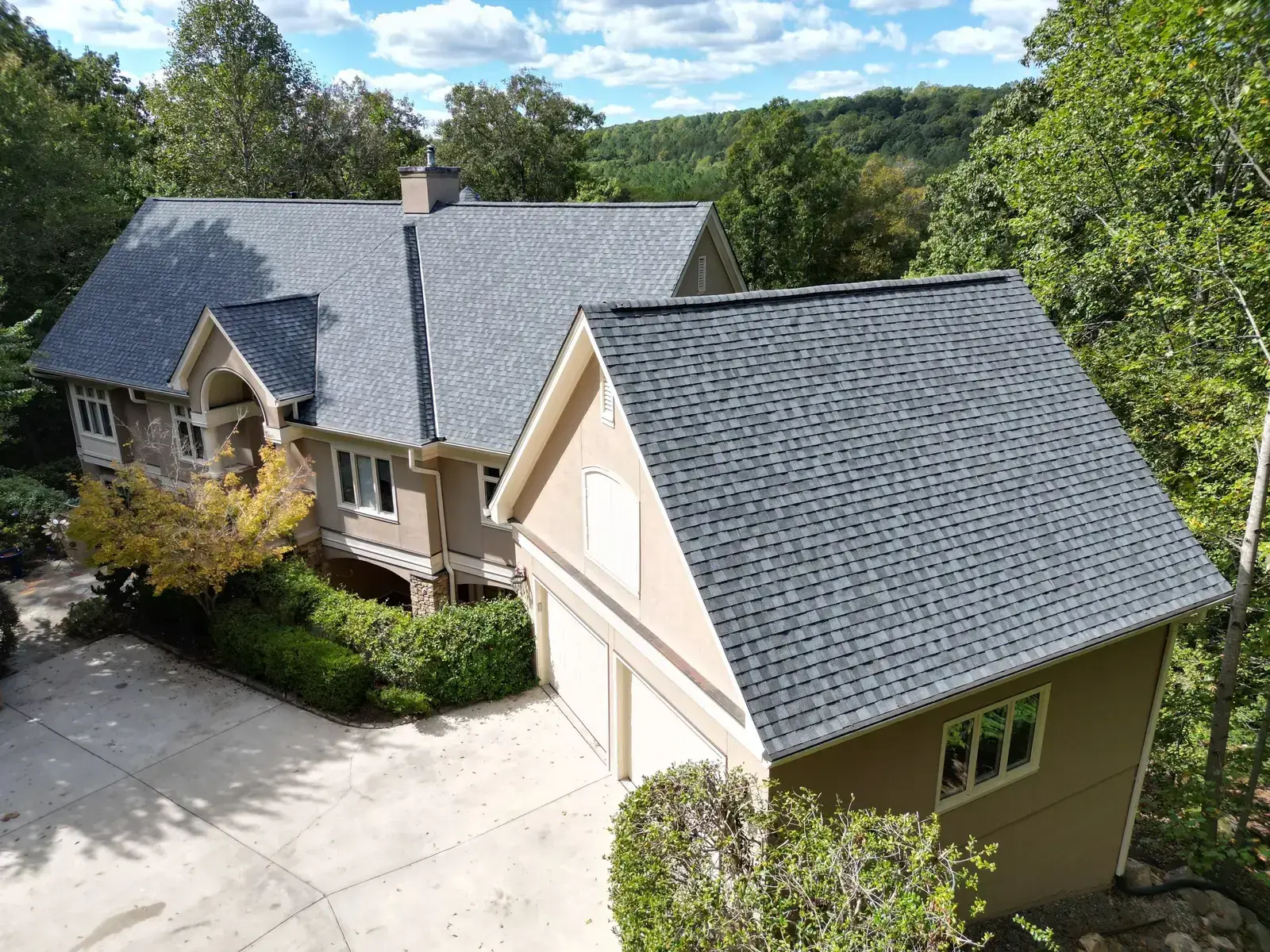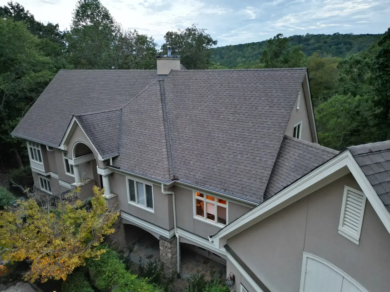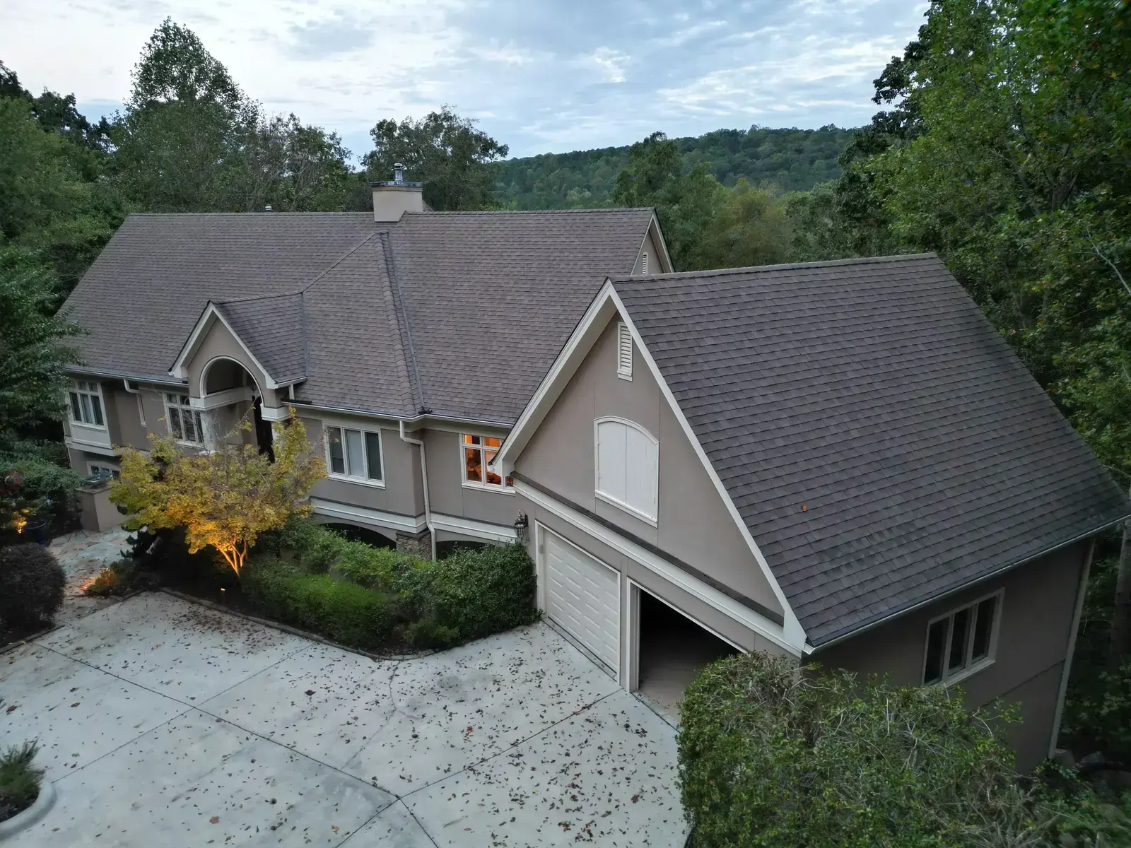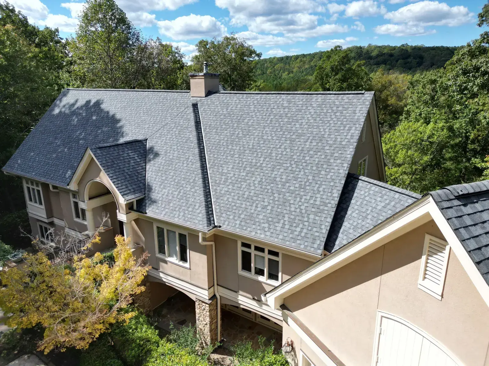 Glenn Glade in Chapel Hill is one of the most striking homes we have worked on, a stucco-and-stone estate in warm earth tones, multiple steeply pitched gables, and rolling Governors Club hills behind it. The 58 squares this called for had to handle one of the steeper garage gables we have shingled, plus the chimney and several intersecting valleys. We installed CertainTeed Landmark Pro in Pewter Gray. The cool gray reads beautifully against the warm stone and stucco, and the high pitches now catch light cleanly along every line. Total project: $35,375, completed October 2025.