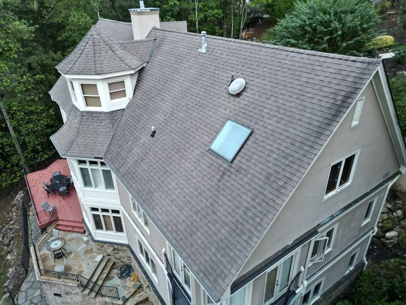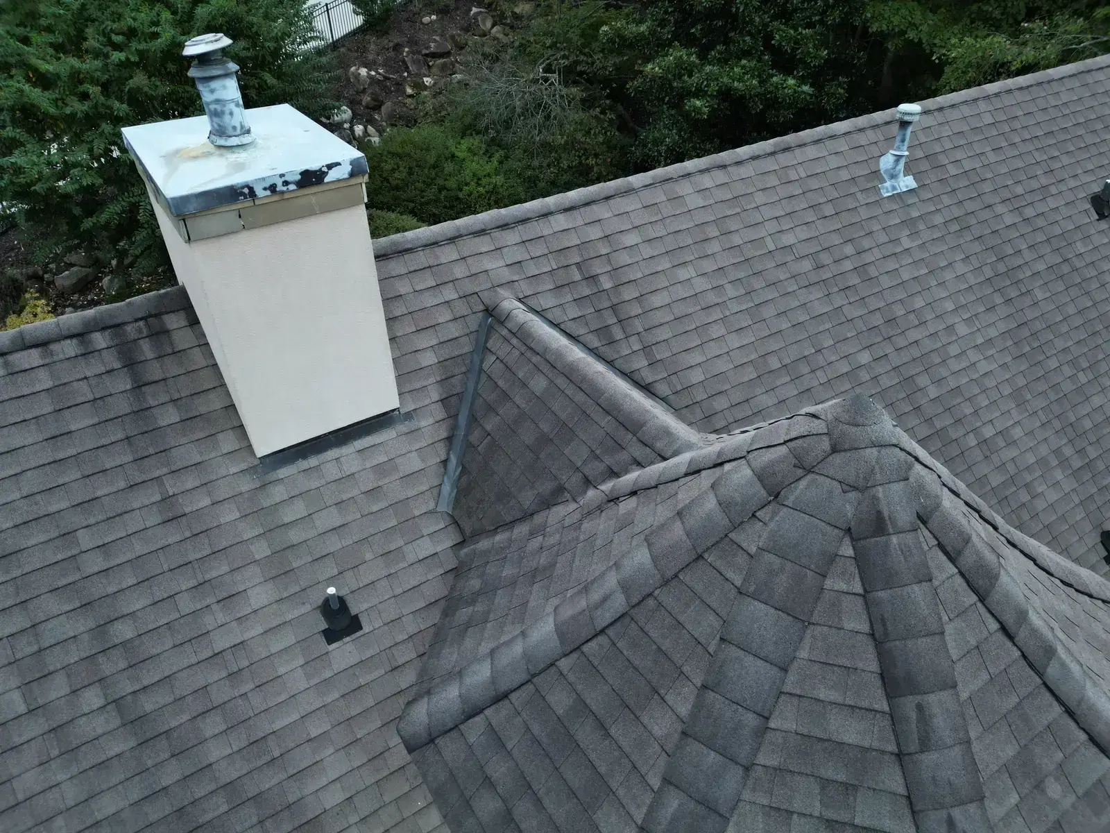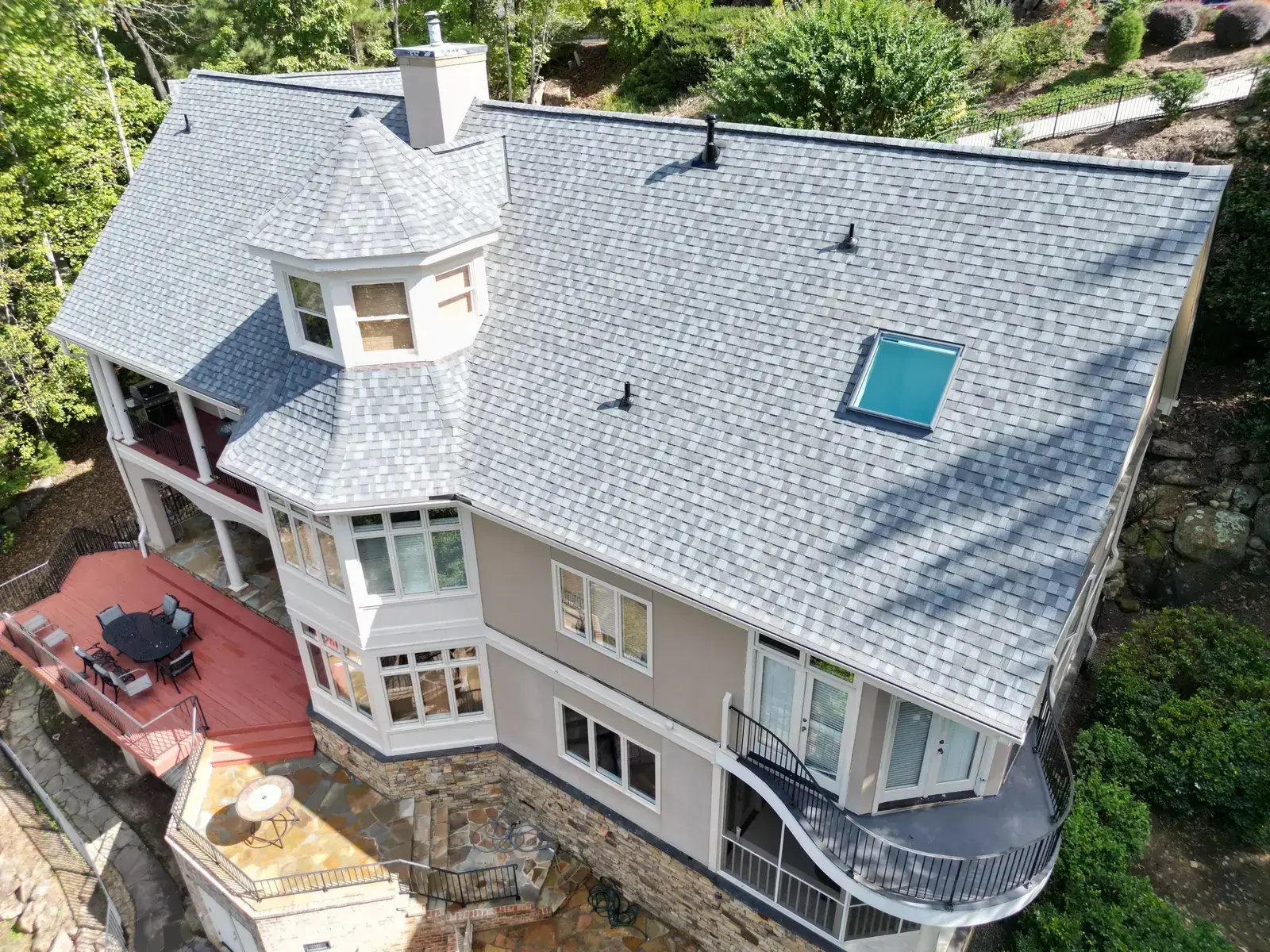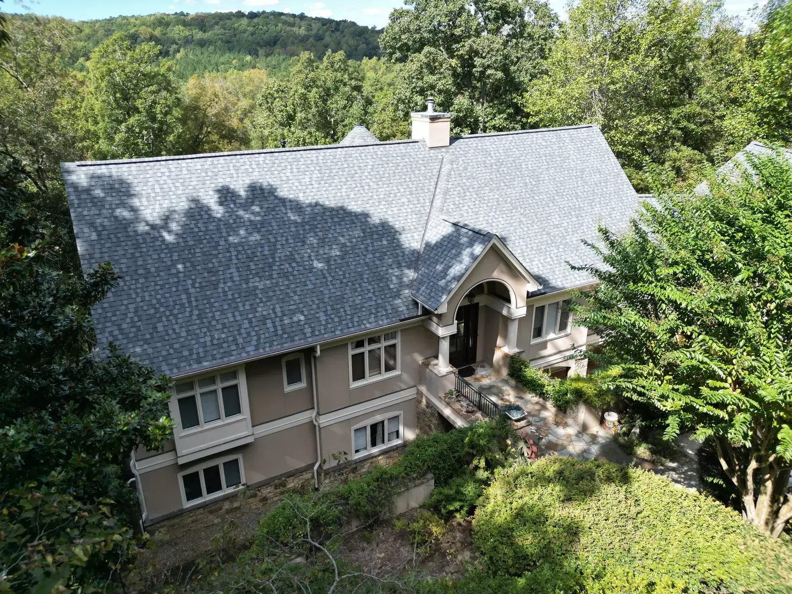 Glenn Glade in Chapel Hill is one of the most striking homes we have worked on, a stucco-and-stone estate in warm earth tones, multiple steeply pitched gables, and rolling Governors Club hills behind it. The 58 squares this called for had to handle one of the steeper garage gables we have shingled, plus the chimney and several intersecting valleys. We installed CertainTeed Landmark Pro in Pewter Gray. The cool gray reads beautifully against the warm stone and stucco, and the high pitches now catch light cleanly along every line. Total project: $35,375, completed October 2025.