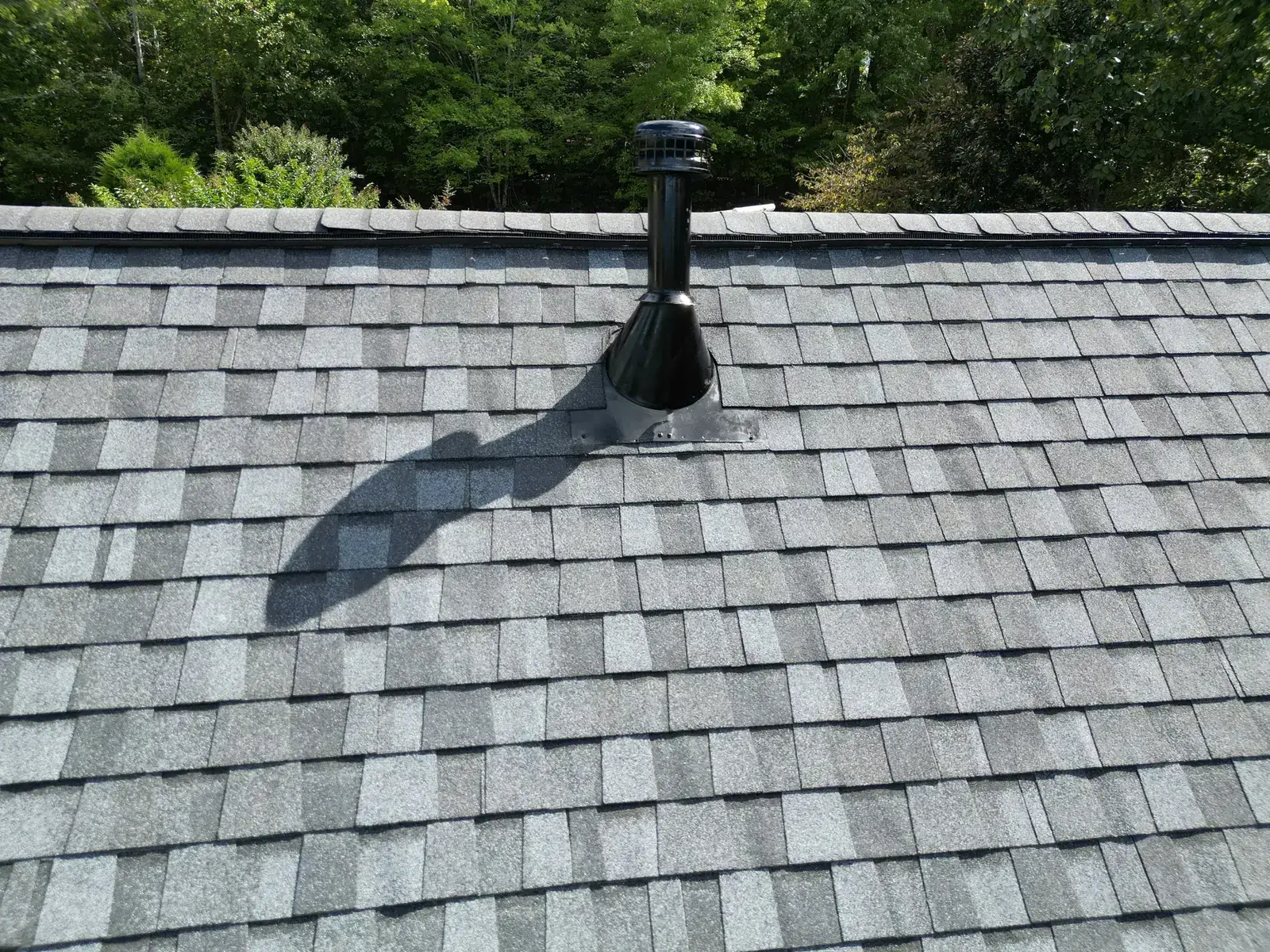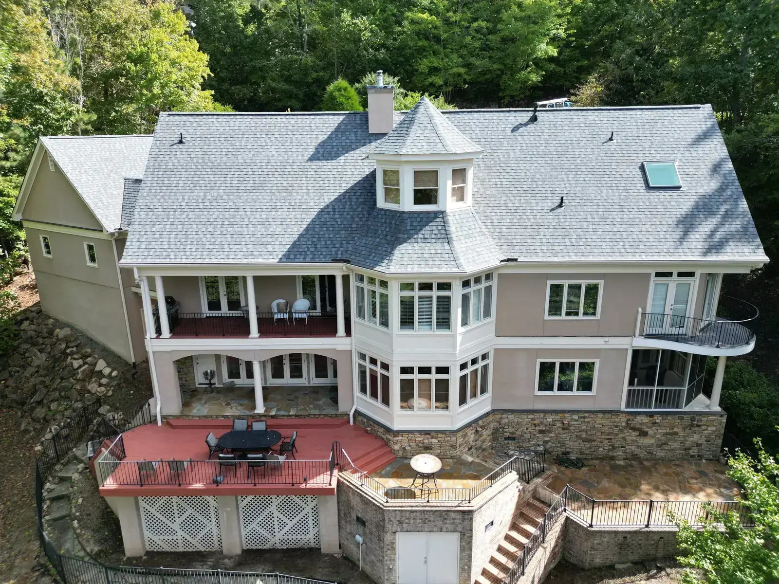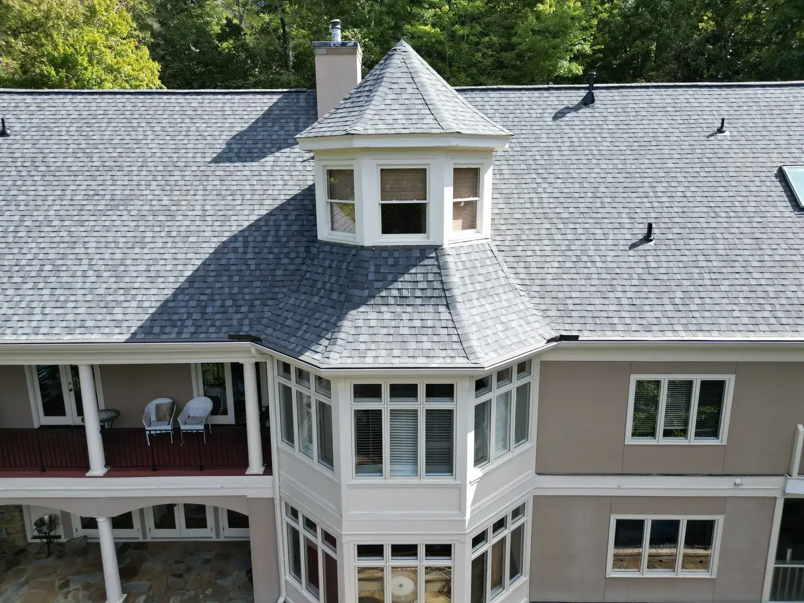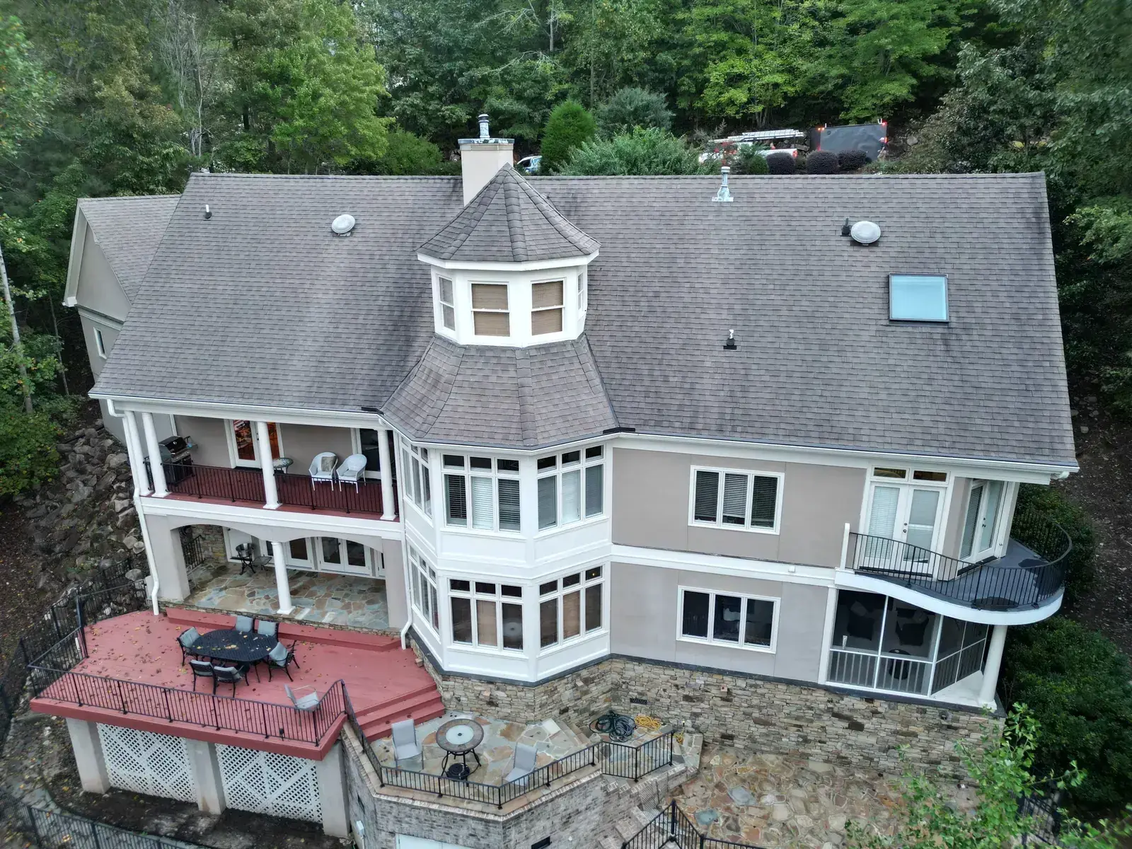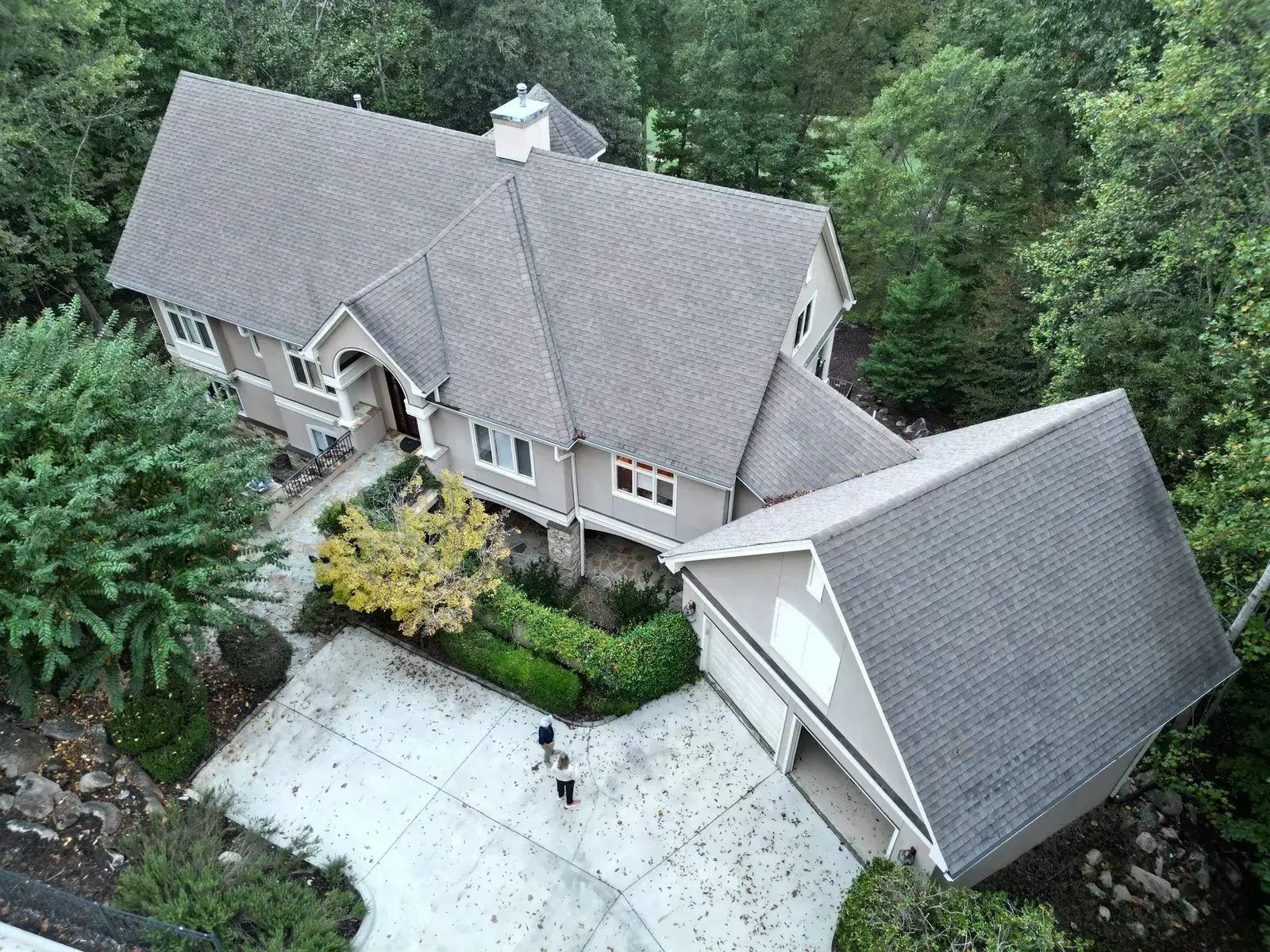 Glenn Glade in Chapel Hill is one of the most striking homes we have worked on, a stucco-and-stone estate in warm earth tones, multiple steeply pitched gables, and rolling Governors Club hills behind it. The 58 squares this called for had to handle one of the steeper garage gables we have shingled, plus the chimney and several intersecting valleys. We installed CertainTeed Landmark Pro in Pewter Gray. The cool gray reads beautifully against the warm stone and stucco, and the high pitches now catch light cleanly along every line. Total project: $35,375, completed October 2025.