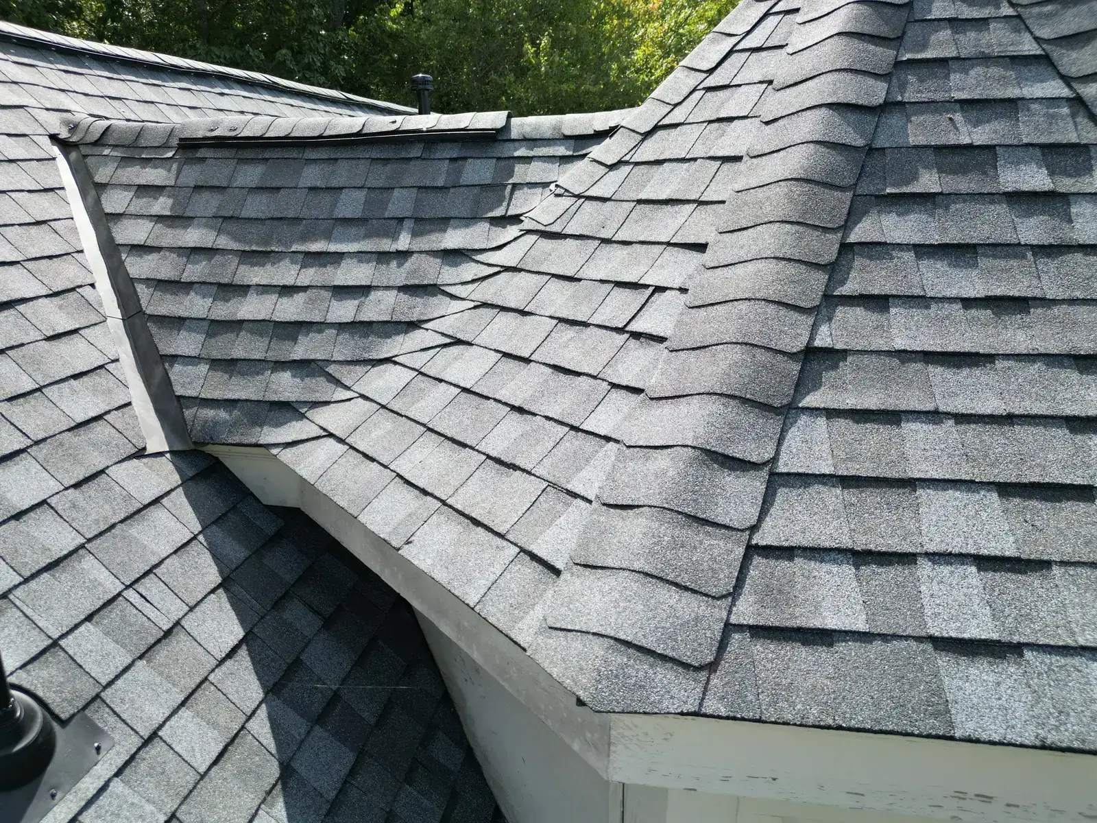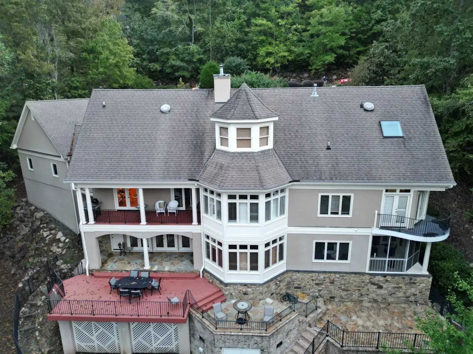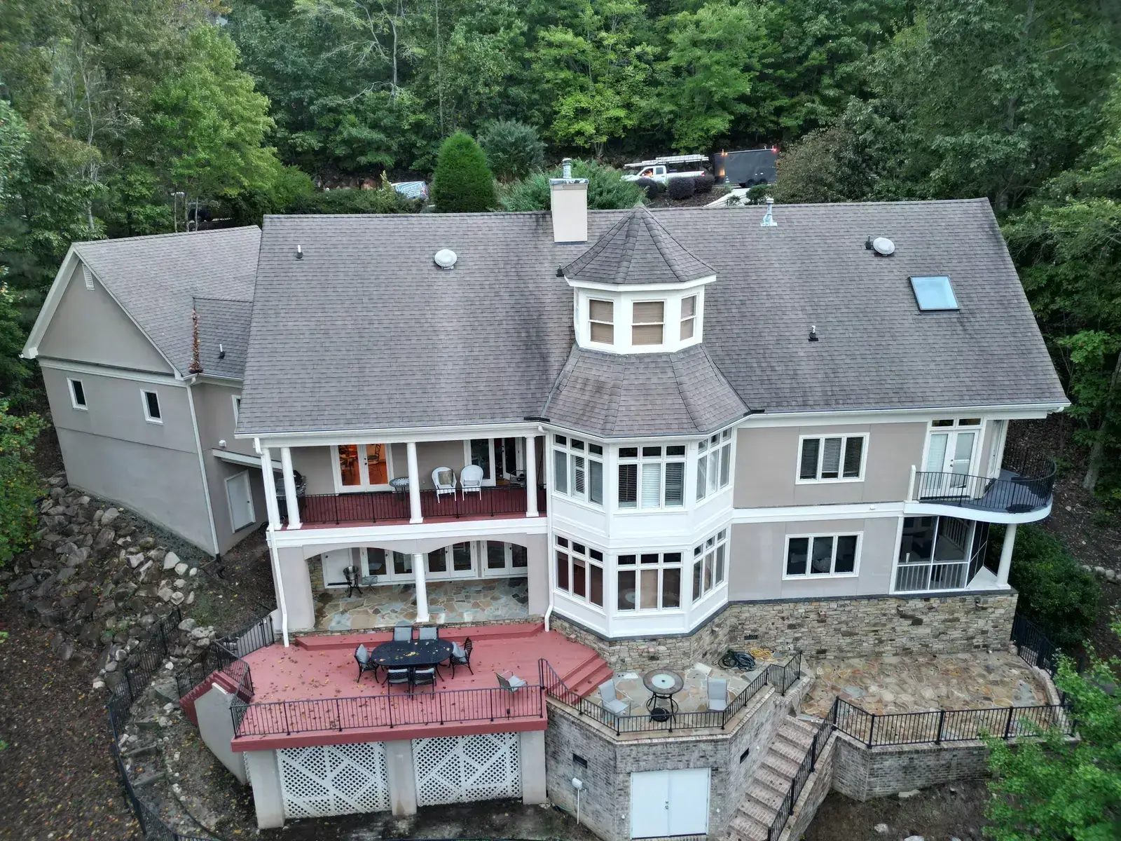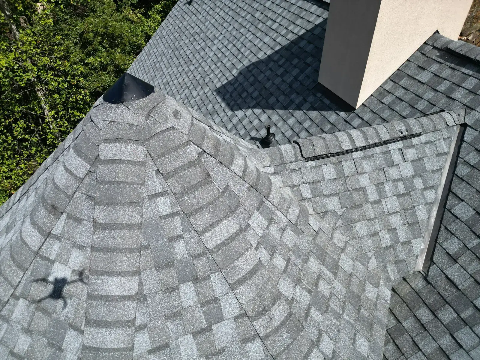 Glenn Glade in Chapel Hill is one of the most striking homes we have worked on, a stucco-and-stone estate in warm earth tones, multiple steeply pitched gables, and rolling Governors Club hills behind it. The 58 squares this called for had to handle one of the steeper garage gables we have shingled, plus the chimney and several intersecting valleys. We installed CertainTeed Landmark Pro in Pewter Gray. The cool gray reads beautifully against the warm stone and stucco, and the high pitches now catch light cleanly along every line. Total project: $35,375, completed October 2025.