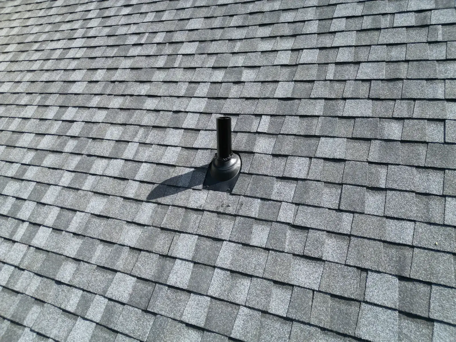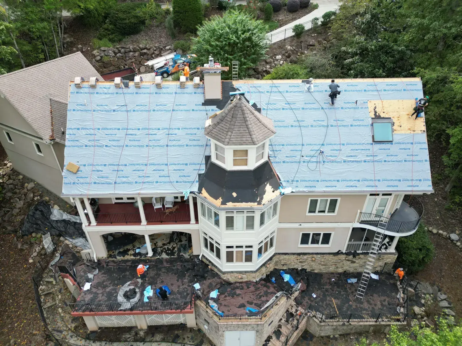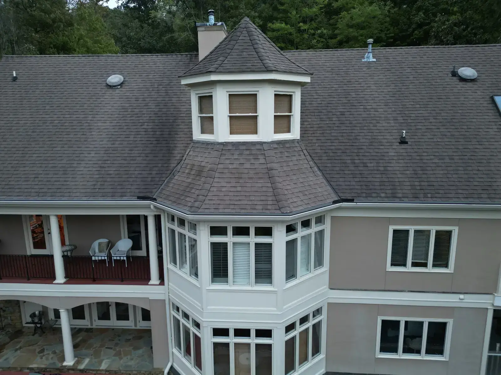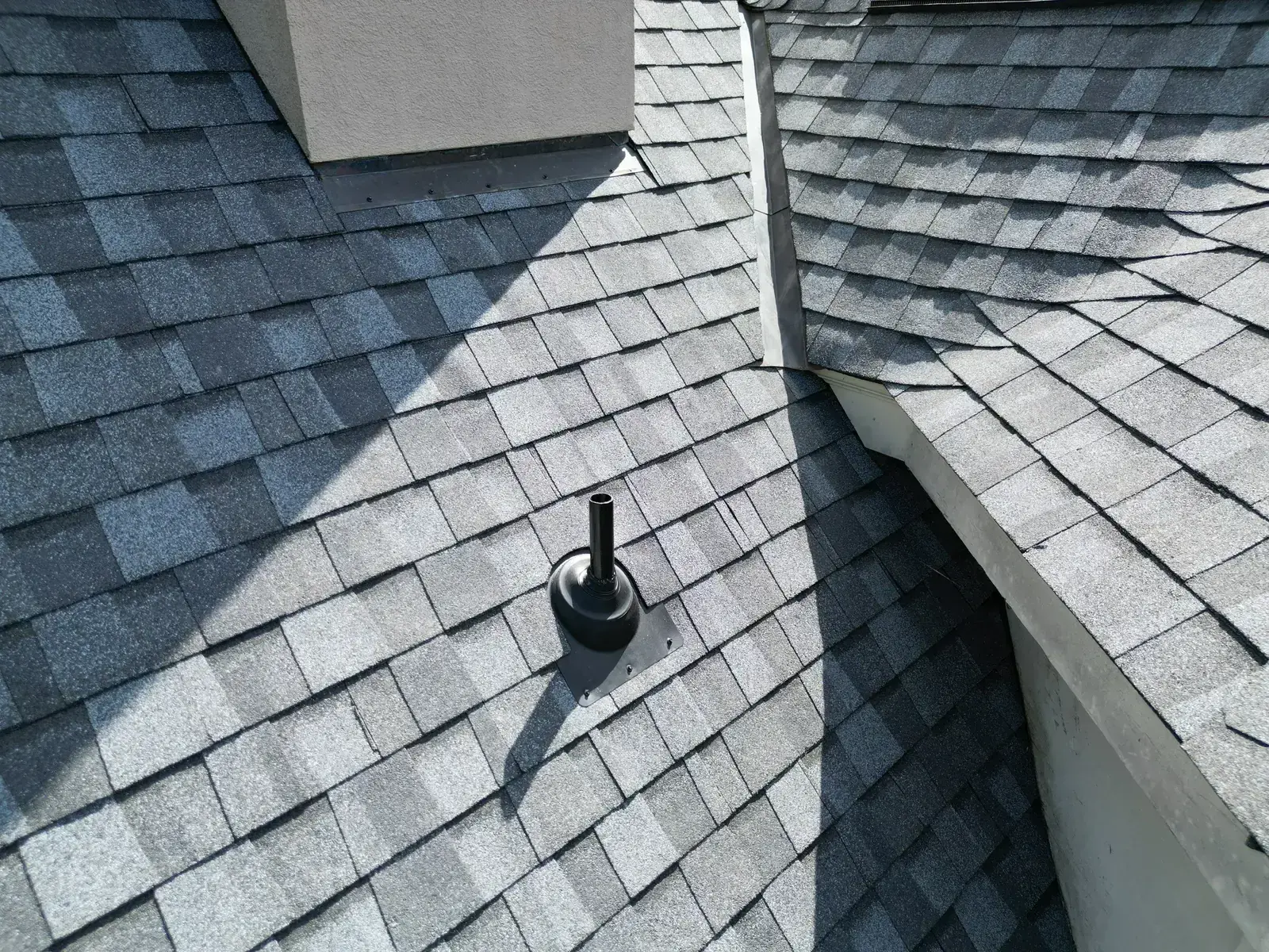 Glenn Glade in Chapel Hill is one of the most striking homes we have worked on, a stucco-and-stone estate in warm earth tones, multiple steeply pitched gables, and rolling Governors Club hills behind it. The 58 squares this called for had to handle one of the steeper garage gables we have shingled, plus the chimney and several intersecting valleys. We installed CertainTeed Landmark Pro in Pewter Gray. The cool gray reads beautifully against the warm stone and stucco, and the high pitches now catch light cleanly along every line. Total project: $35,375, completed October 2025.