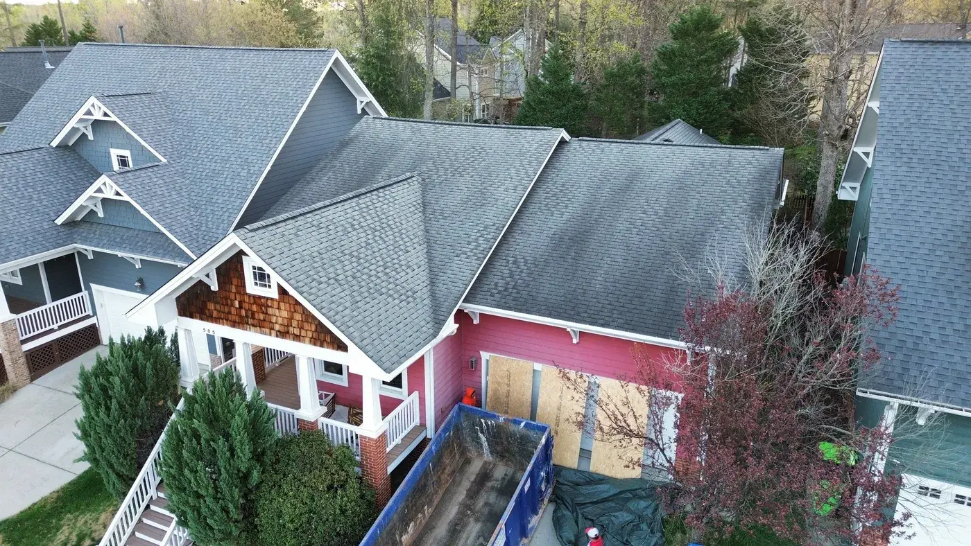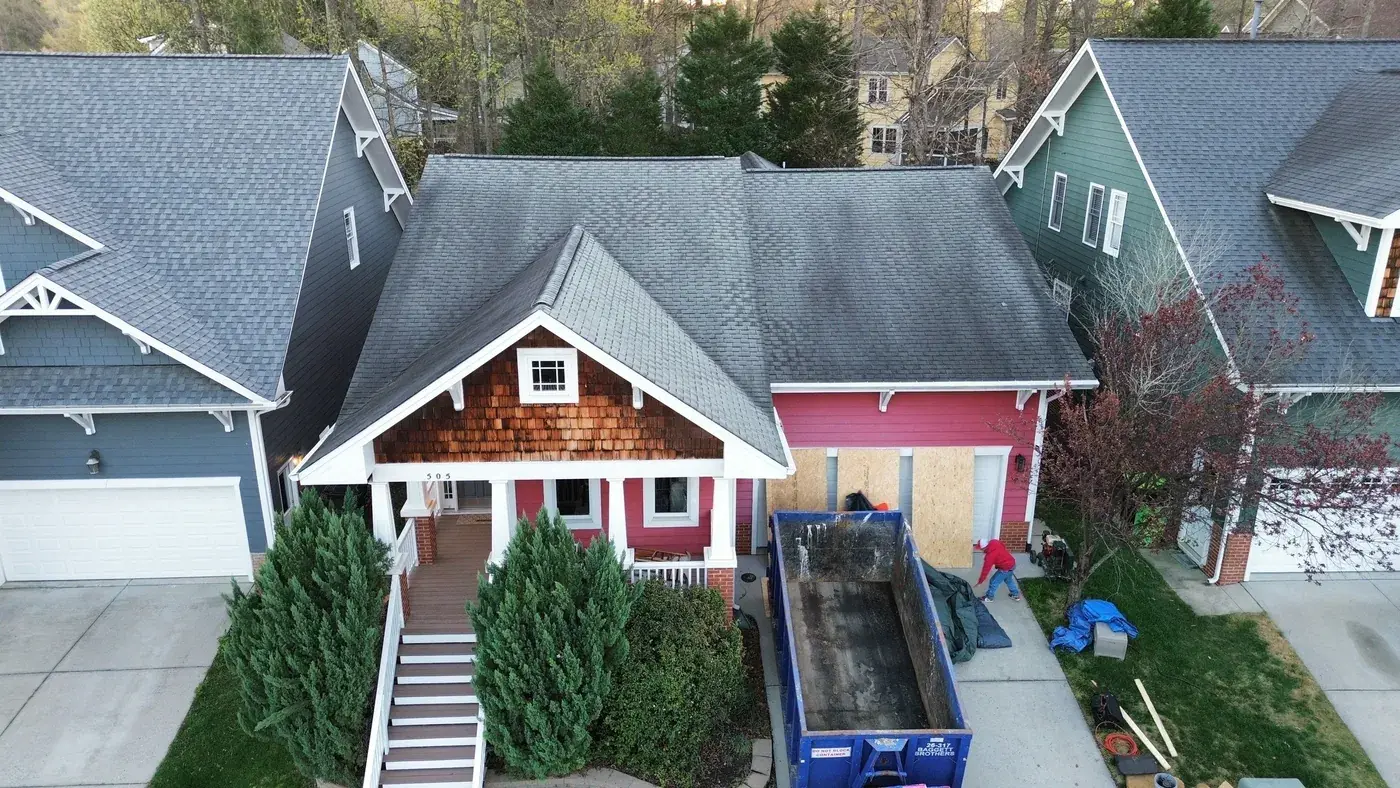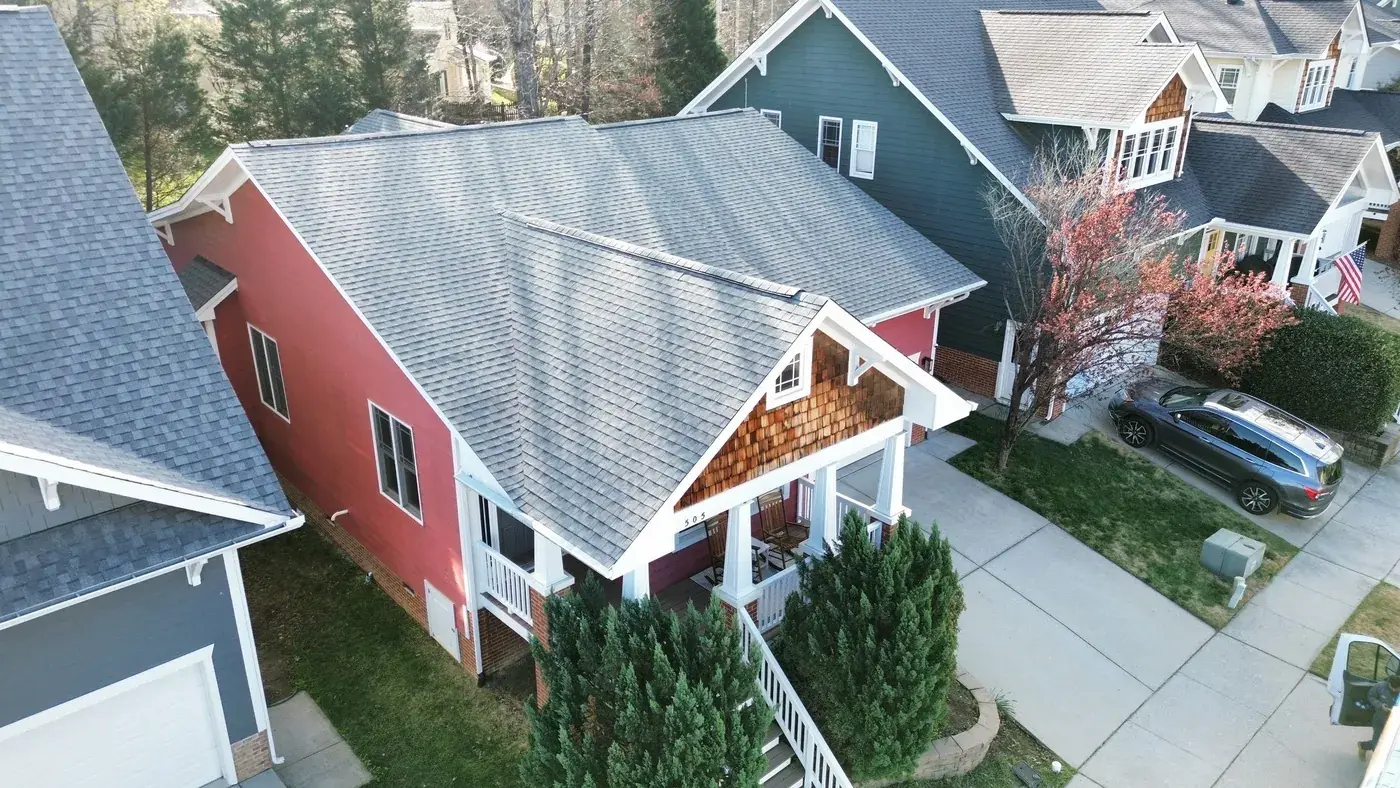 Homegate Cir in Apex is a modern Craftsman-style home in light blue siding with a wood-shake gable accent over the porch and a striking pink-red front door. The 42 squares this called for had to flash around the porch tie-in and across two distinct gable accents. We installed GAF Timberline HDZ in Williamsburg Slate. The cool slate tone reads softly against the blue siding and shake accents, giving the home the kind of dialed-in Craftsman finish that suits the architecture. Total project: $16,880, completed March 2026.