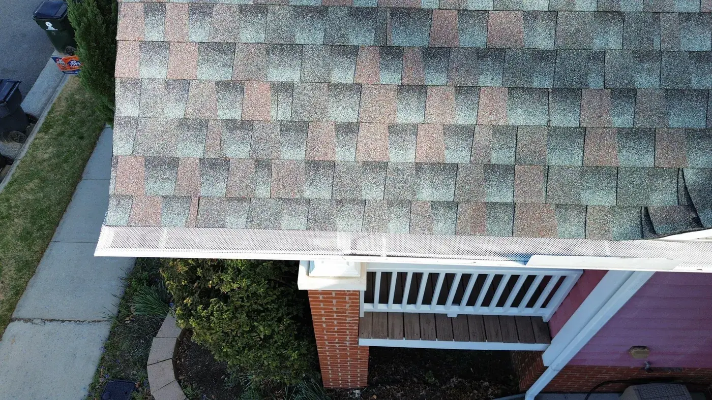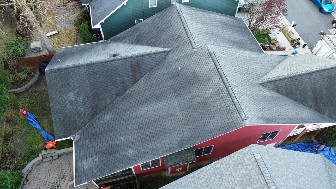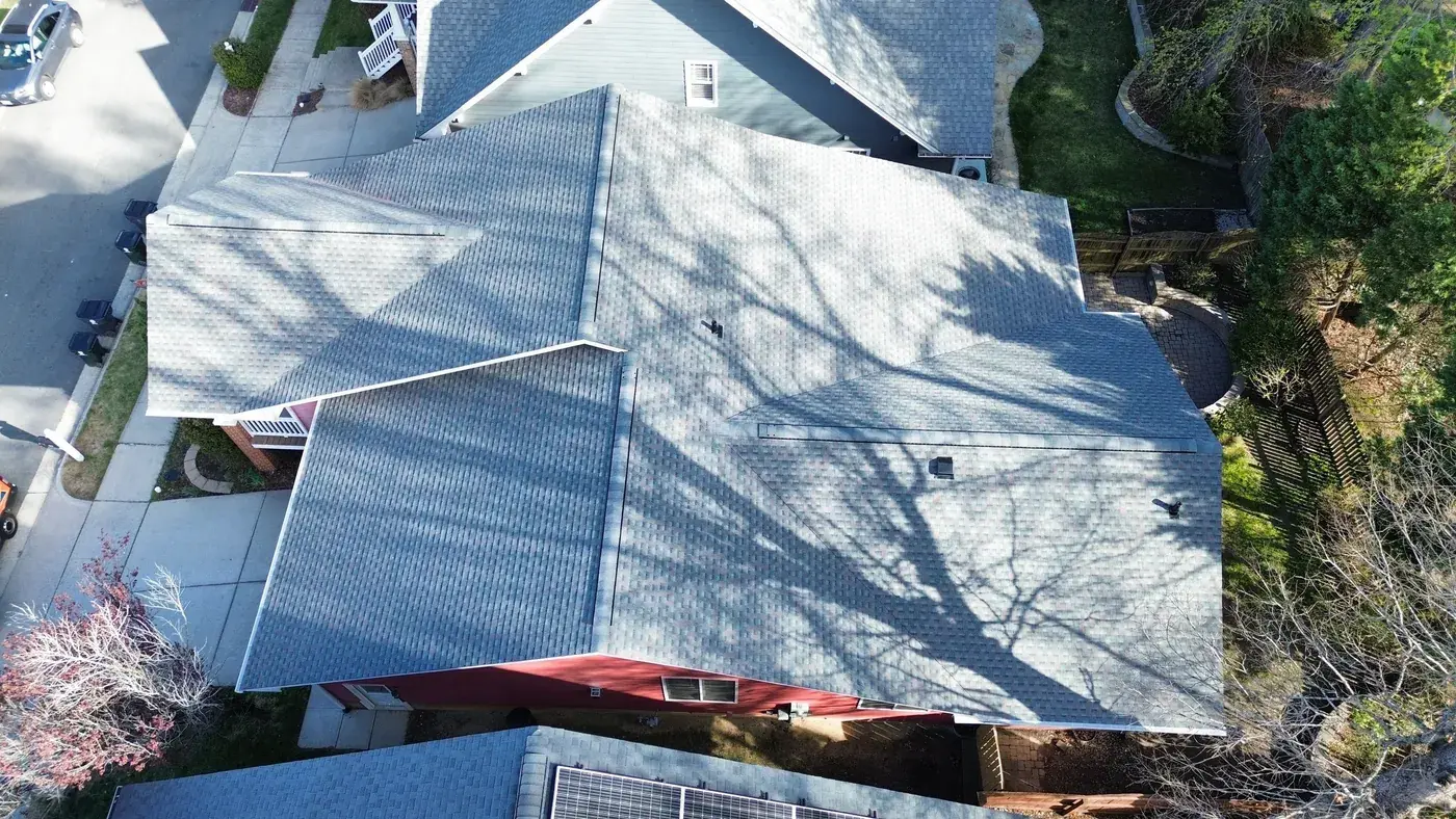 Homegate Cir in Apex is a modern Craftsman-style home in light blue siding with a wood-shake gable accent over the porch and a striking pink-red front door. The 42 squares this called for had to flash around the porch tie-in and across two distinct gable accents. We installed GAF Timberline HDZ in Williamsburg Slate. The cool slate tone reads softly against the blue siding and shake accents, giving the home the kind of dialed-in Craftsman finish that suits the architecture. Total project: $16,880, completed March 2026.