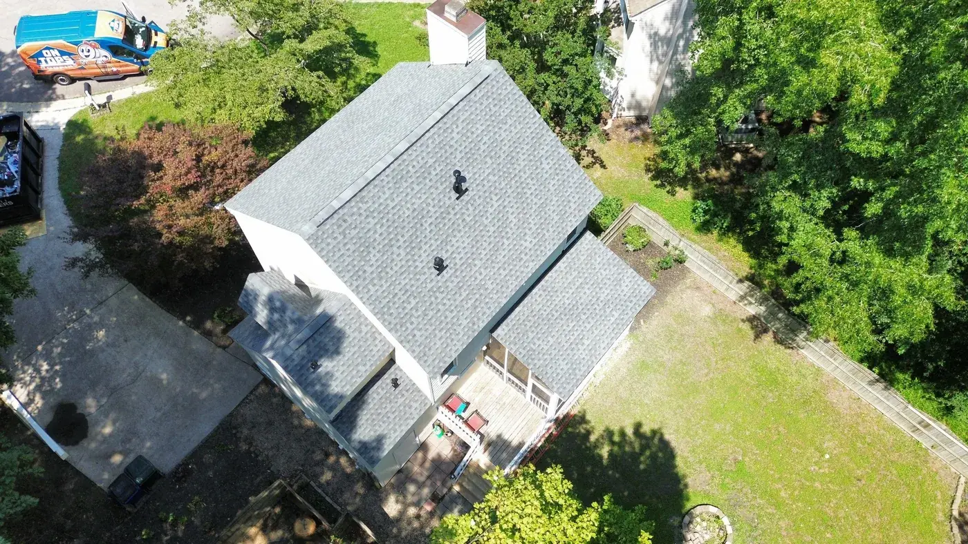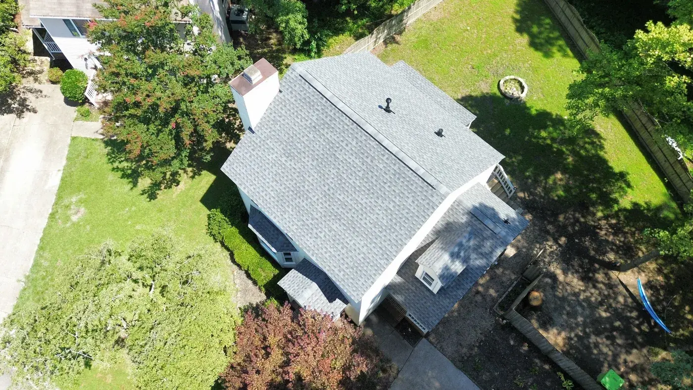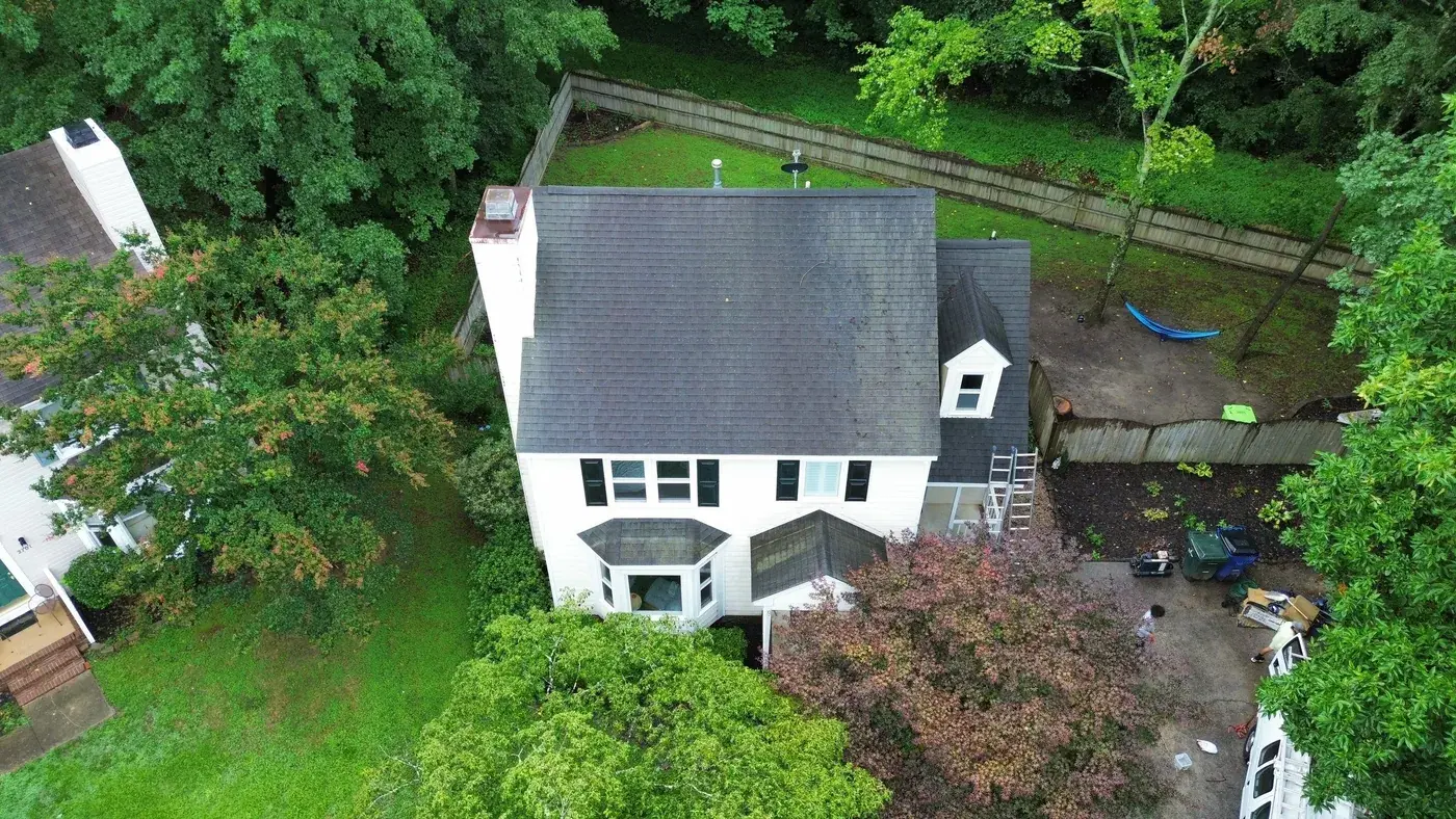 Kempsford Pl in Raleigh is a compact two-story tucked into a wooded lot, with a charming bay window projecting from the front and a quiet covered entry beside it. The 20 squares here was a tighter scope, which let us focus on a clean finish across the simple front-facing gable and around the bay tie-in. We installed GAF Timberline HDZ in Pewter Gray. The cool tone reads sharply against the white siding and gives a smaller home the same crisp finish a larger one would get. Total project: $8,415, completed July 2025.