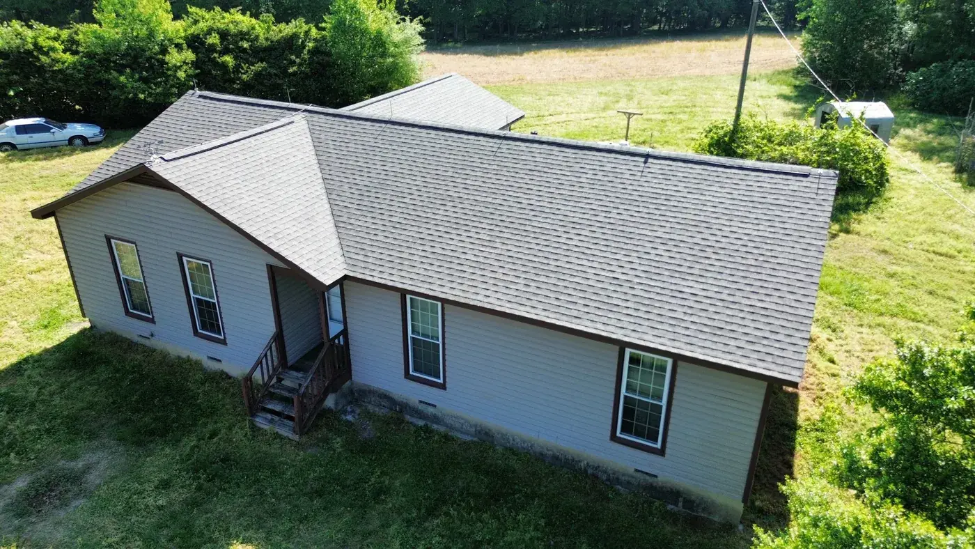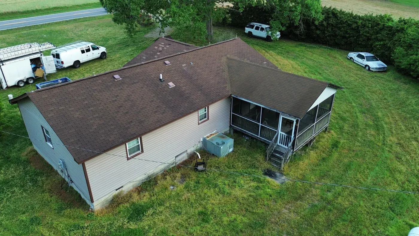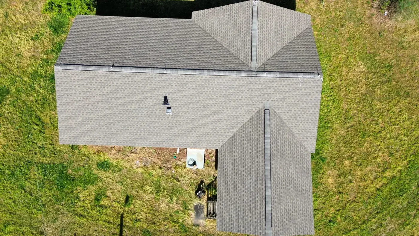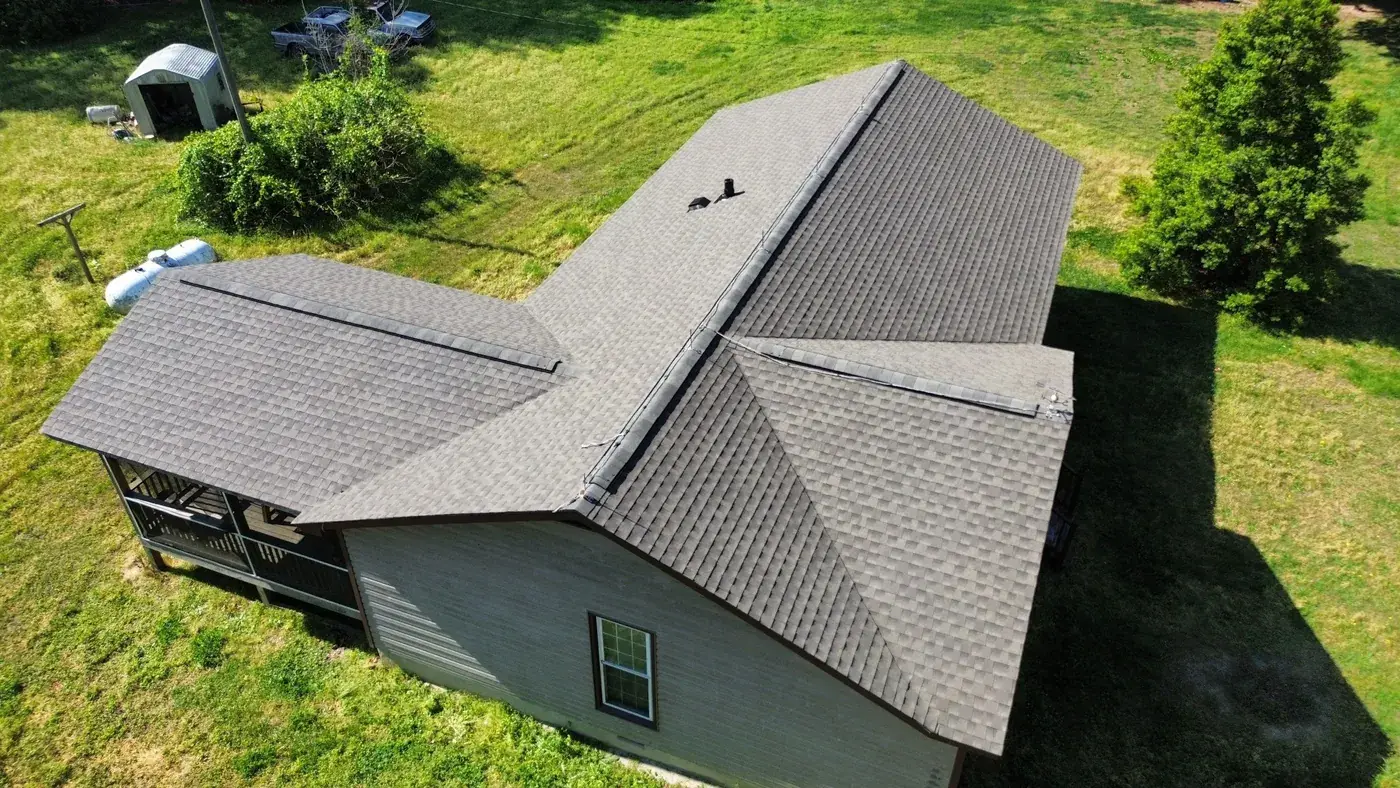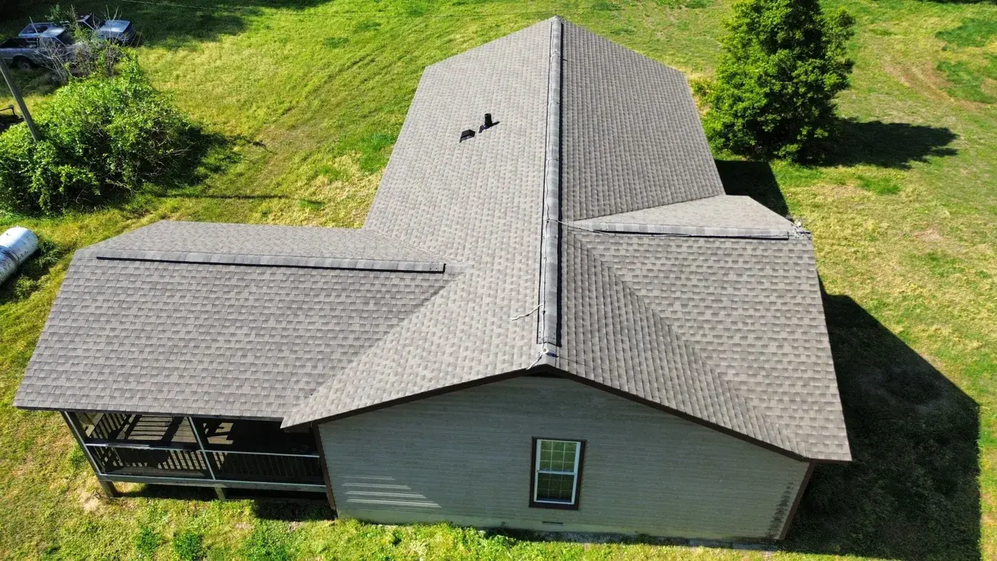 Lake Wheeler Rd in Fuquay-Varina is a single-story home in white siding with a cross-gable footprint and a screened porch tucked along the right side. With the two perpendicular wings meeting at a center valley plus the porch tie-in to handle, the prep on this 27-square job took its time on the transitions. We installed GAF Timberline HDZ in Weathered Wood. The warm tone settles softly against the white siding and the open green lawn around the home, giving the property a balanced new top. Total project: $11,975, completed April 2026.