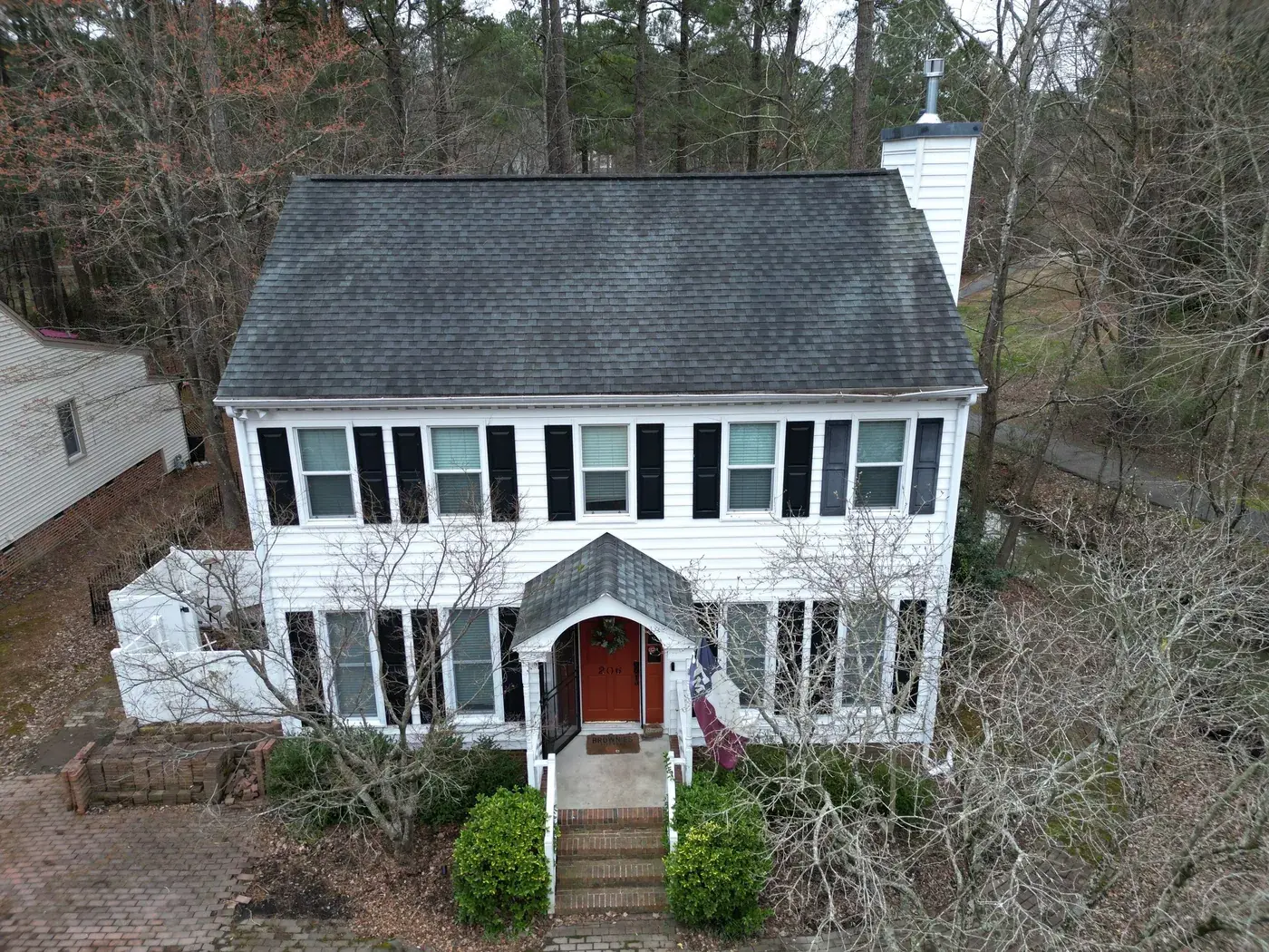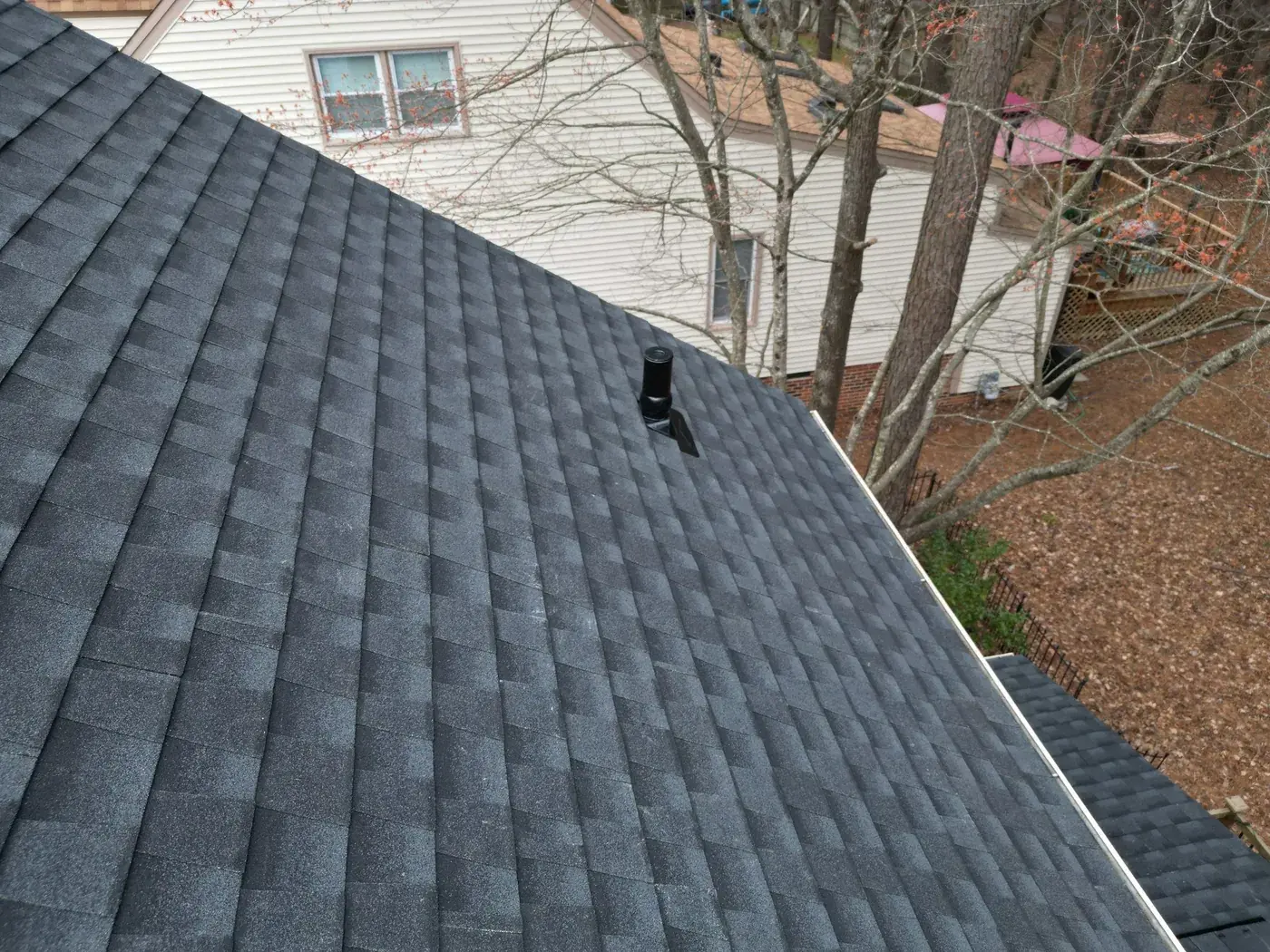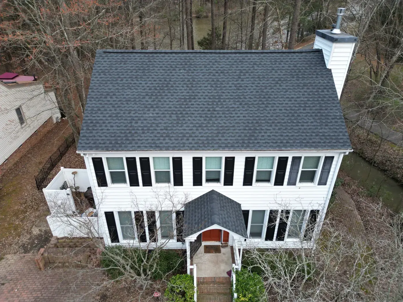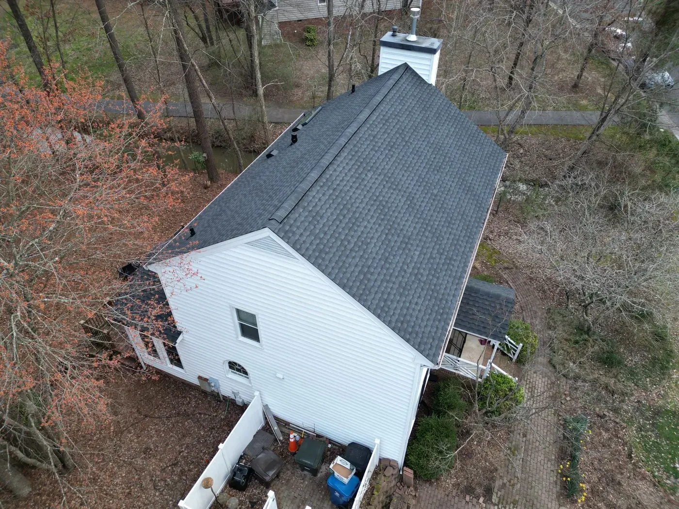 Lakeshore Dr in Durham is a classic two-story colonial in white siding with black shutters, the kind of home that earns its dignity from symmetry. A smaller 15-square scope here meant we could focus tight attention on the ridge work and the side-chimney flashing. We installed GAF Timberline Ultra HDZ in Charcoal. The dark color reads crisp against the white body and lets the symmetrical front of the home stand exactly as it was always meant to. Total project: $8,785, completed May 2025.