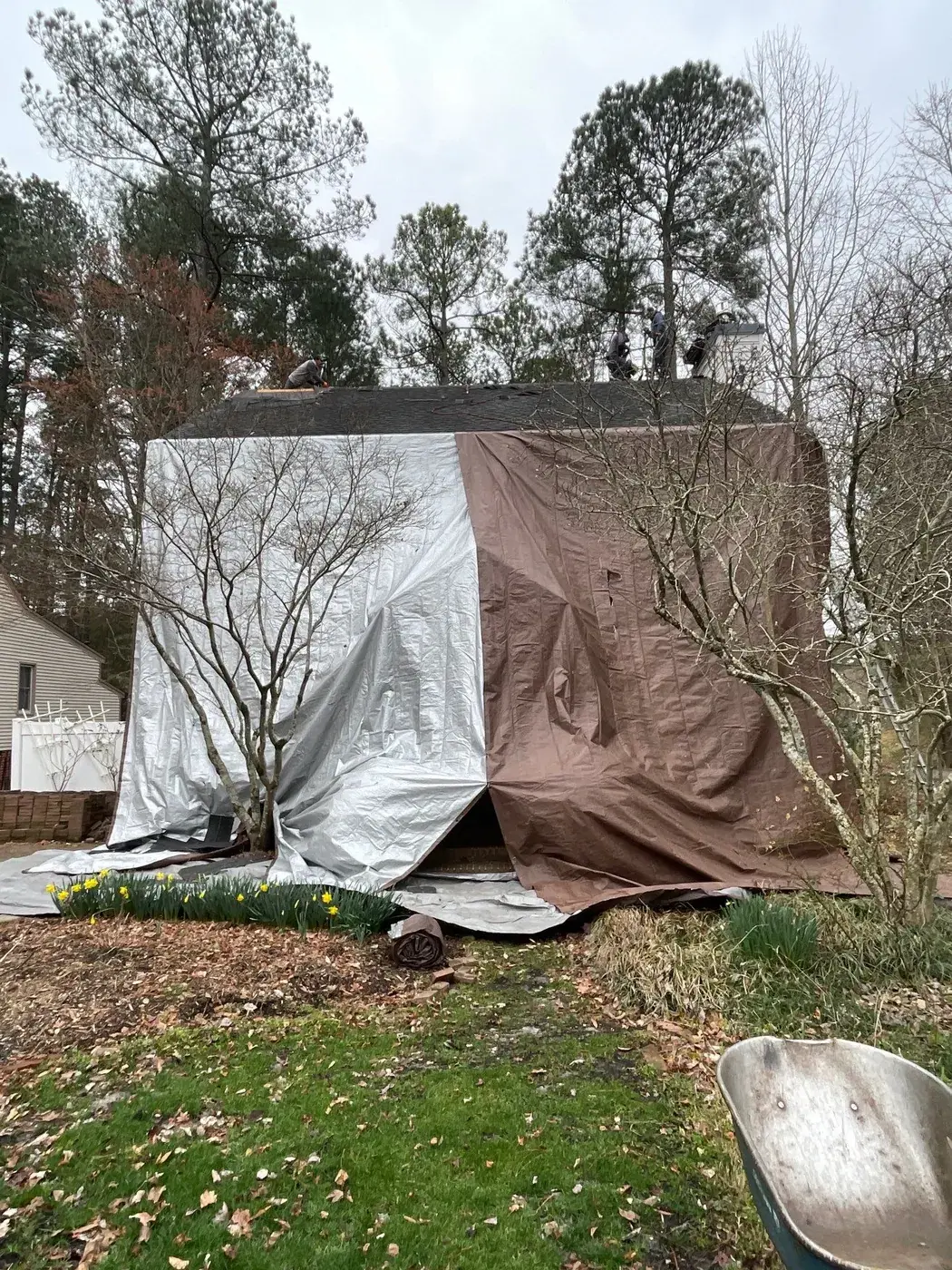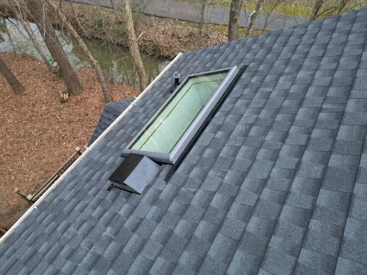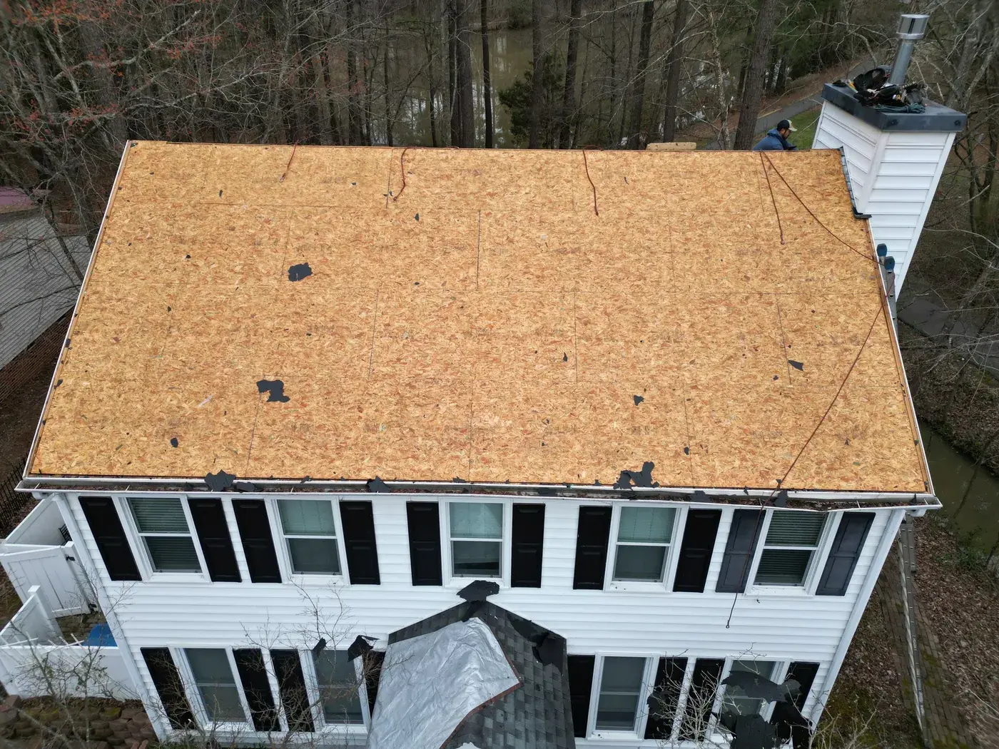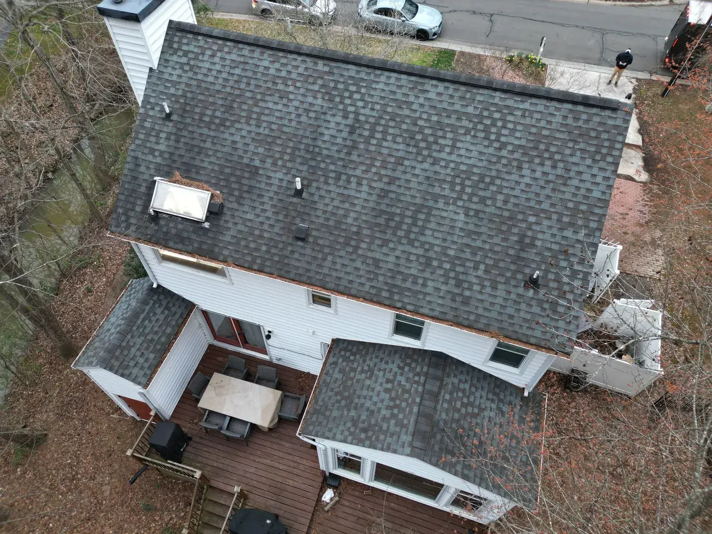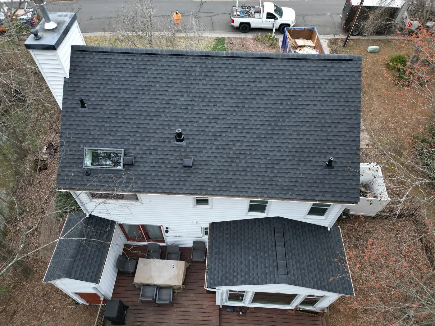 Lakeshore Dr in Durham is a classic two-story colonial in white siding with black shutters, the kind of home that earns its dignity from symmetry. A smaller 15-square scope here meant we could focus tight attention on the ridge work and the side-chimney flashing. We installed GAF Timberline Ultra HDZ in Charcoal. The dark color reads crisp against the white body and lets the symmetrical front of the home stand exactly as it was always meant to. Total project: $8,785, completed May 2025.