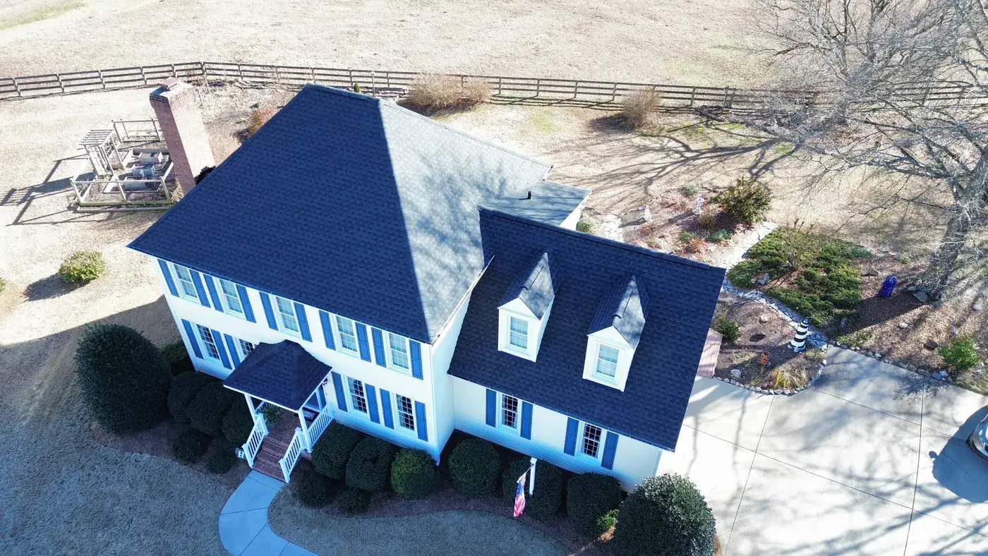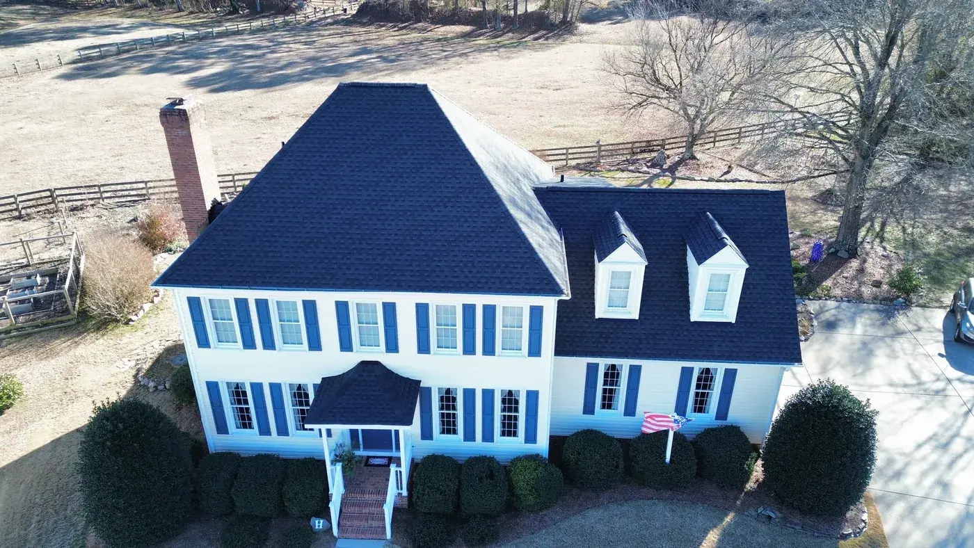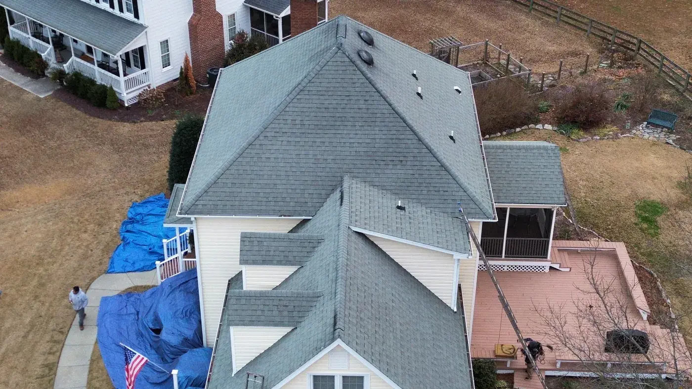 Larimer Ct in Fuquay-Varina is a two-story home in white siding with blue shutters and two prominent front-facing dormers stepping across the upper level. With dormer step flashing on both faces and a side chimney to seal, this 38-square project gave the team plenty of detail work to focus on. We installed GAF Timberline HDZ in Charcoal. The dark color reads strong against the white body and gives the dormer line the deliberate frame it deserves. Total project: $15,675, completed December 2025.