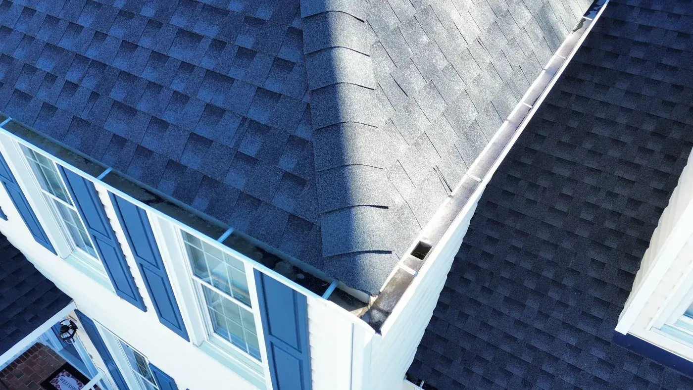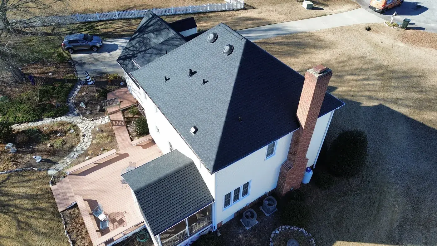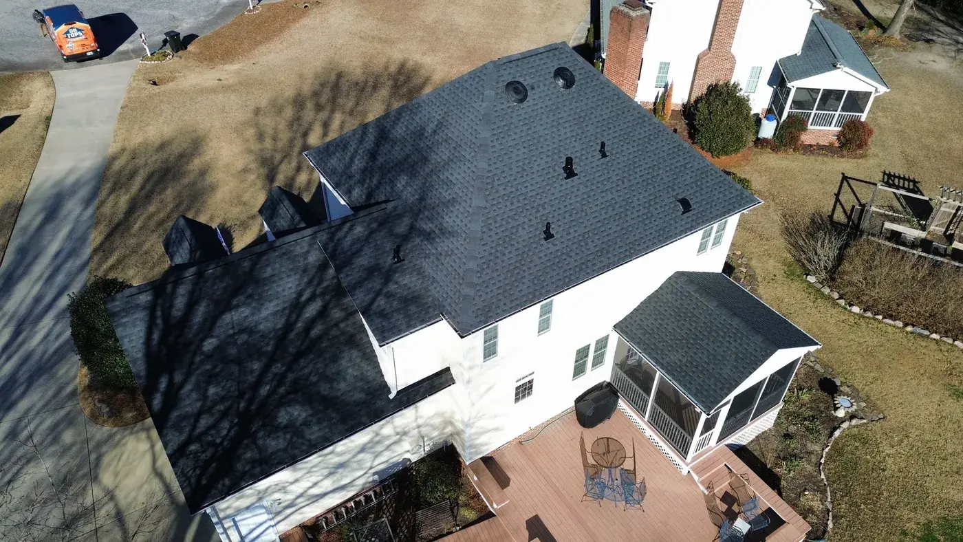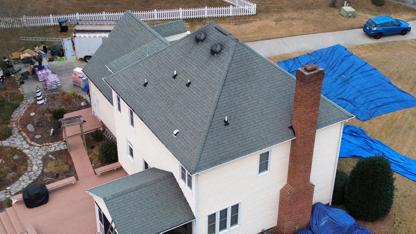 Larimer Ct in Fuquay-Varina is a two-story home in white siding with blue shutters and two prominent front-facing dormers stepping across the upper level. With dormer step flashing on both faces and a side chimney to seal, this 38-square project gave the team plenty of detail work to focus on. We installed GAF Timberline HDZ in Charcoal. The dark color reads strong against the white body and gives the dormer line the deliberate frame it deserves. Total project: $15,675, completed December 2025.