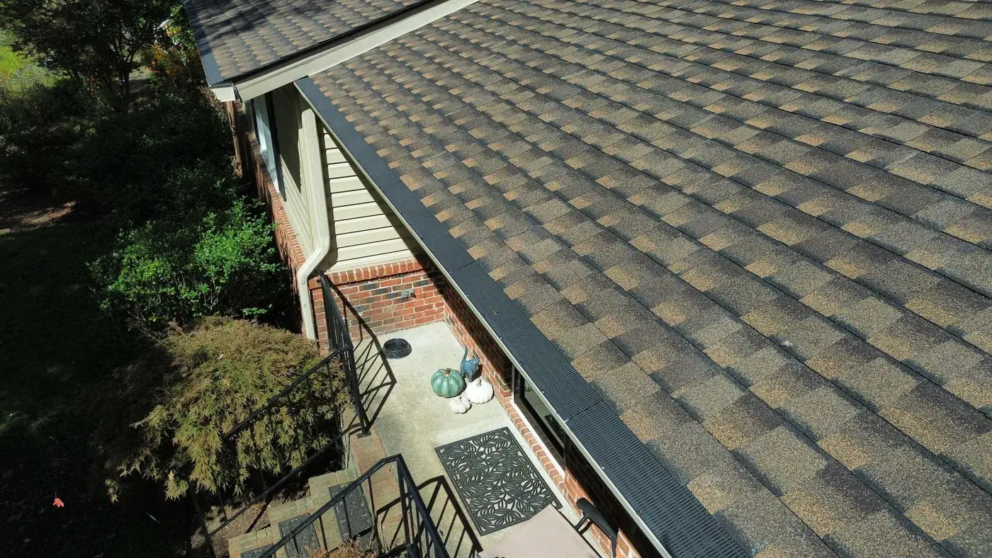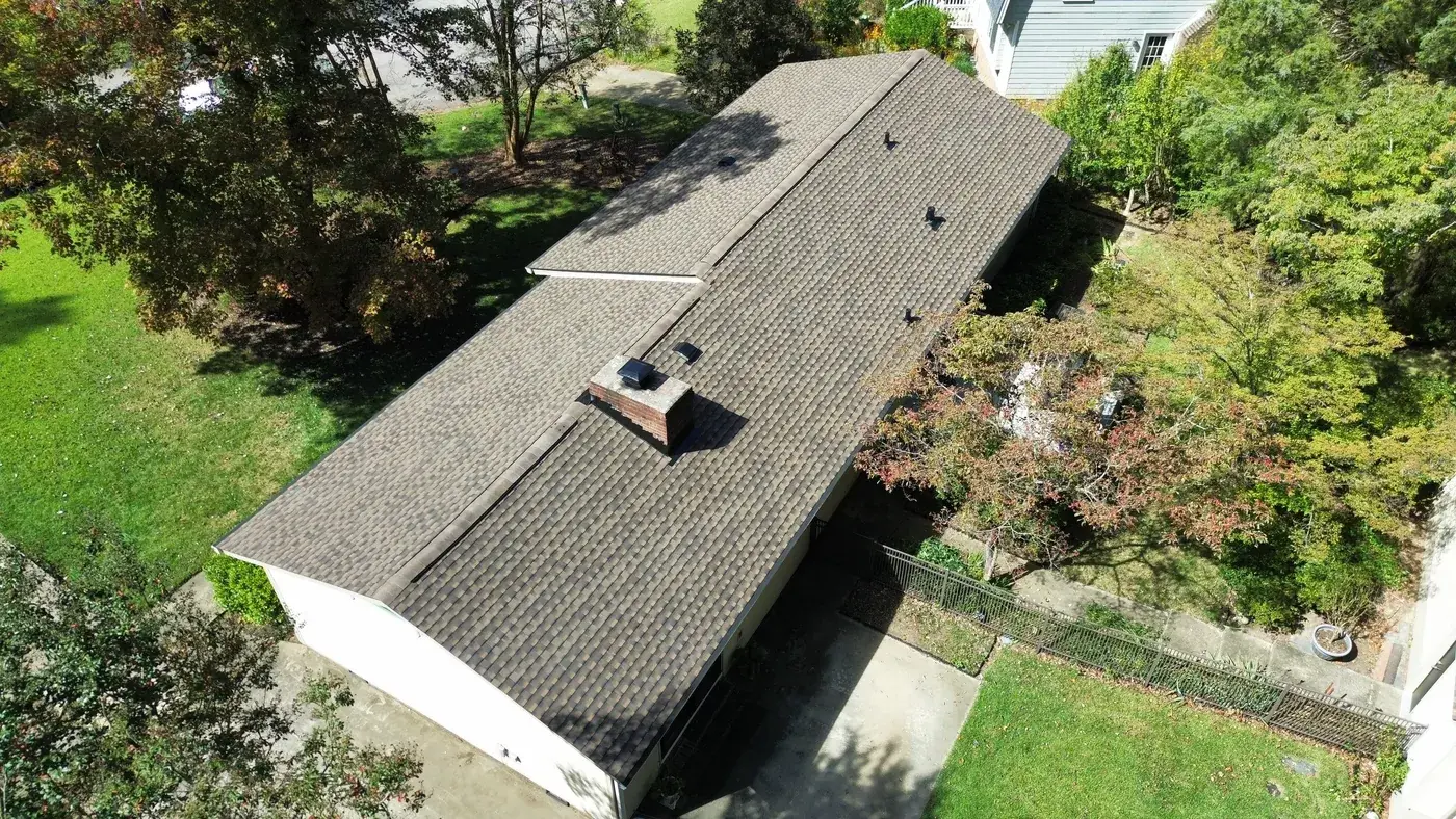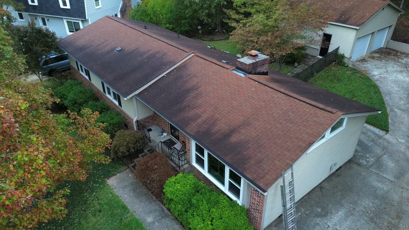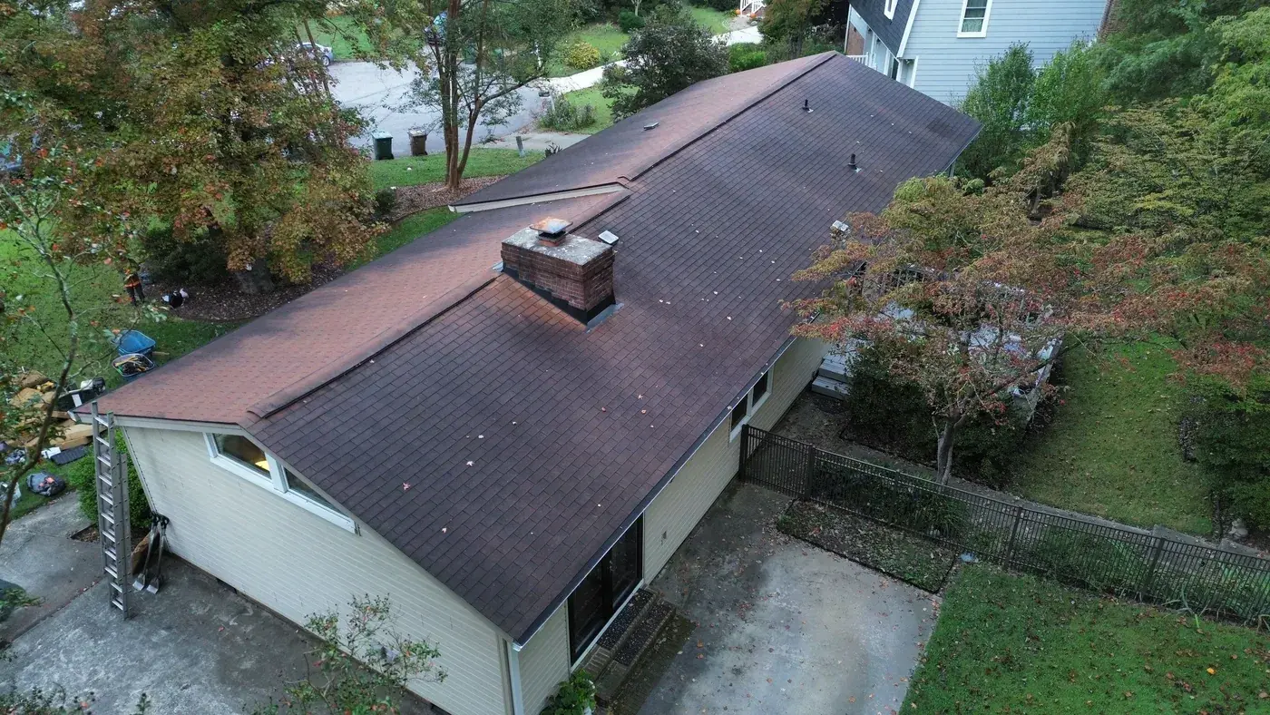 Larkhall Ct in Cary is a long brick ranch with a shallow main roof that runs the full length of the home, plus a rear extension and a chimney rising up through the middle of the plane. With this much continuous roof, the underlayment and the chimney flashing had to be done carefully. We laid out 34 squares of GAF Timberline Ultra HDZ in Barkwood, which sits beautifully against the warm brick and the autumn light around the lot. The new roof gives this single-story home a cleaner, more deliberate horizontal line. Total project: $17,325, completed September 2025.