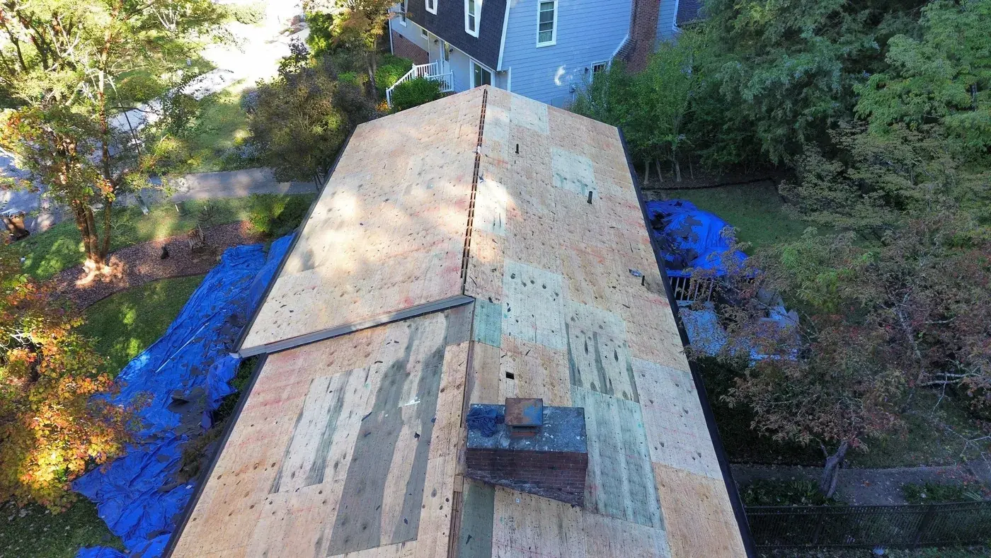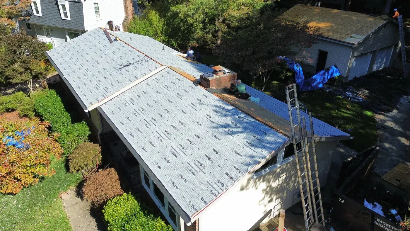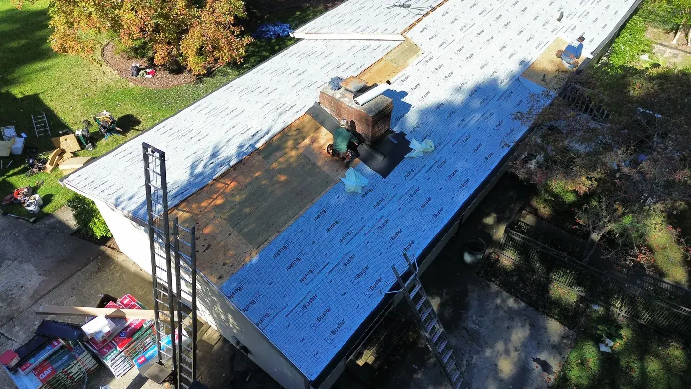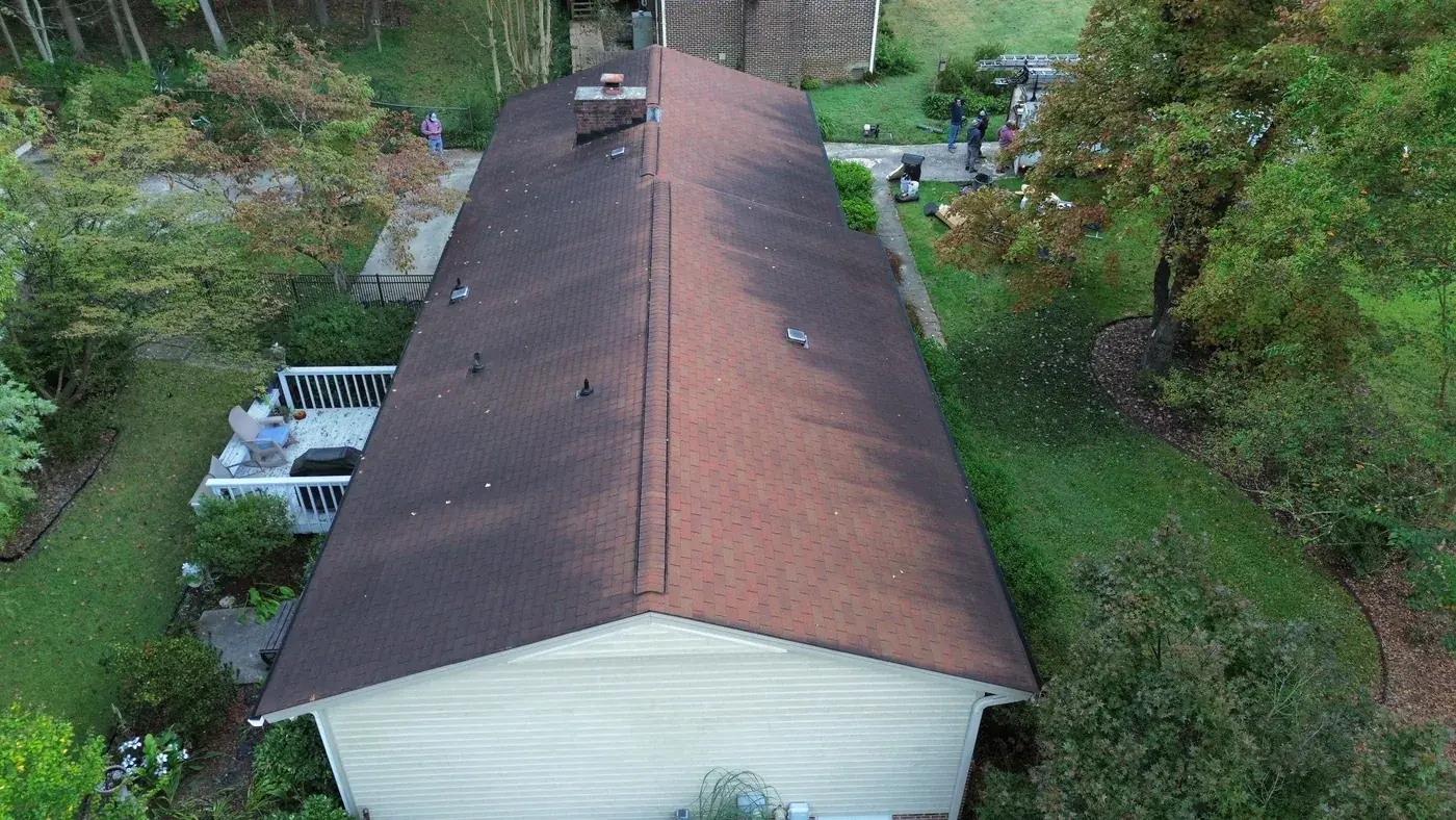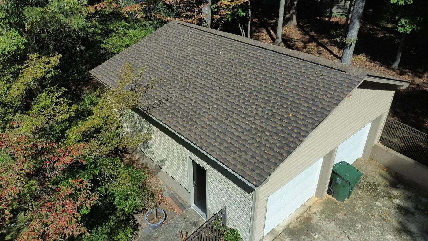 Larkhall Ct in Cary is a long brick ranch with a shallow main roof that runs the full length of the home, plus a rear extension and a chimney rising up through the middle of the plane. With this much continuous roof, the underlayment and the chimney flashing had to be done carefully. We laid out 34 squares of GAF Timberline Ultra HDZ in Barkwood, which sits beautifully against the warm brick and the autumn light around the lot. The new roof gives this single-story home a cleaner, more deliberate horizontal line. Total project: $17,325, completed September 2025.