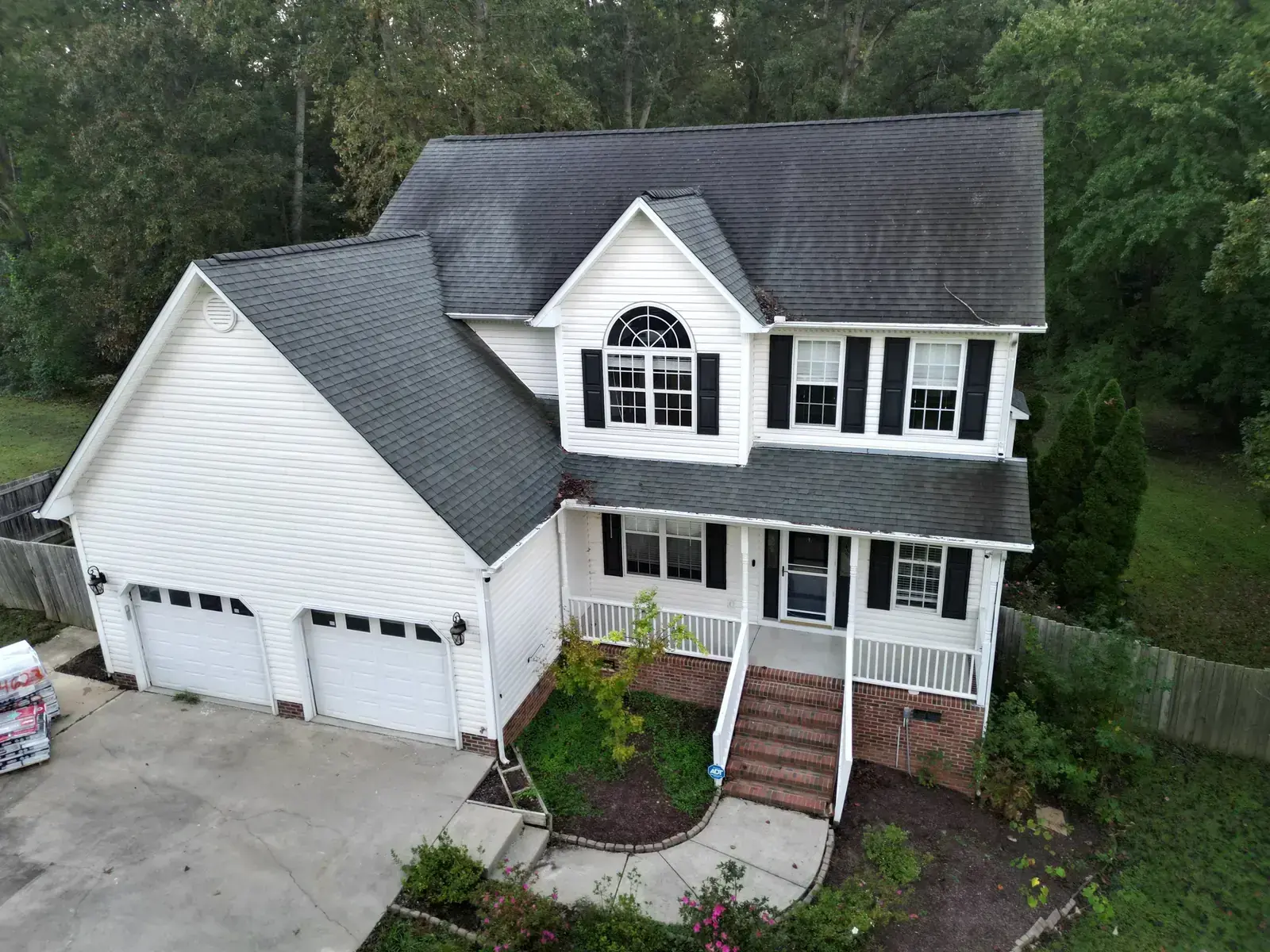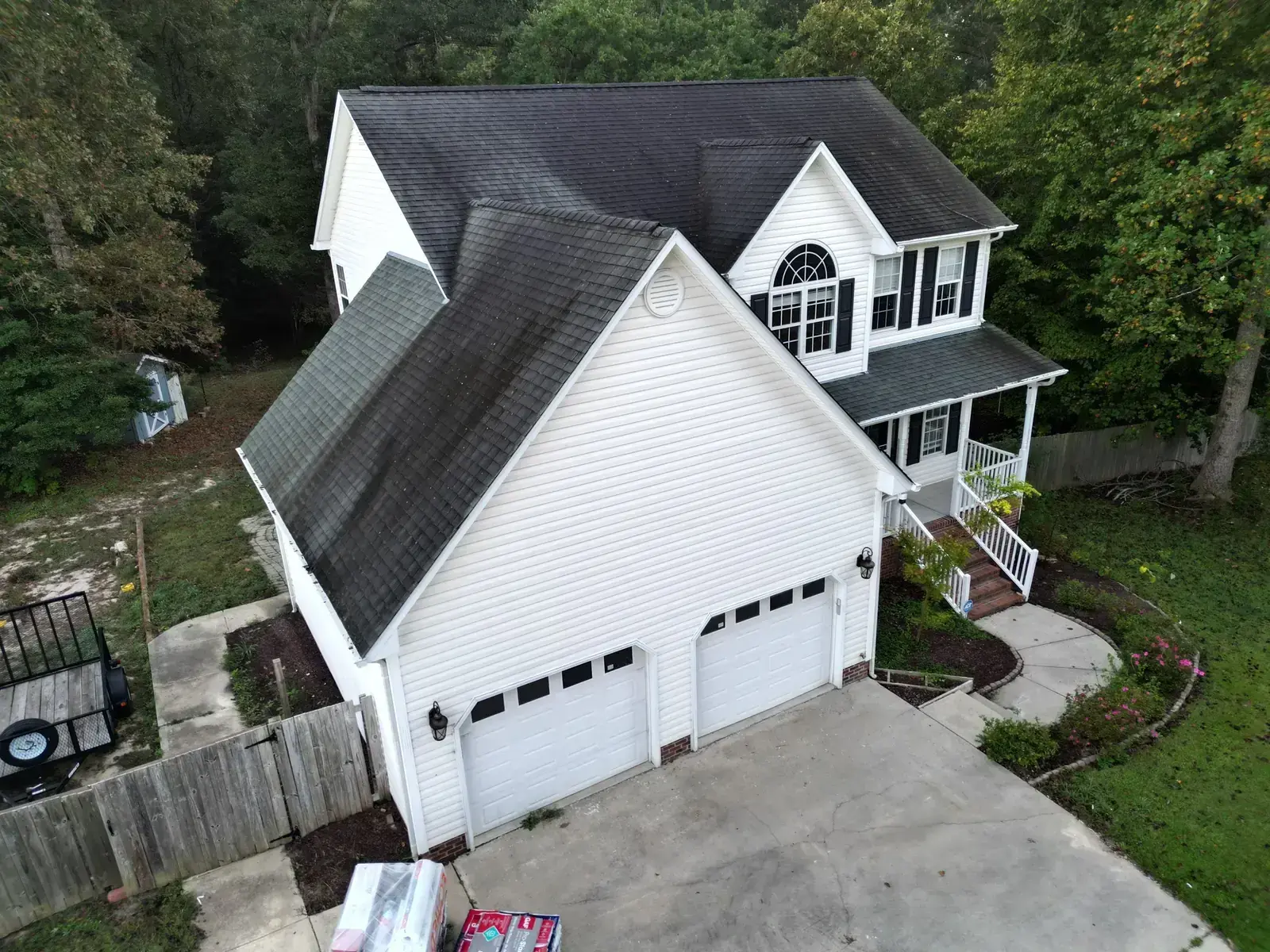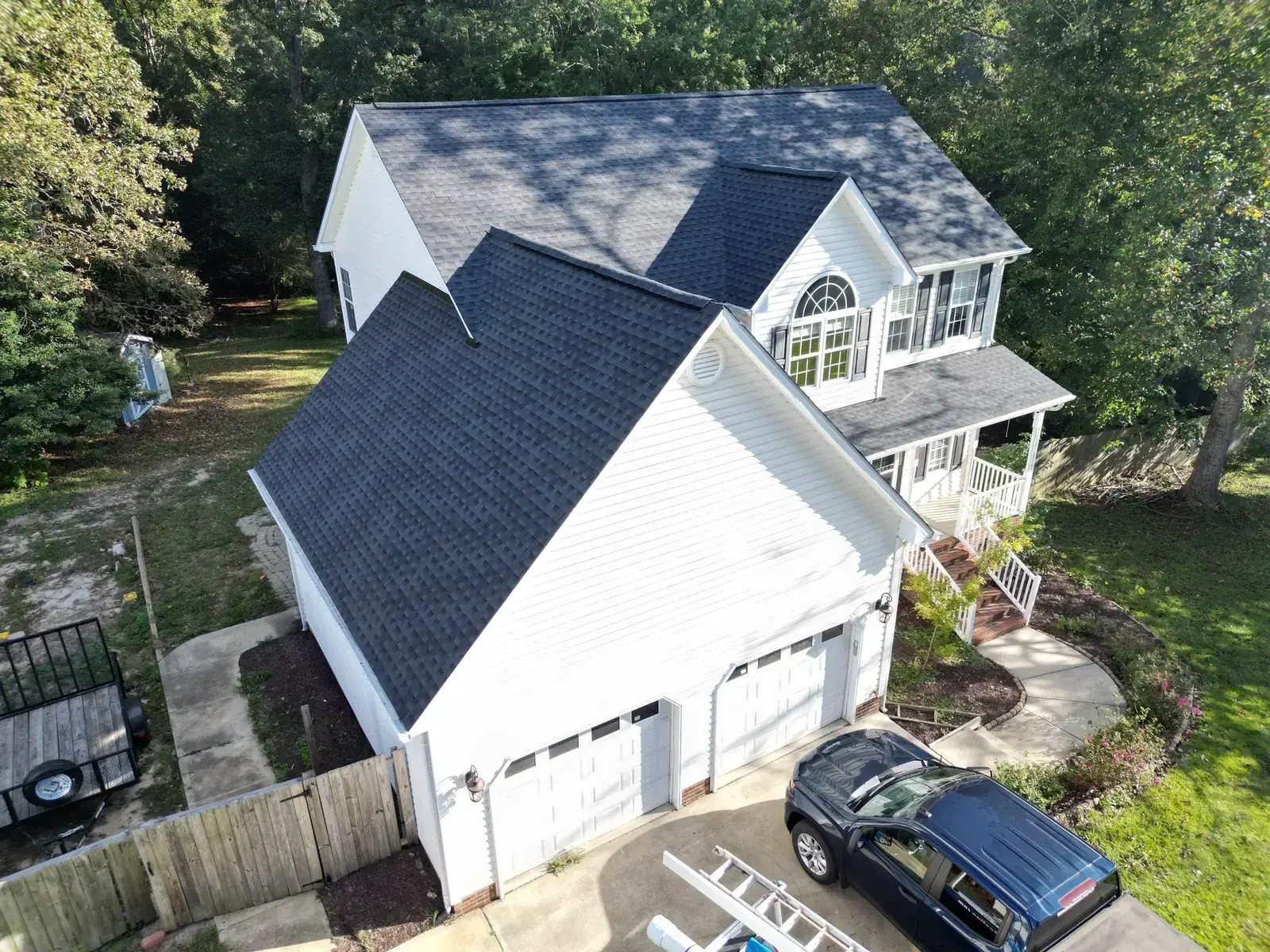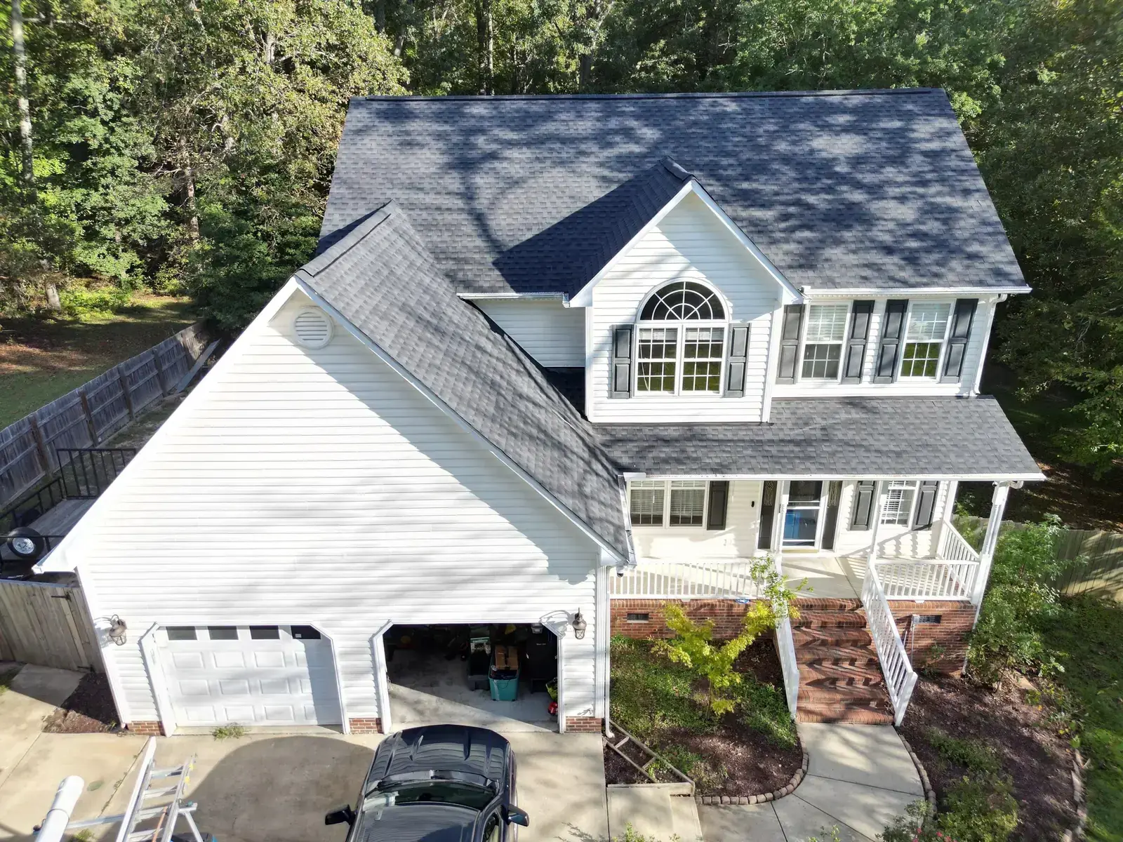 Leach Dr in Garner is a beautiful two-story home in white siding featuring a striking Palladian window set into a tall front-facing center gable. With a window detail like that, the new shingle had to lay perfectly flat across the gable face to honor the architectural feature below it. We installed 25 squares of GAF Timberline HDZ in Charcoal. The dark color reads sharp against the white body and gives the Palladian window the kind of dark frame that makes it stand out exactly the way the architect intended. Total project: $12,300, completed October 2025.