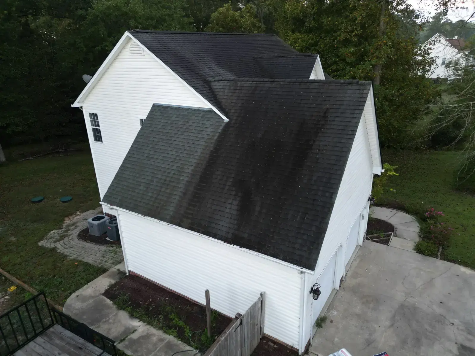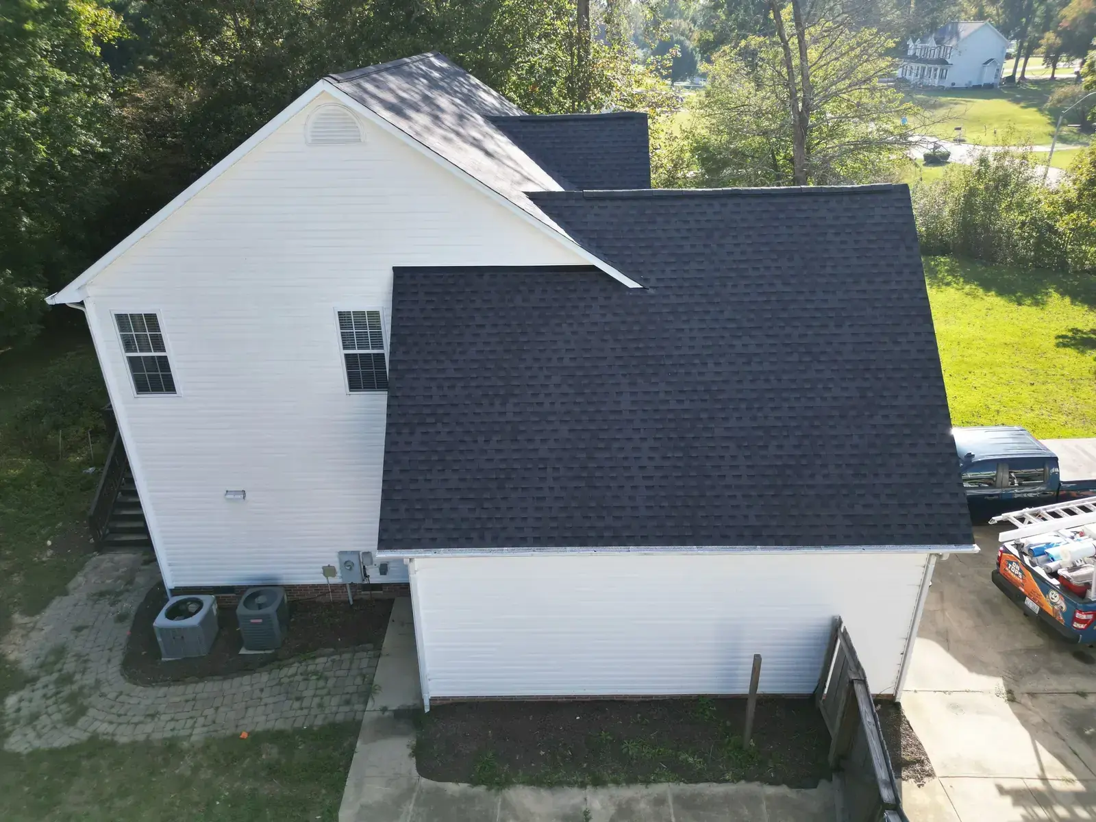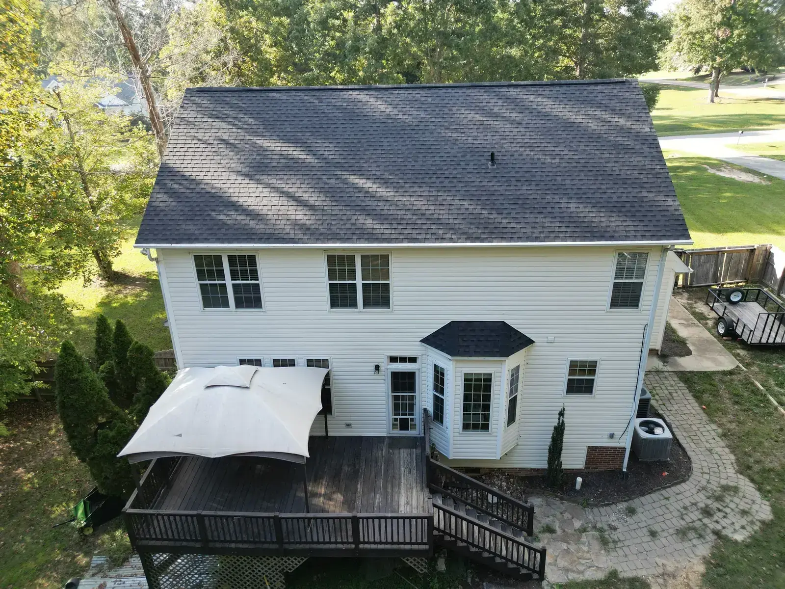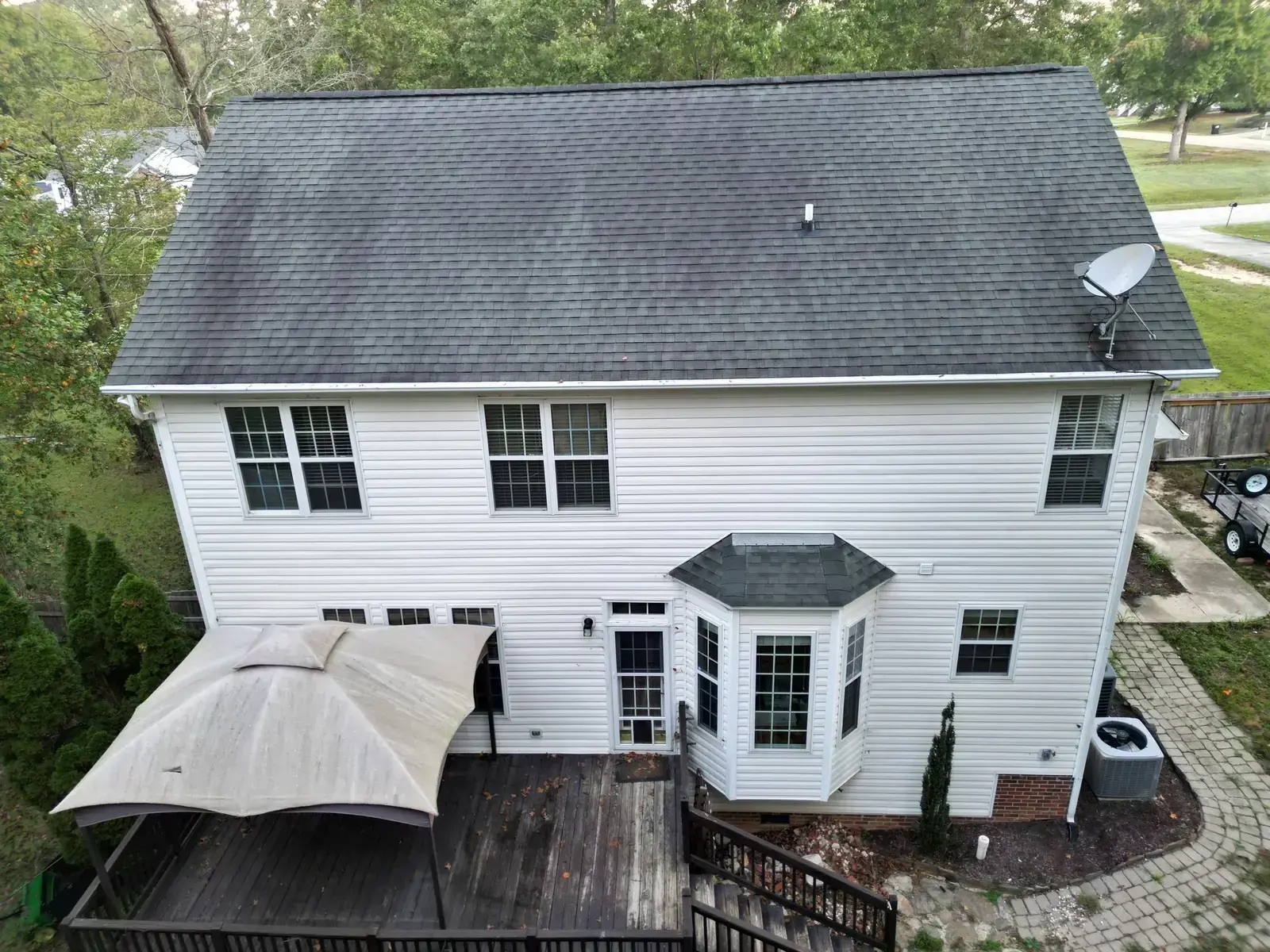 Leach Dr in Garner is a beautiful two-story home in white siding featuring a striking Palladian window set into a tall front-facing center gable. With a window detail like that, the new shingle had to lay perfectly flat across the gable face to honor the architectural feature below it. We installed 25 squares of GAF Timberline HDZ in Charcoal. The dark color reads sharp against the white body and gives the Palladian window the kind of dark frame that makes it stand out exactly the way the architect intended. Total project: $12,300, completed October 2025.