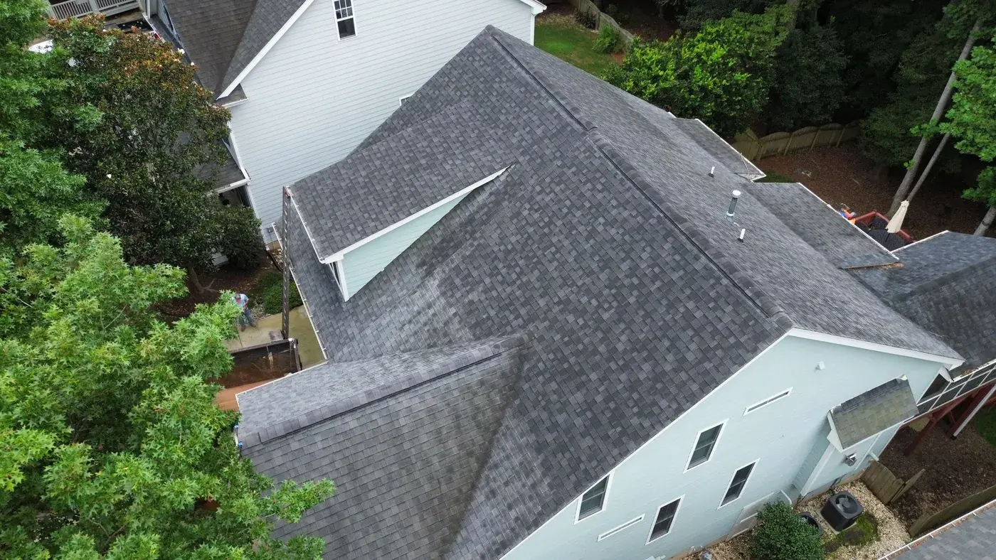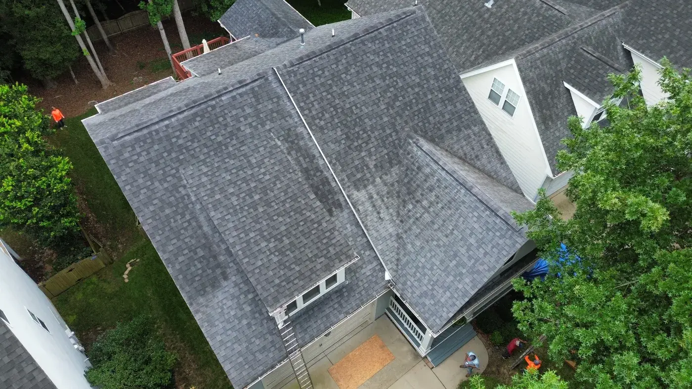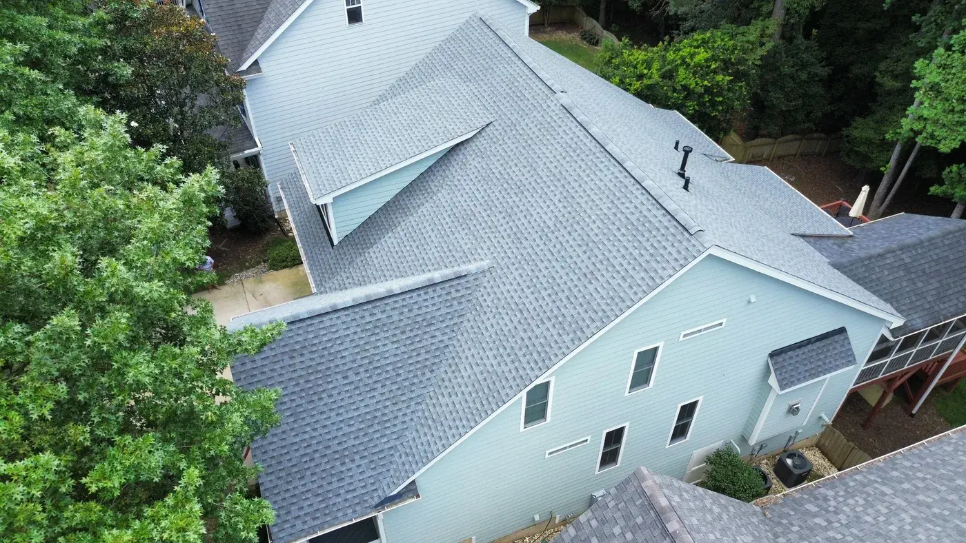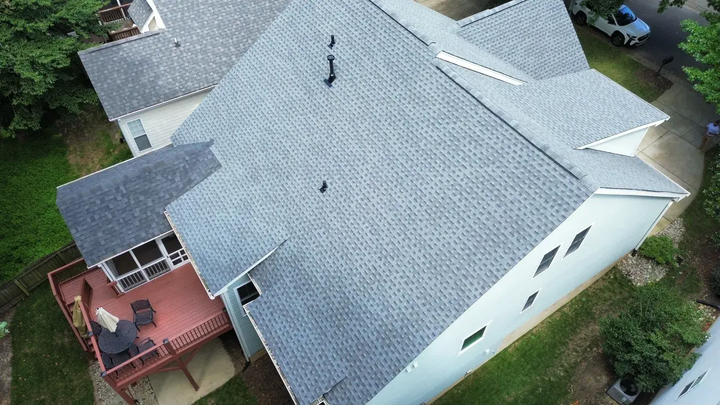 Marsh Landing Dr in Holly Springs is a two-story home in white siding with multiple intersecting gables and a charming round porthole window tucked into one of the gable faces. With several gable peaks meeting at the front, the prep work focused on every valley and each step-flash transition. We installed 33 squares of GAF Timberline HDZ in Pewter Gray. The cool tone reads beautifully against the white siding and gives this layered home a top that handles its rhythm without flattening any of it. Total project: $15,675, completed August 2025.