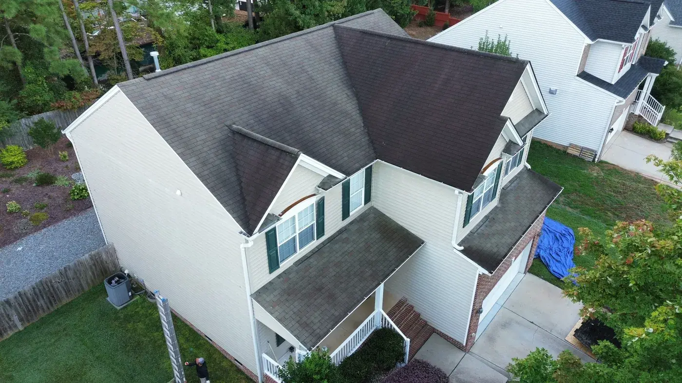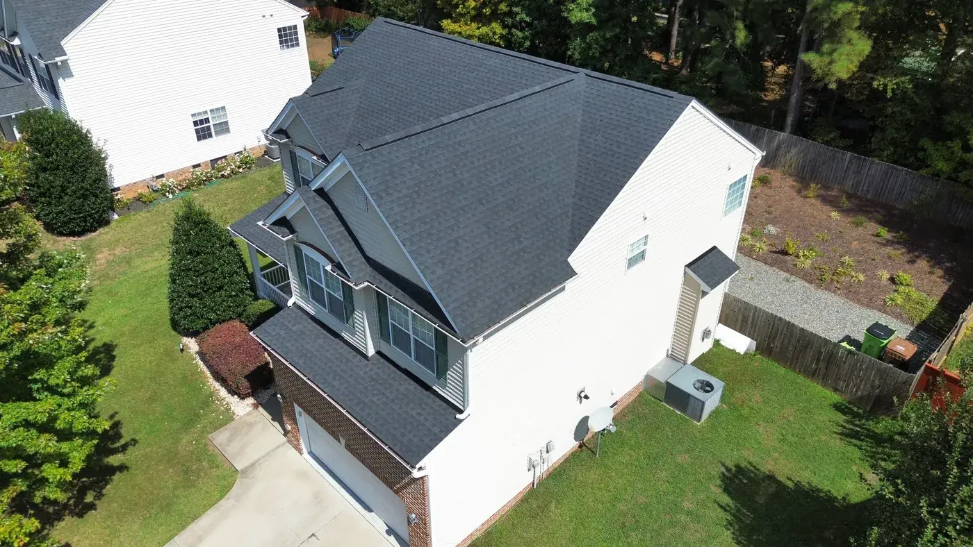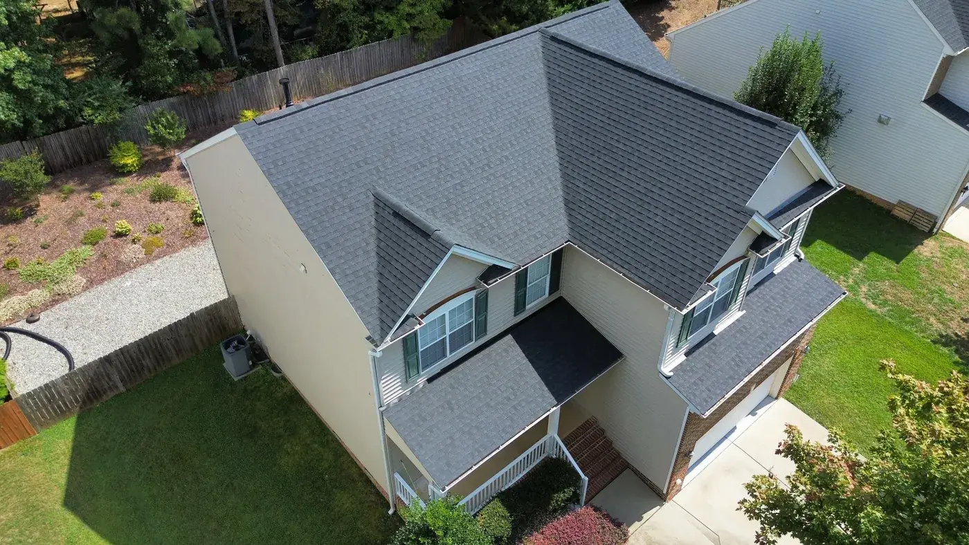 McKenzie Meadow Ln in Apex is a two-story home in cream siding over a brick lower level, finished with a small front-facing gable rising over the entry porch. The 29 squares this took came together quickly, with the porch tie-in and the small upper gable giving the team something to focus on. We installed GAF Timberline HDZ in Charcoal. The dark shingle reads handsomely against the cream and brick, giving this newer-build home a sharp, dialed-in finish from the curb. Total project: $12,600, completed September 2025.
