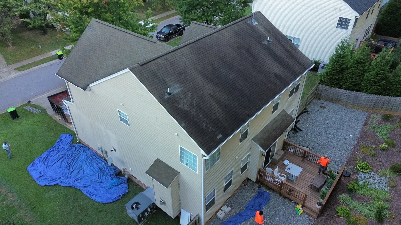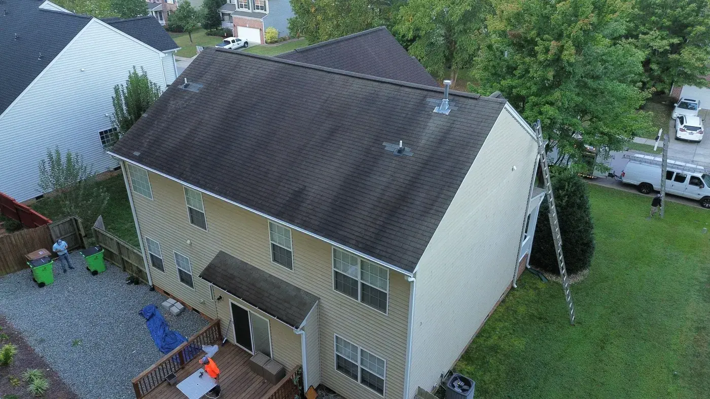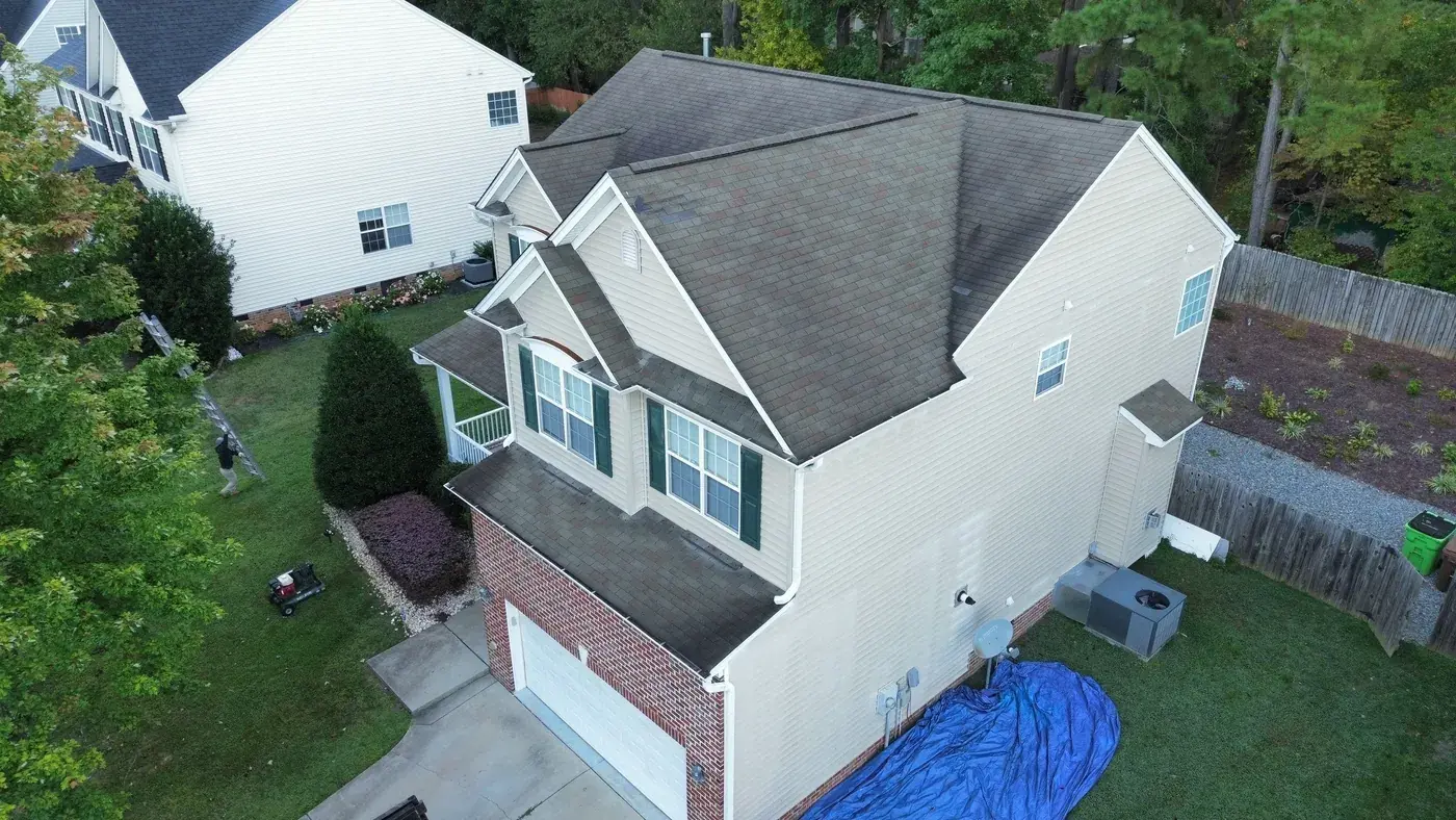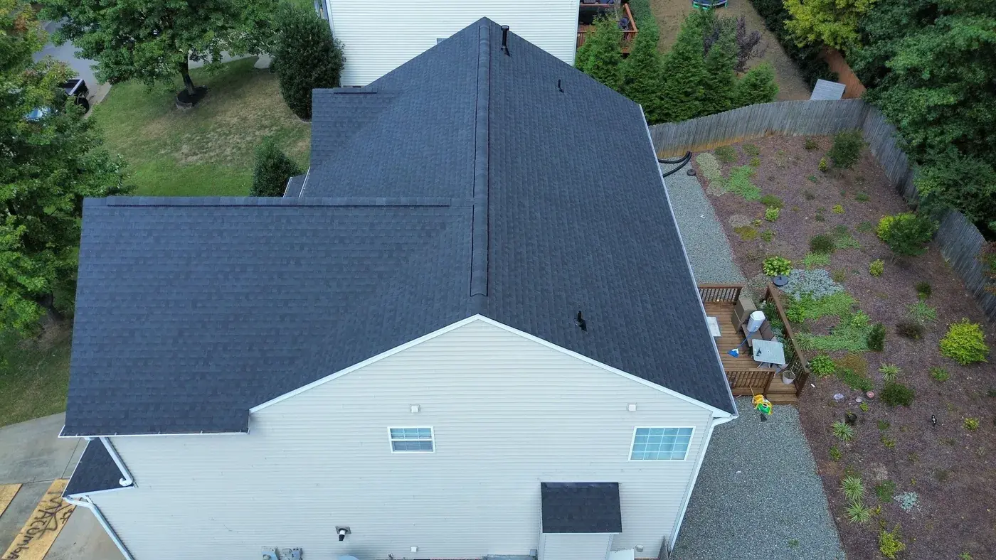 McKenzie Meadow Ln in Apex is a two-story home in cream siding over a brick lower level, finished with a small front-facing gable rising over the entry porch. The 29 squares this took came together quickly, with the porch tie-in and the small upper gable giving the team something to focus on. We installed GAF Timberline HDZ in Charcoal. The dark shingle reads handsomely against the cream and brick, giving this newer-build home a sharp, dialed-in finish from the curb. Total project: $12,600, completed September 2025.