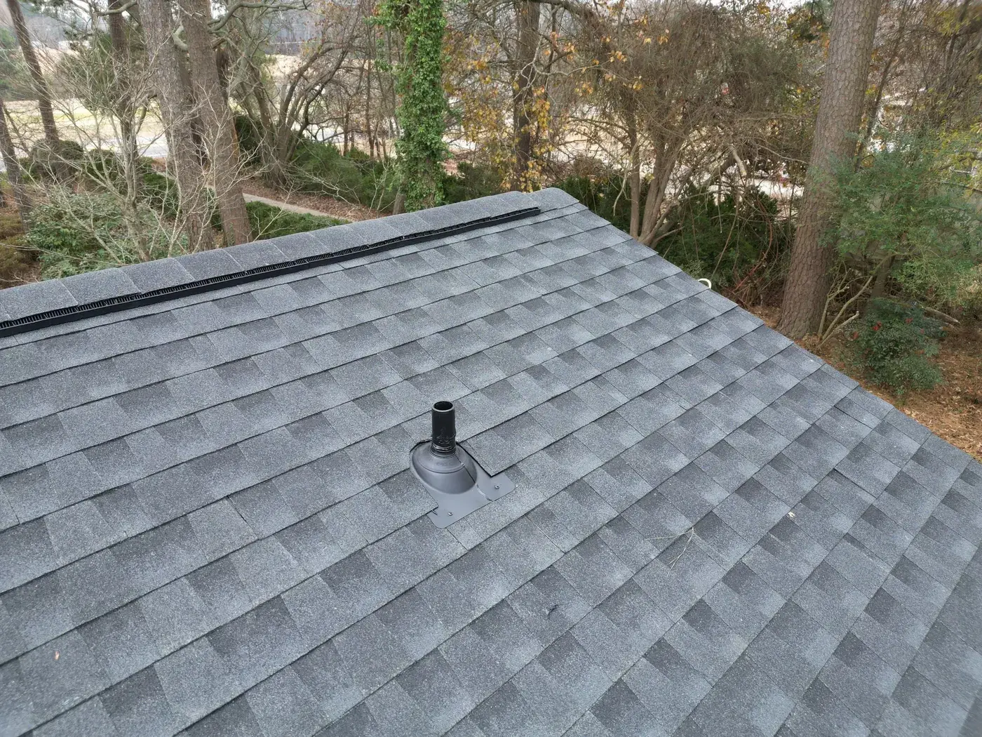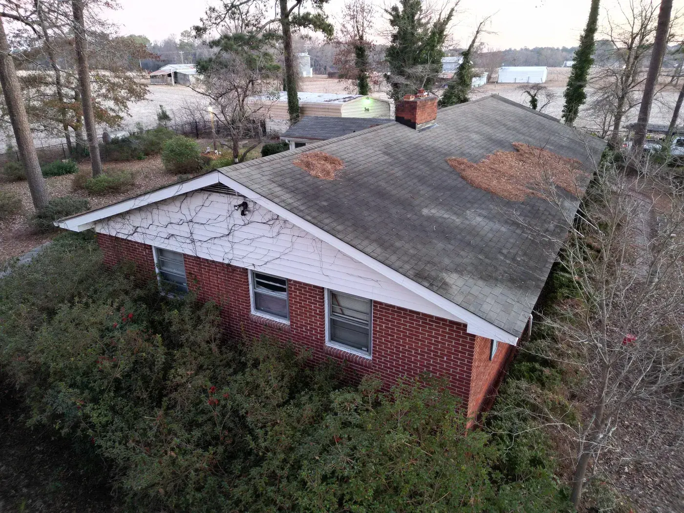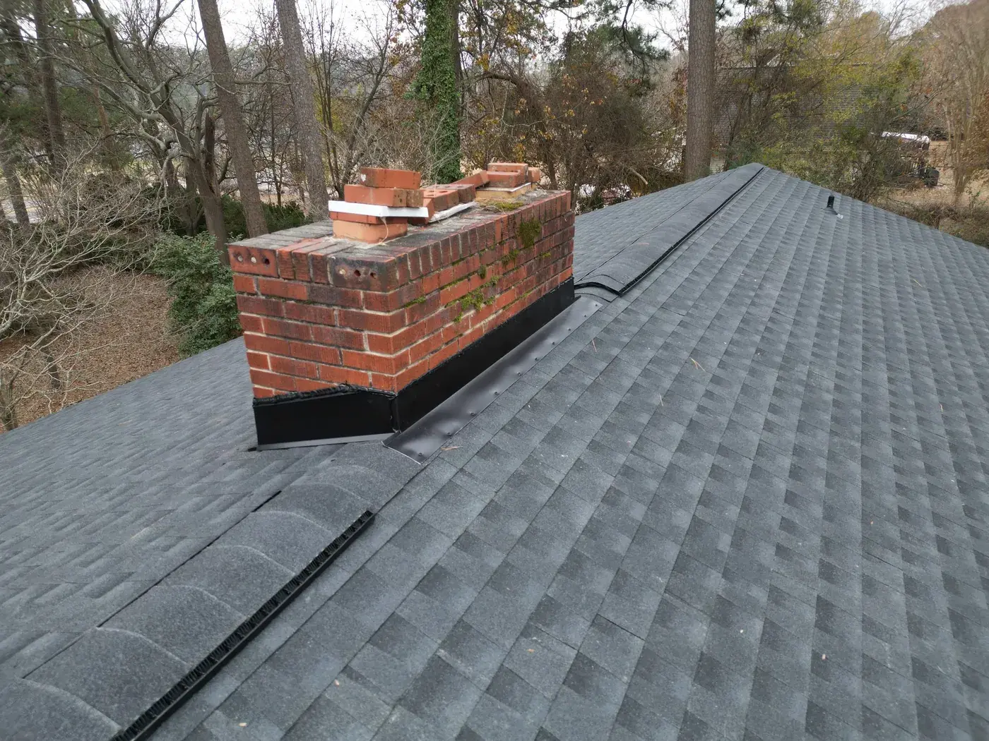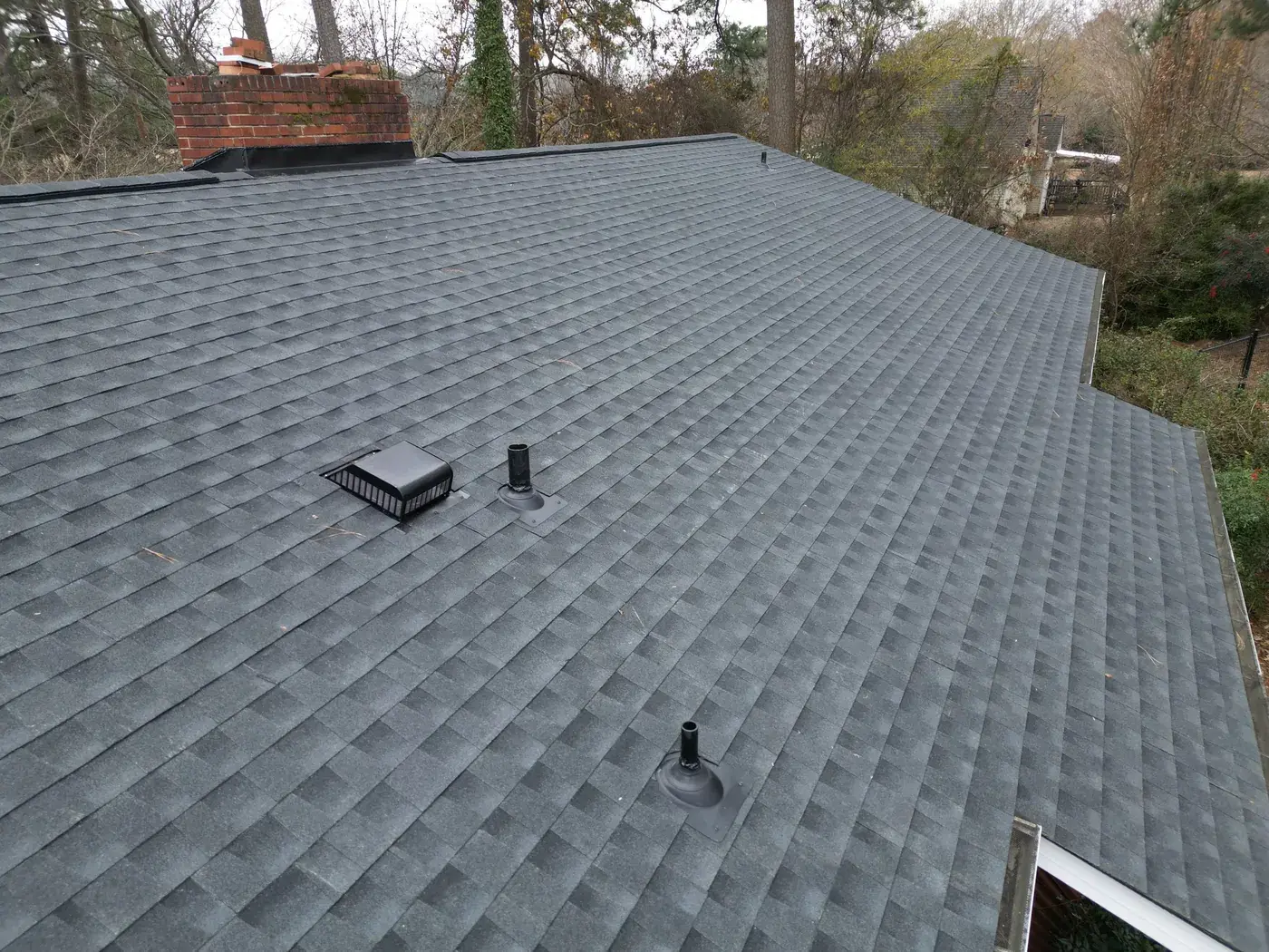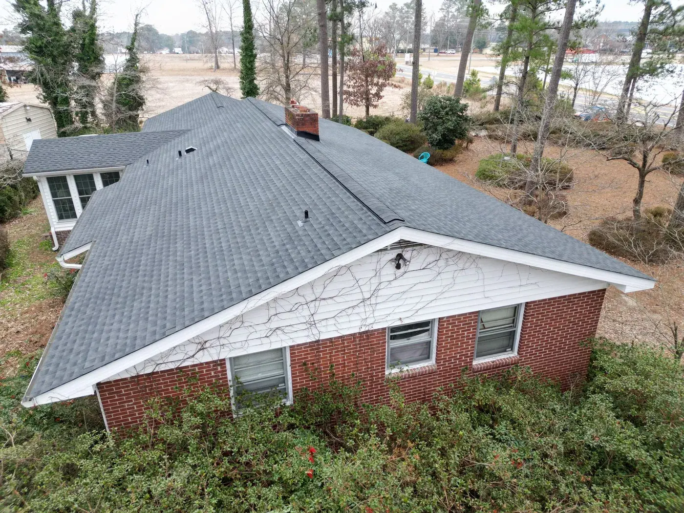 NC 210 in Angier is a single-story home with a glassed-in sun room extending off the front, a brick side chimney, and rolling pasture behind it. With the sun room tying into the main roof and the chimney needing fresh flashing, the prep on this 34-square job took its time on the transitions. We installed GAF Timberline HDZ in Charcoal. The dark color reads sharp against the white siding and gives the rural property a confident roofline that complements the open countryside behind. Total project: $14,450, completed December 2025.