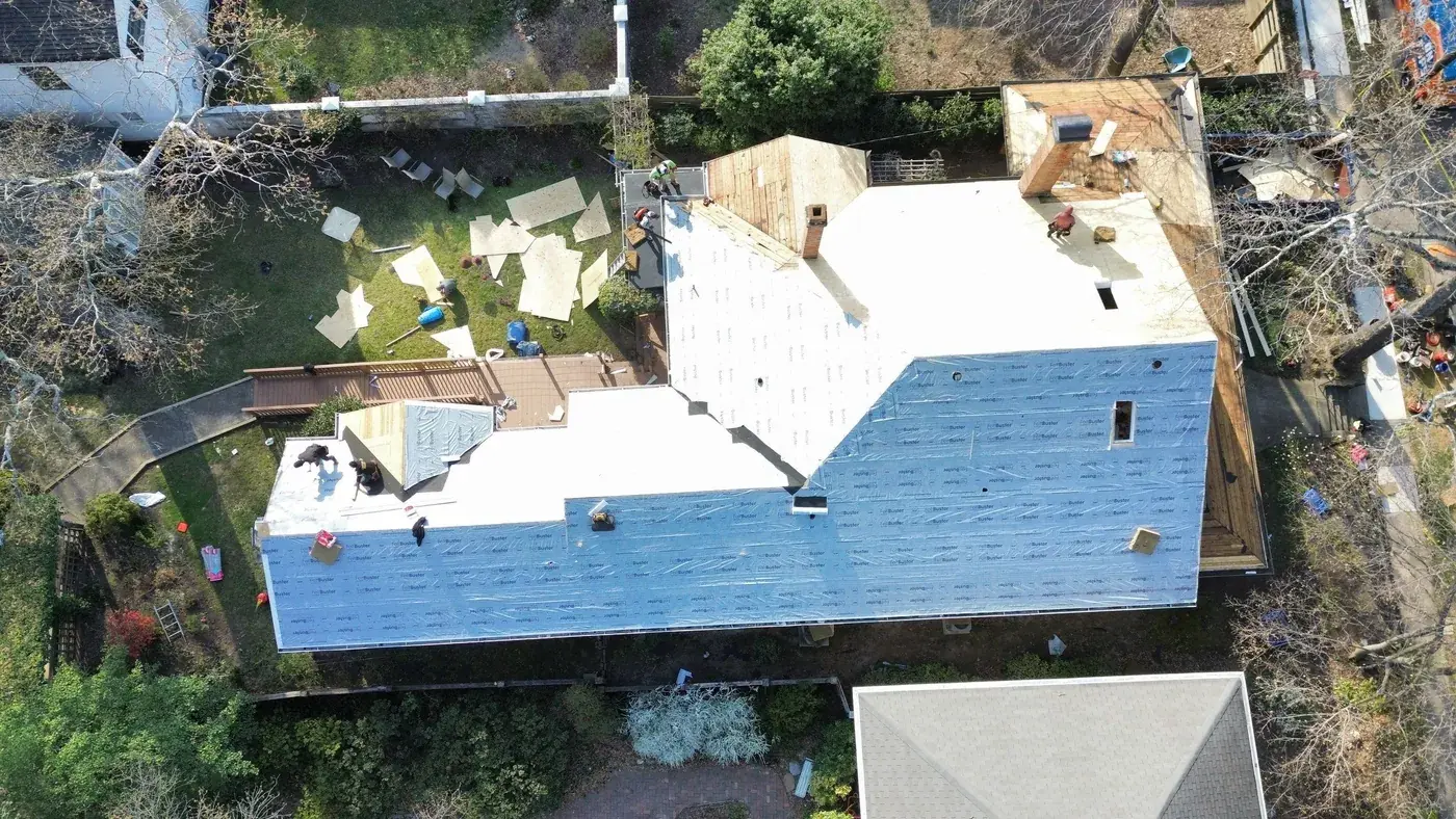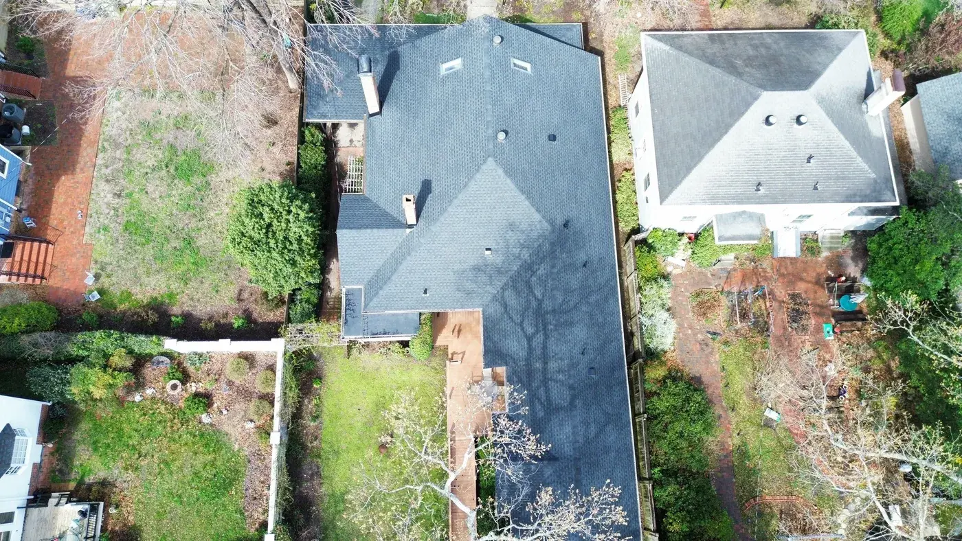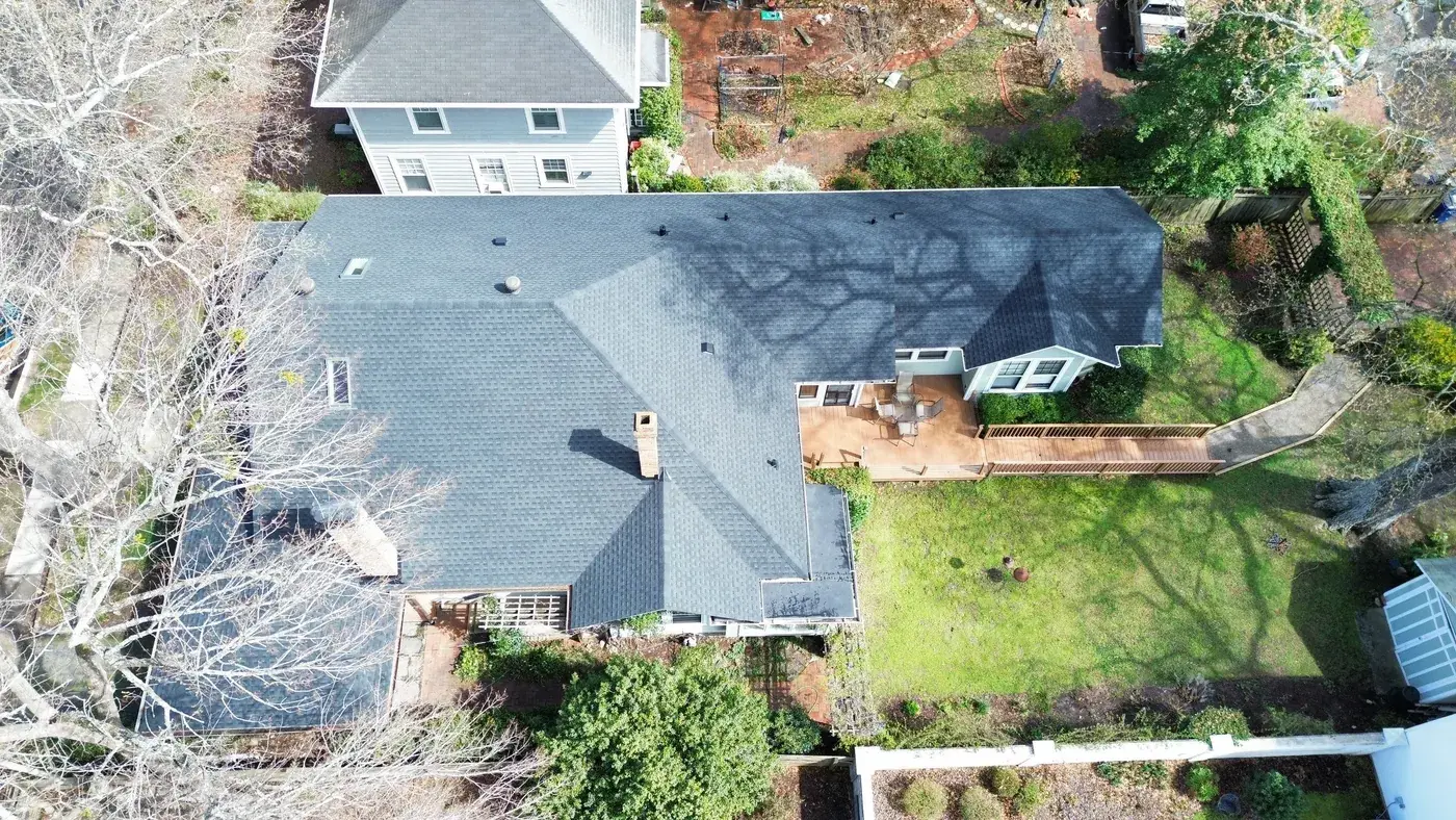 Park Dr in Raleigh is a sprawling ranch with an L-shaped footprint, a long continuous main roof, and a brick chimney rising near the center. With 49 squares of roof to lay across one large plane, the work was about consistency more than complexity, every course had to land cleanly. We installed GAF Timberline HDZ in Charcoal. The dark color anchors the long horizontal silhouette beautifully and lets the surrounding tree canopy frame it from above. Total project: $18,732.58, completed March 2025.