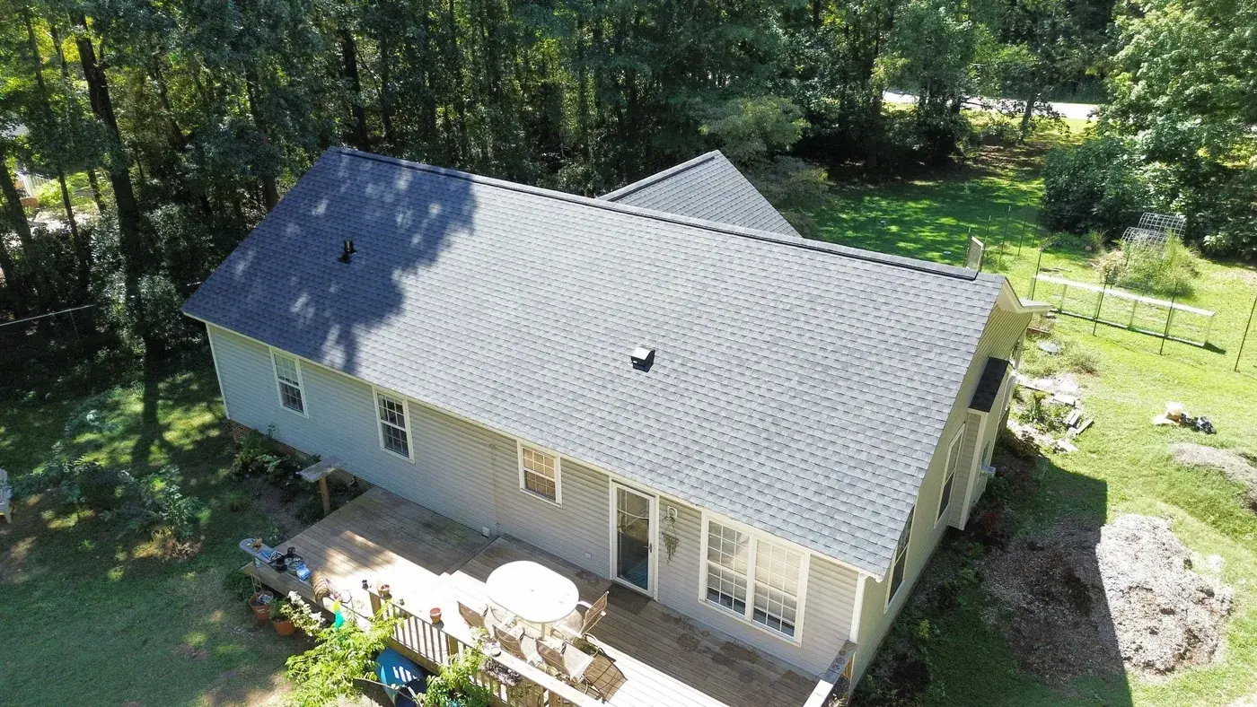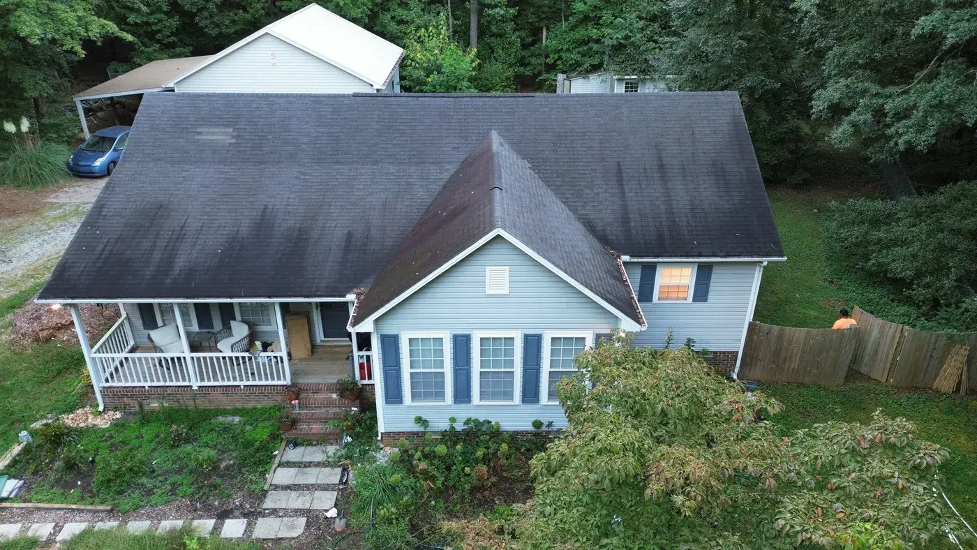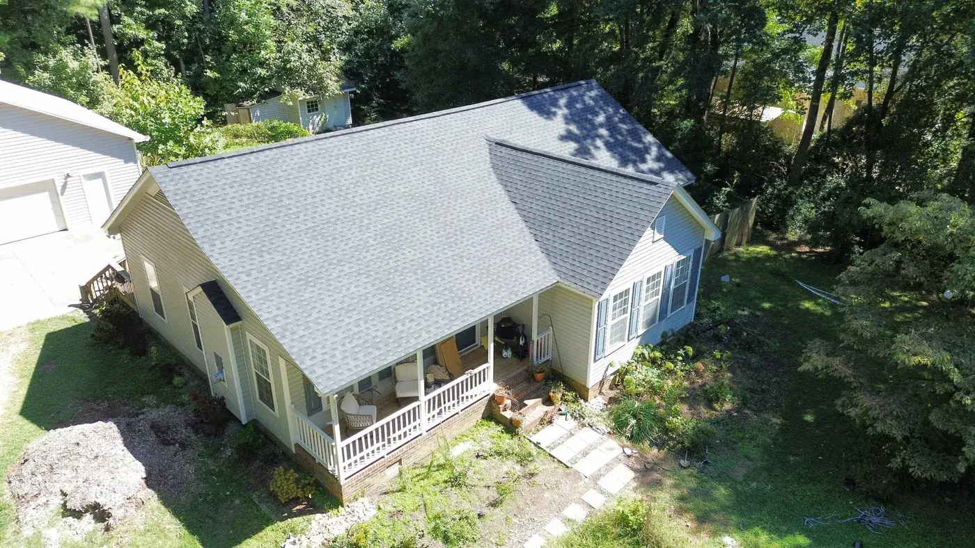 Piney Grove Church Rd in Hillsborough is a single-story home in light gray siding with blue-trim shutters, a covered front porch, and a long side wing extending off the right. The 26 squares this took had us flashing carefully where the porch gable meets the main plane and where the side wing creates a center valley. We installed GAF Timberline HDZ in Charcoal. The dark color reads sharp against the cool gray-and-blue palette and gives this welcoming country home a fresh, deliberate top. Total project: $12,250, completed September 2025.