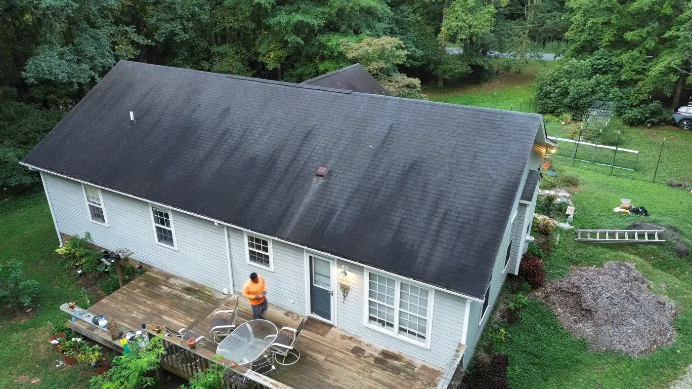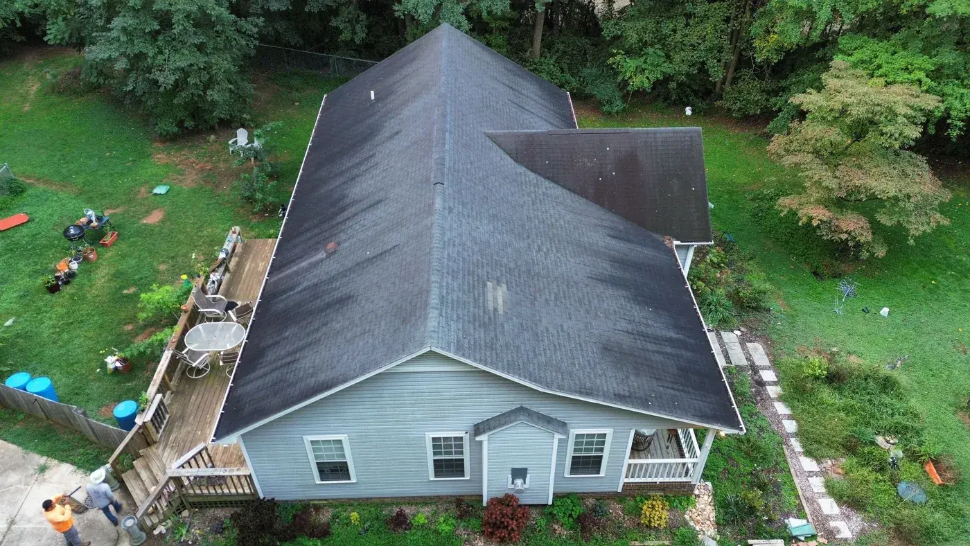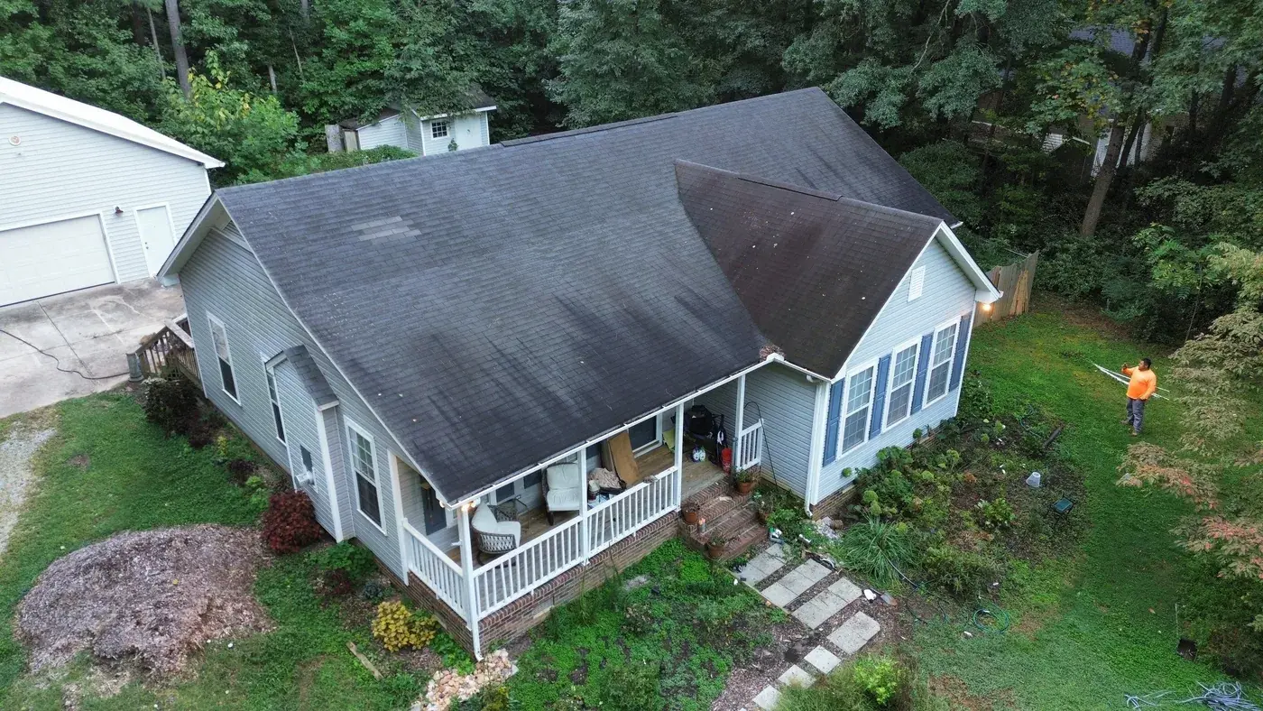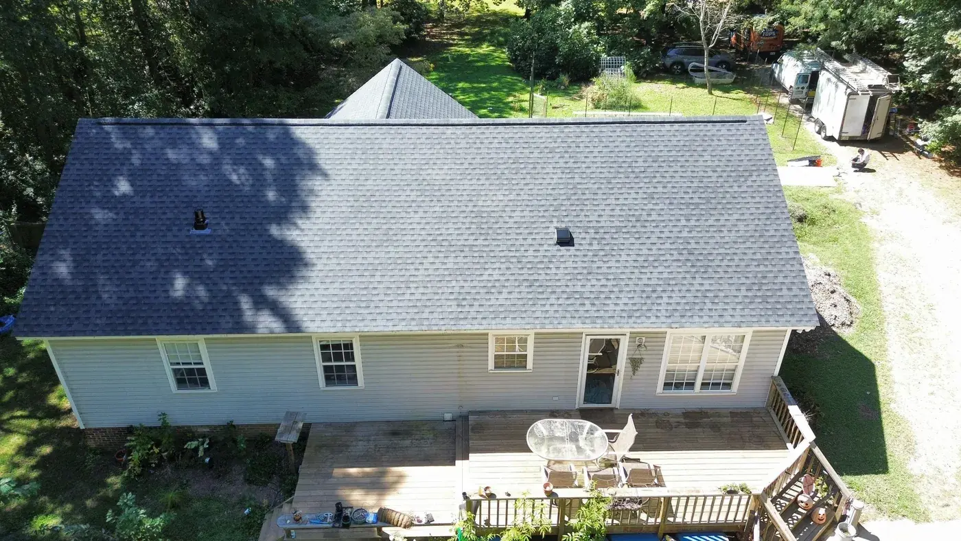 Piney Grove Church Rd in Hillsborough is a single-story home in light gray siding with blue-trim shutters, a covered front porch, and a long side wing extending off the right. The 26 squares this took had us flashing carefully where the porch gable meets the main plane and where the side wing creates a center valley. We installed GAF Timberline HDZ in Charcoal. The dark color reads sharp against the cool gray-and-blue palette and gives this welcoming country home a fresh, deliberate top. Total project: $12,250, completed September 2025.