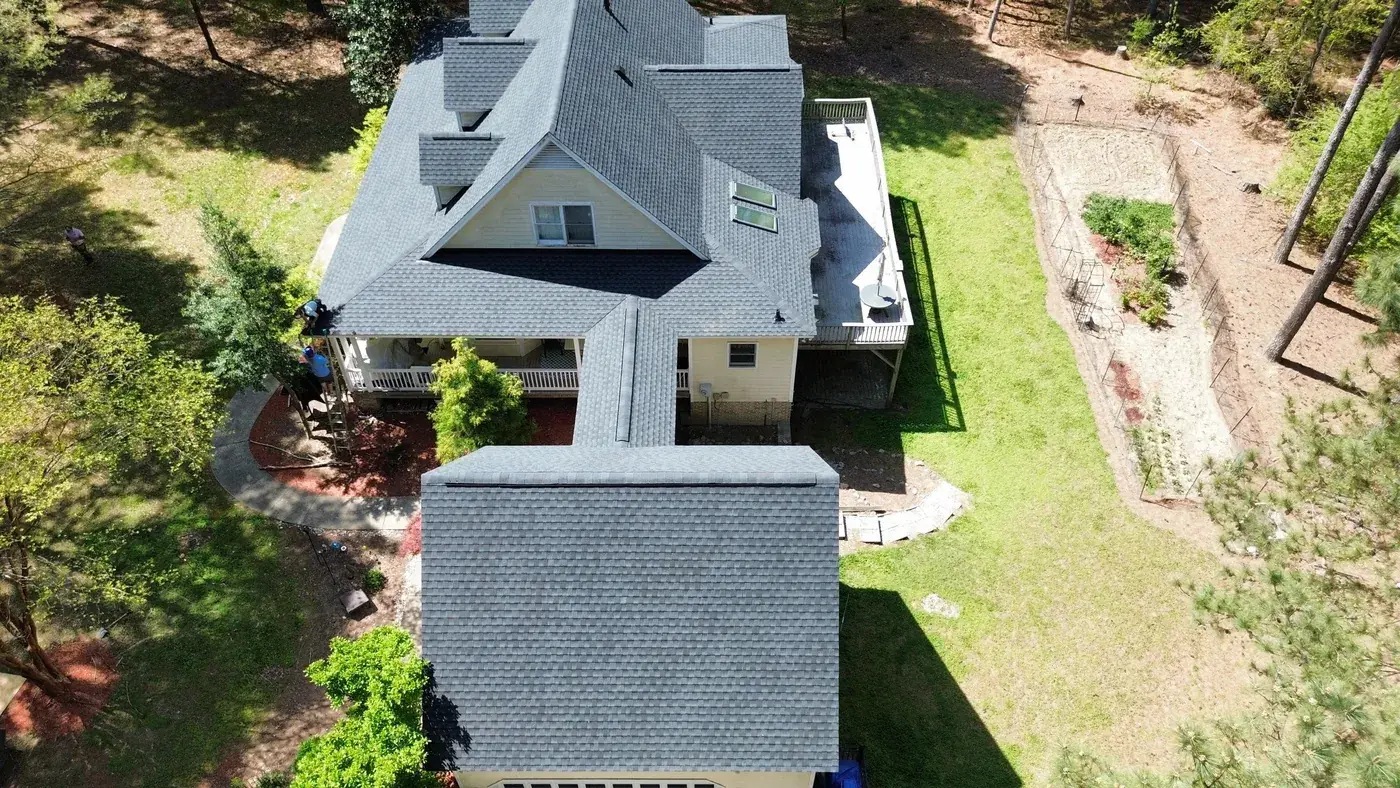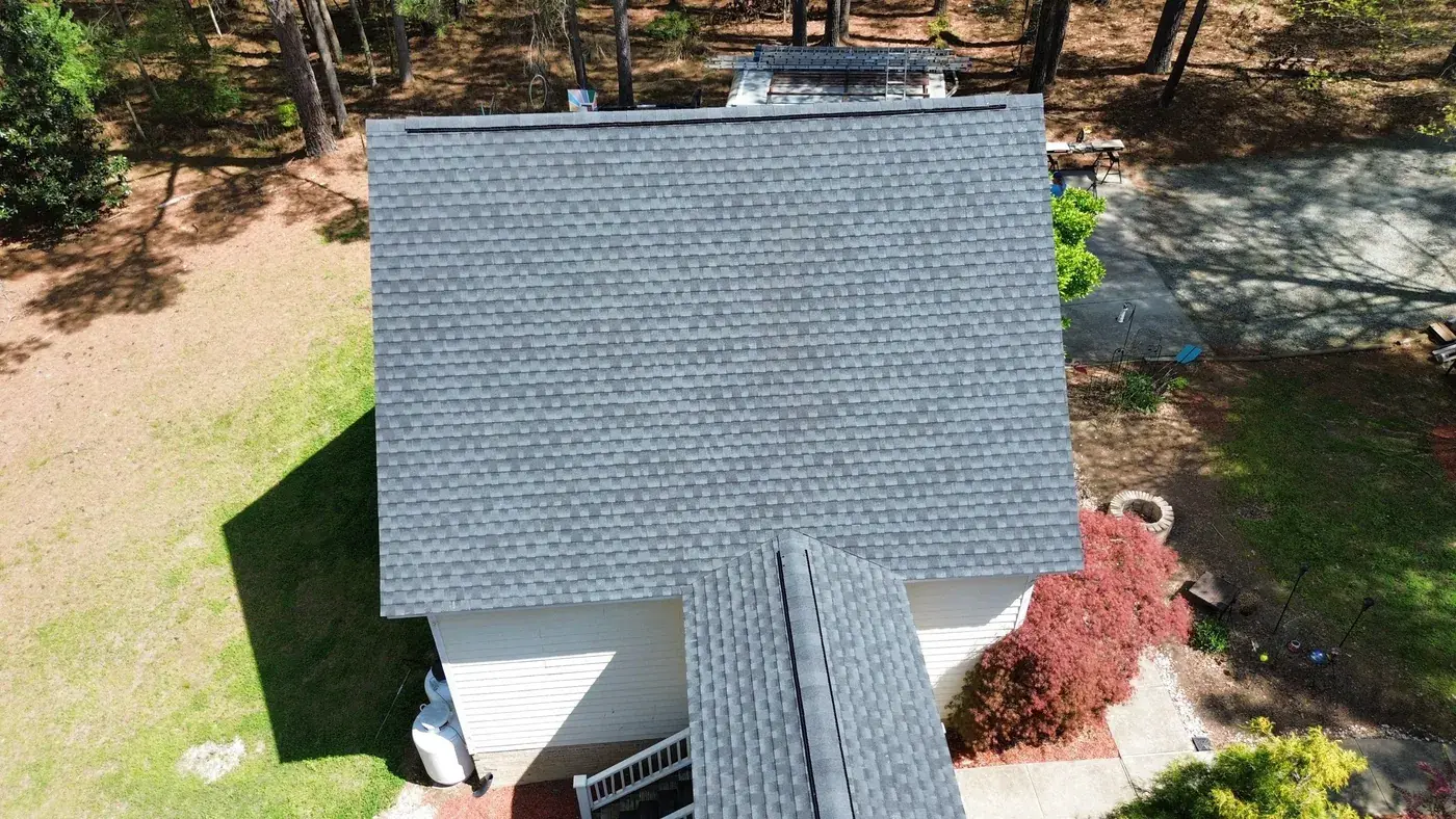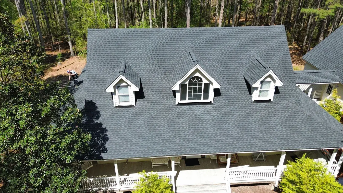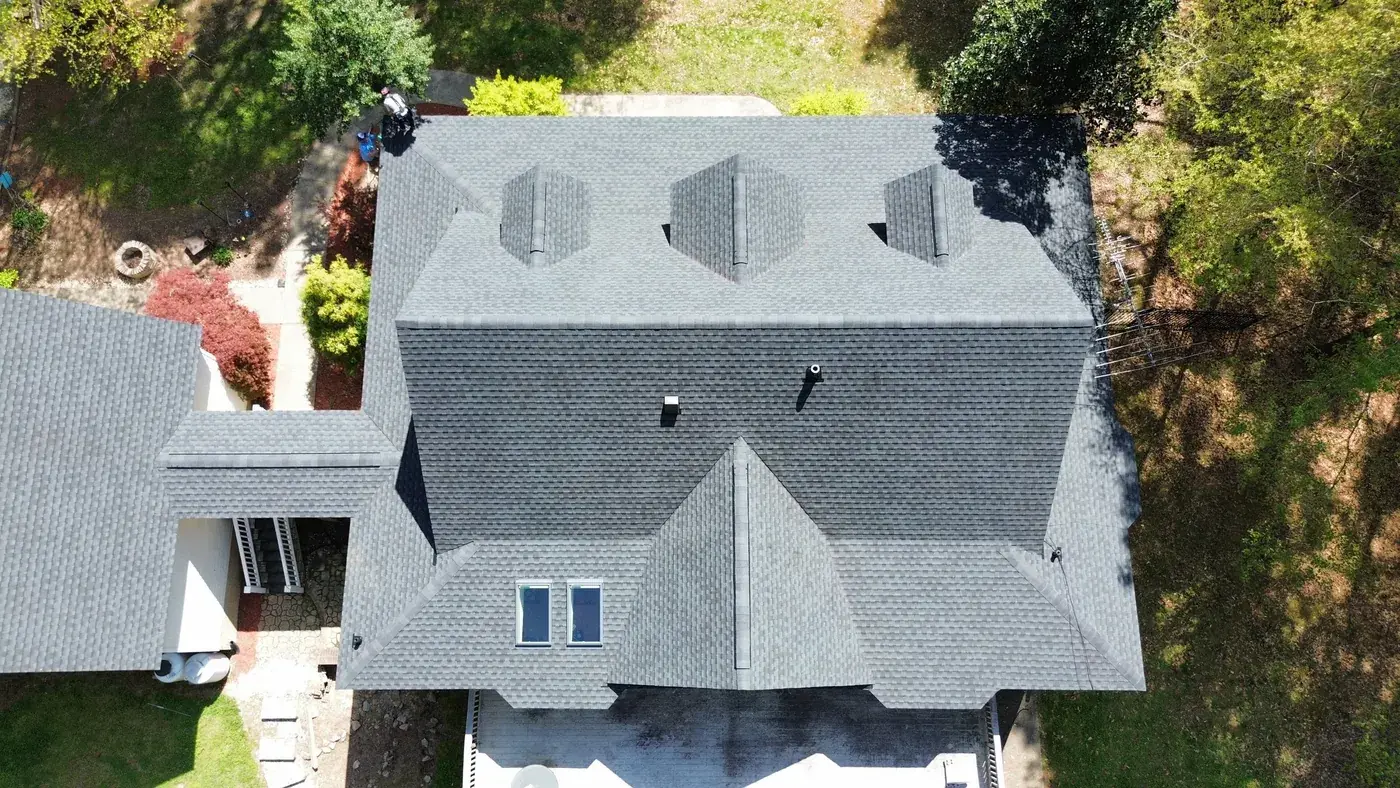 Red Maple Ct in Apex is a two-story home with one of the more layered rooflines we work on, multiple front-facing gables, a skylight cut into the front slope, and a stone patio wrapping the back. The 60 squares this took had us moving carefully through every transition, especially around the skylight curb where flashing has to be precise. We installed GAF Timberline Ultra HDZ in Charcoal. The dark color anchors the cream siding and gives the layered gable structure clean, deliberate lines. Total project: $32,450, completed April 2026.