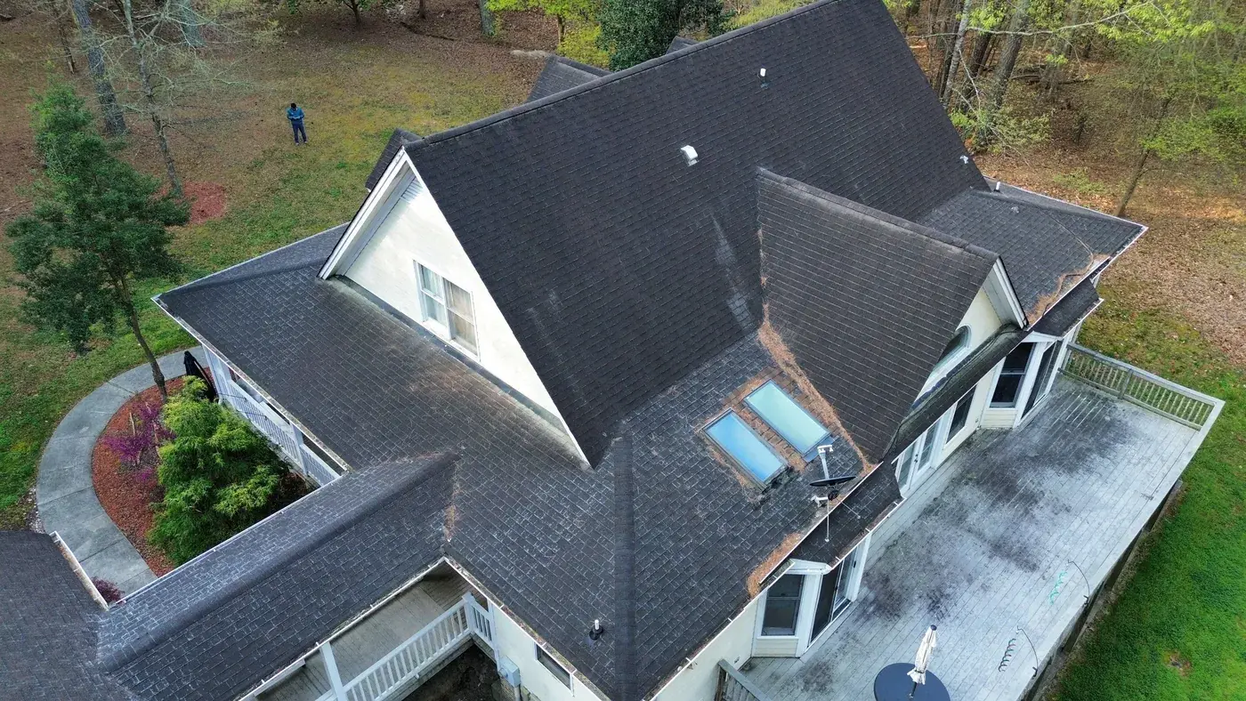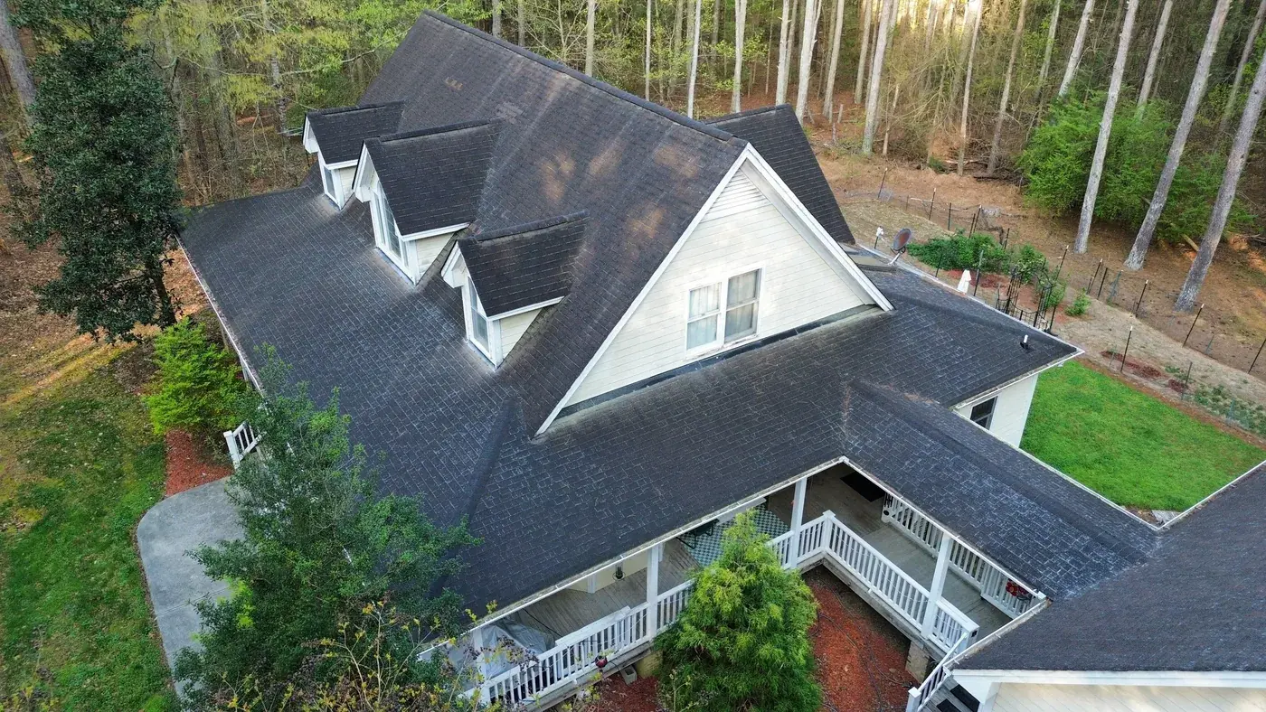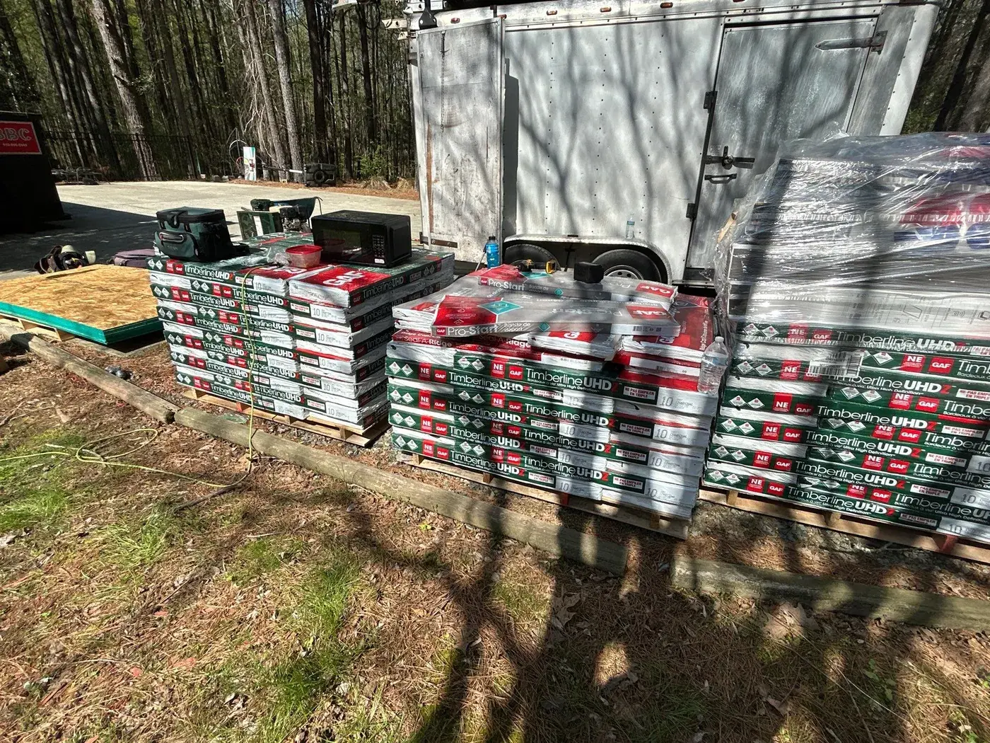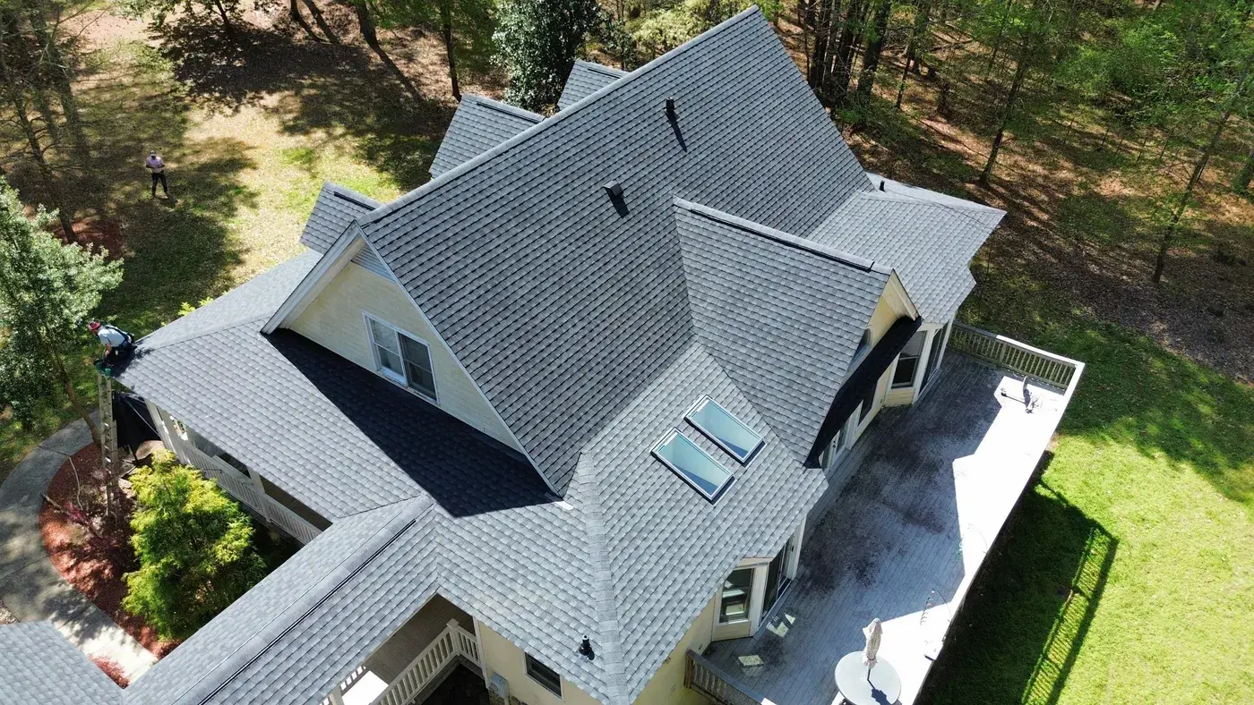 Red Maple Ct in Apex is a two-story home with one of the more layered rooflines we work on, multiple front-facing gables, a skylight cut into the front slope, and a stone patio wrapping the back. The 60 squares this took had us moving carefully through every transition, especially around the skylight curb where flashing has to be precise. We installed GAF Timberline Ultra HDZ in Charcoal. The dark color anchors the cream siding and gives the layered gable structure clean, deliberate lines. Total project: $32,450, completed April 2026.